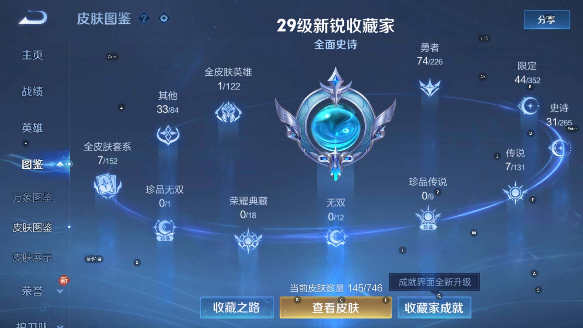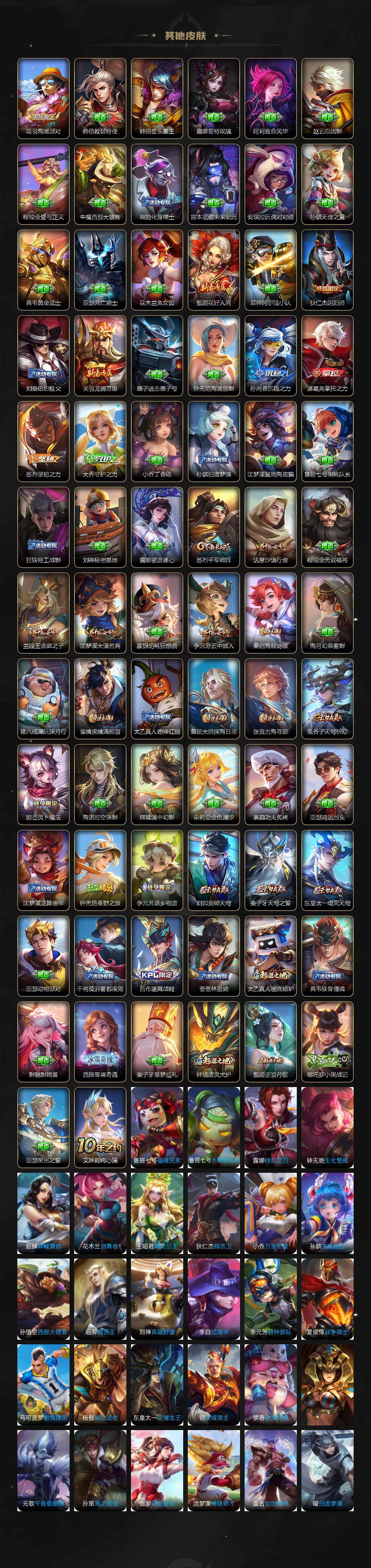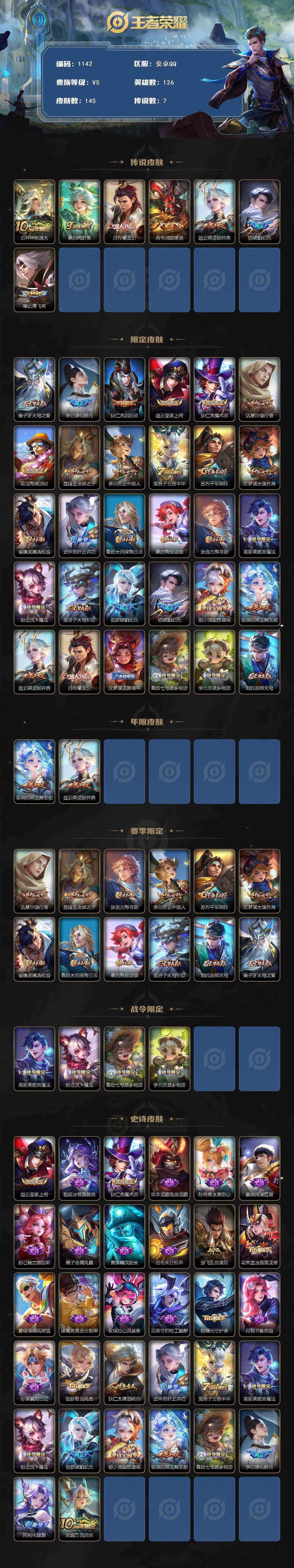 126英雄-145皮肤-贵族5/皮肤145/传说7/史诗31/英雄126/影全皮/神树通天 后羿/鸣野蒿 桑启/曦玄引 吕布/战鼓燎原 典韦/乘龙·铭钟鼎 赵云/琥珀纪元 铠/云鹰飞将 曜/天穹之誓 姜子牙/谪仙醉月 李白/阴阳师 狄仁杰/皇家上将 赵云/魔术师 狄仁杰/沙漠行僧 达摩/海滩派对 项羽/金庭之子 兰陵王/云中旅人 李元芳/五谷丰年 鬼谷子/千军破阵 苏烈/大漠名商 沈梦溪/擒涛扼浪 裴擒虎/纤云弄巧
