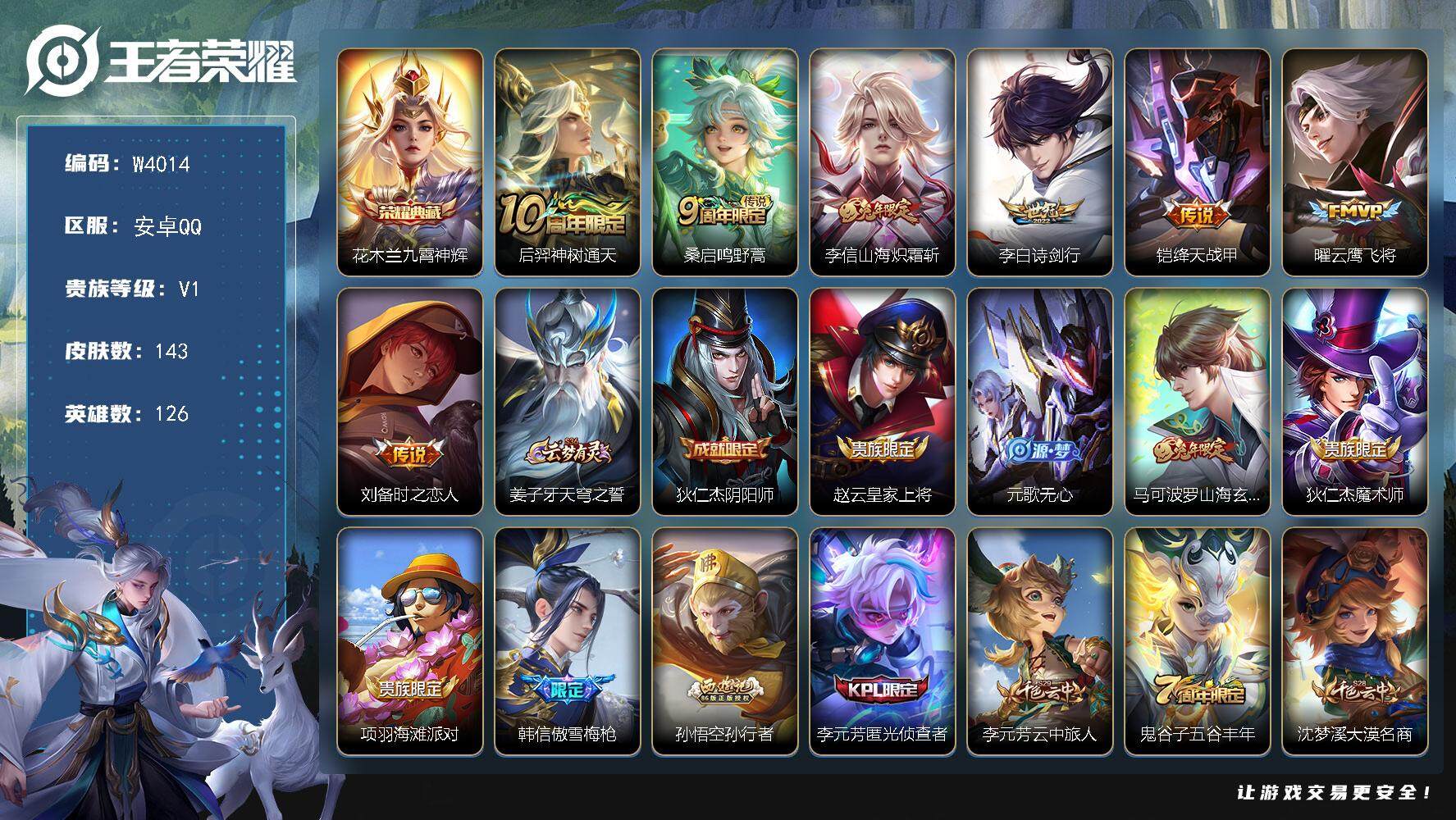 126英雄-143皮肤-【w4014】安卓qq-有二次-贵7-126英雄-143皮肤-1典藏-7传说-41限定-8按键-灵宝-3印记-3.4万贵族积分-营地-热门皮肤-花木兰九霄神辉,李信山海·炽霜斩,李白诗剑行,铠绛天战甲,曜云鹰飞将,刘备时之恋人,赵怀真鹤归松栖,马可波罗山海·玄木吟,韩信傲雪梅呛,孙悟空孙行者