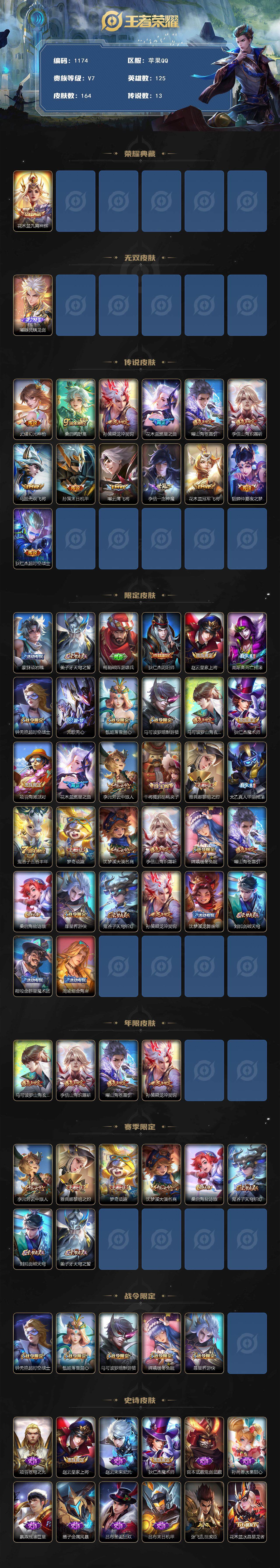 125英雄-164皮肤-【mj秒换绑 金标李信 万战李信 万战金标李信 164皮肤 银标孙策 银标花木兰 银标曜 村标马克 发育路26段 打野22段 1典藏1无双 13传说 v7-20按键】苹果q-v7-最强王者段位-125英雄-164皮肤-1典藏皮肤-1无双-13传说-41史诗 【英雄全皮】:李信全皮,空空儿全皮,影全皮 【荣耀典藏】:花木兰九霄神辉 【无双皮肤】:曜器灵螭龙剑 【传说皮肤】:云缨幻光神呛,桑启