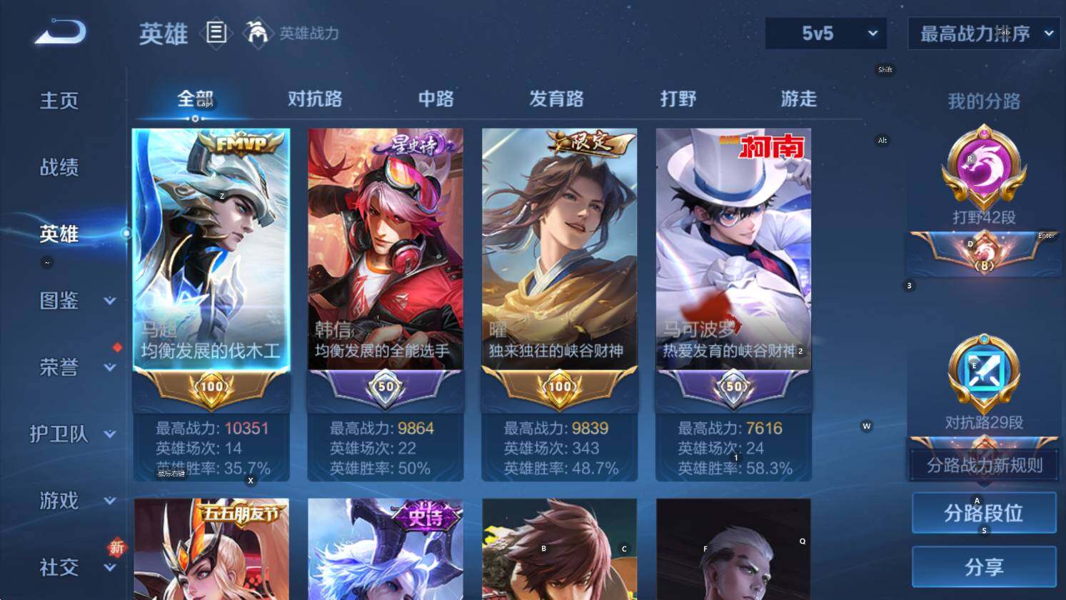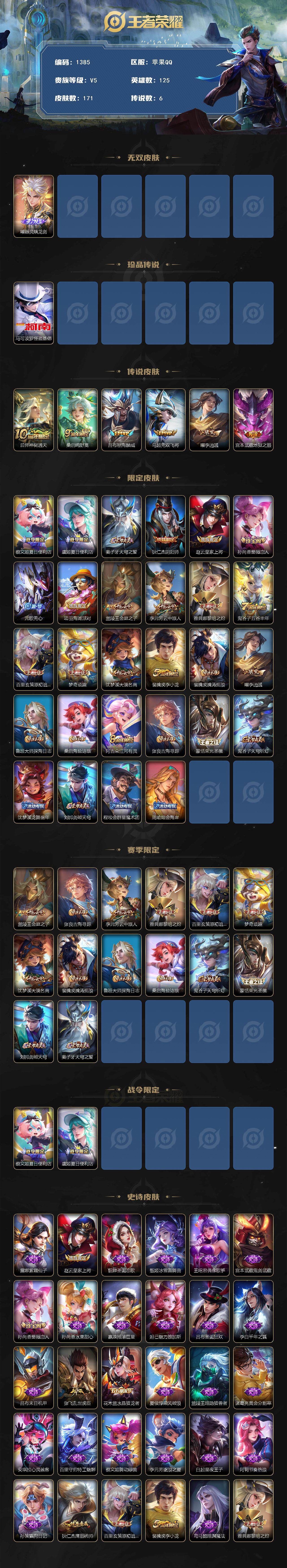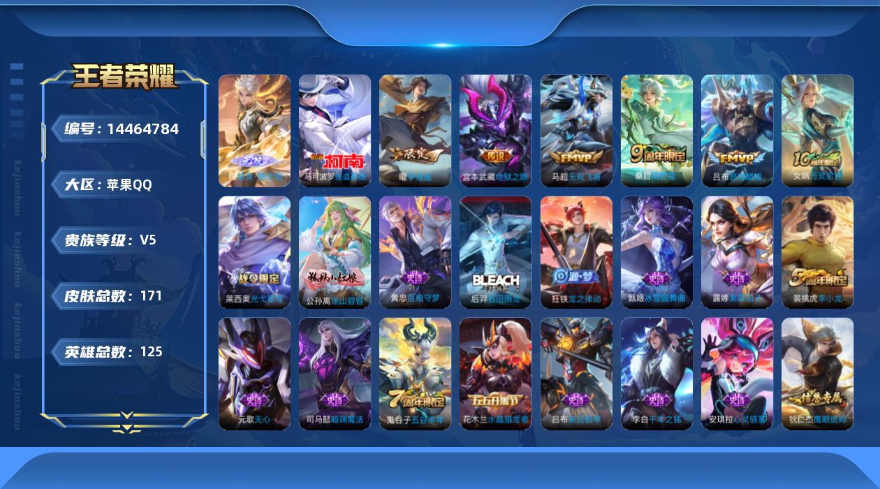 [14464784]可二次 贵族5-金标马超、曜-171皮-0典藏-6传说-1无双-1珍品传说-3英雄全皮-1改名卡 苹果手q122区 营地id1785107438荣耀王者【珍品传说皮肤】:怪盗基德【无双皮肤】:器灵·螭龙剑【优质限定皮肤】:无双飞将【传说皮肤】:神树通天地狱之眼鸣野蒿怒海麟威无双飞将李 【史诗皮肤】:乱世虎臣紫霞仙子龙之律动光弋星穹万灵启世末日机甲暗渊