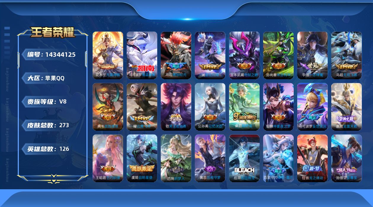 126英雄-273皮肤-v8 1典藏 1珍品传说 16传说 126英雄 273皮肤 可修改实名 【英雄全皮】:影全皮戈娅全皮 【稀有英雄】:敖隐小龙人大司命嬴政始皇帝韩信韩跳跳夏洛特夏师傅艾琳橘右京橘子娜可露露鸟人不知火舞赵云金蝉唐僧戈娅 【荣耀水晶】:九霄神辉木兰典