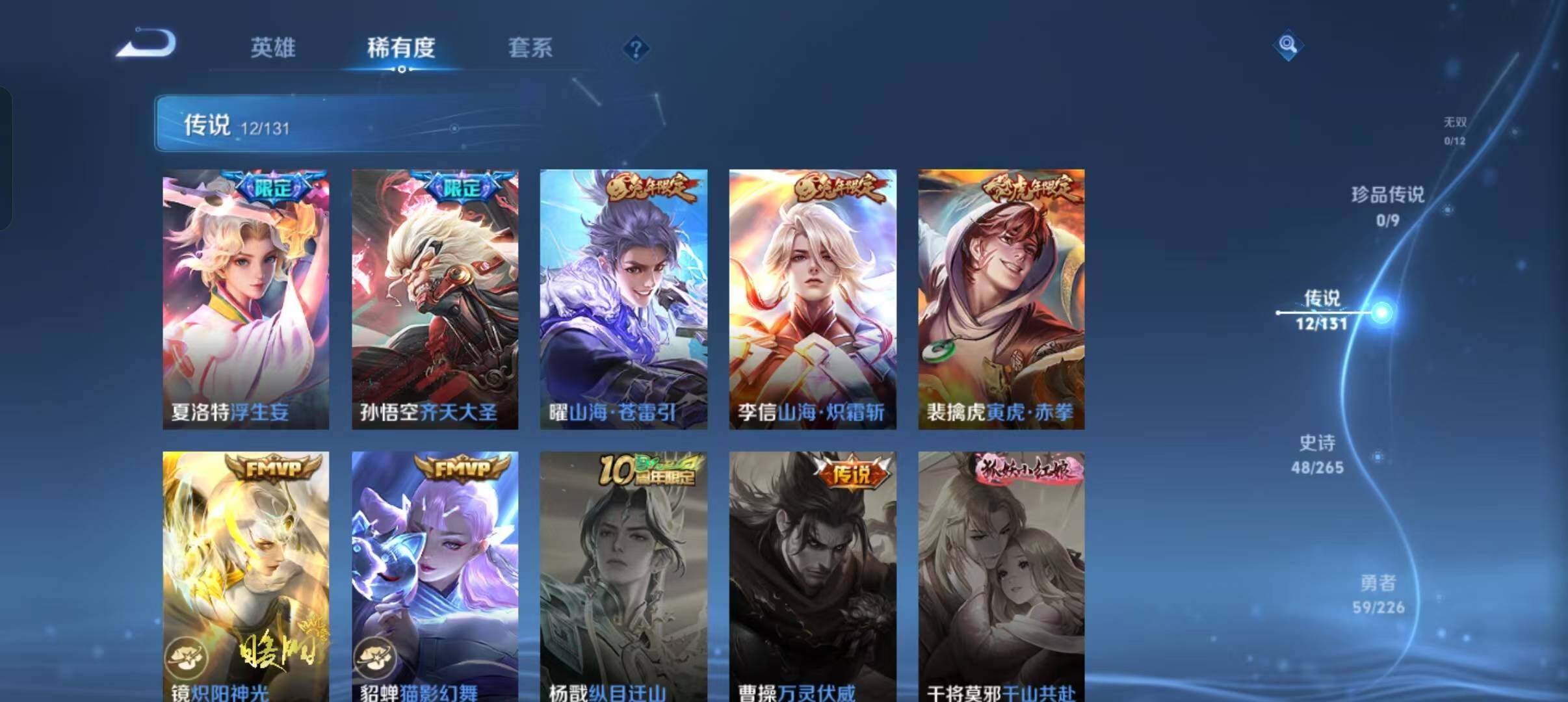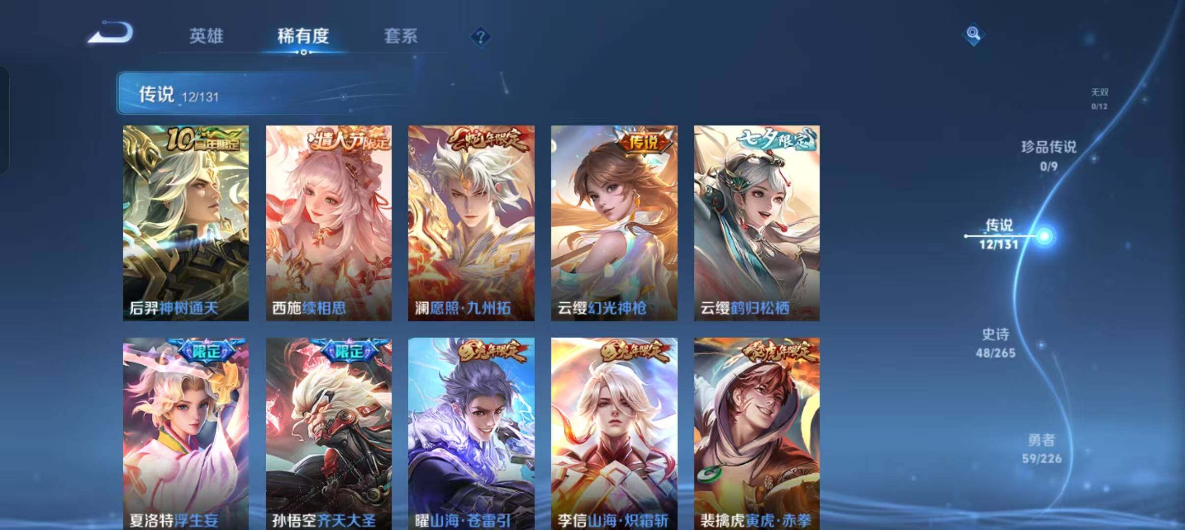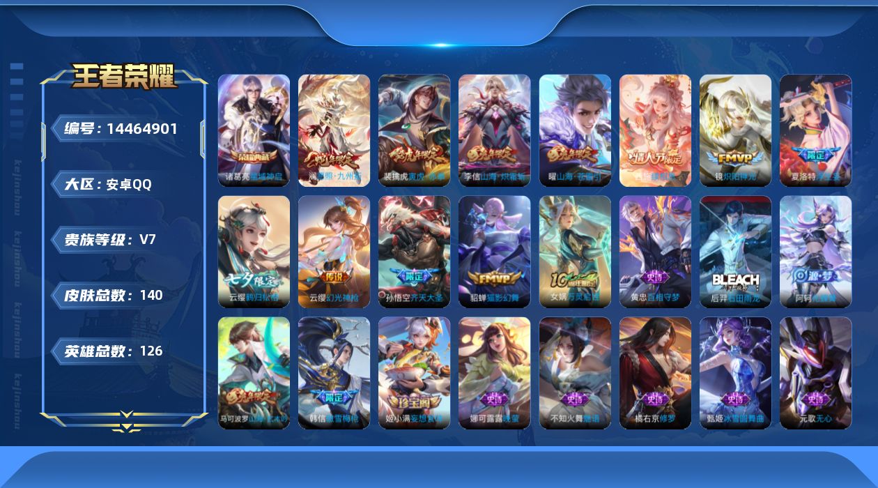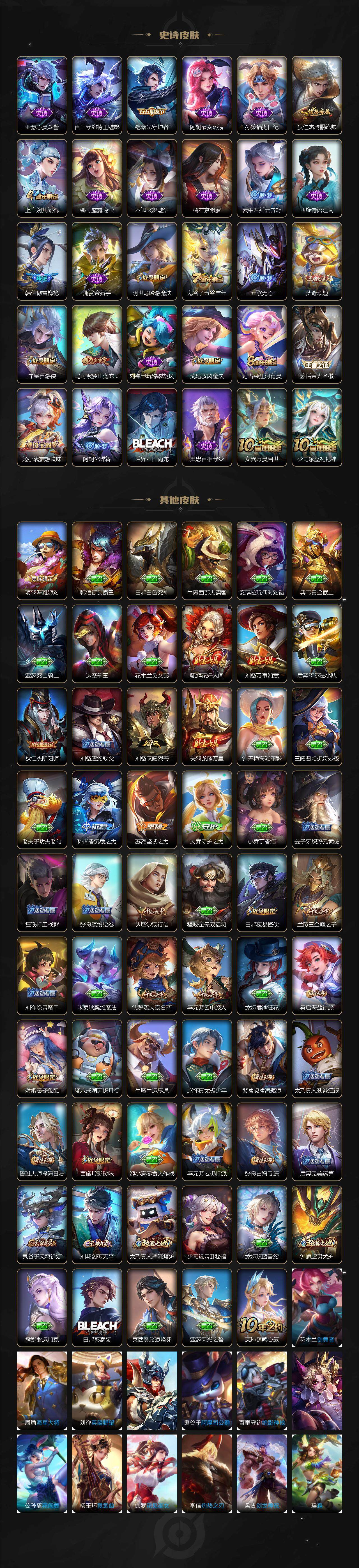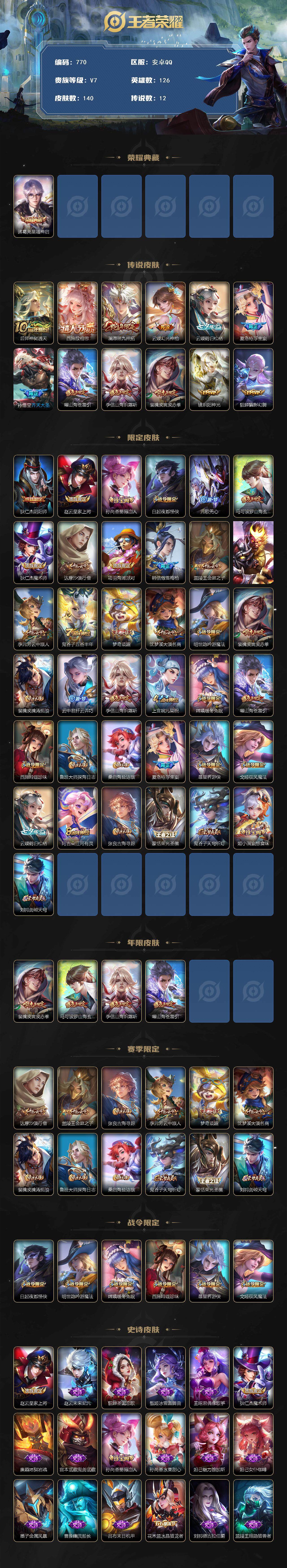 [14464901]v7-最强王者段位-126英雄-140皮肤-1典藏皮肤-12传说-48史诗ll5439 【英雄全皮】:戈娅全皮 【荣耀典藏】:诸葛亮星域神启 【传说皮肤】:后羿神树通天,西施续相思,澜愿照九州拓,云缨幻光神呛,云缨鹤归松栖,夏洛特浮生妄,孙悟空齐天大圣,曜山海苍雷引,李信山海炽霜斩,裴擒虎寅虎赤拳,镜炽阳神光,貂蝉猫影幻舞 【限定皮肤】:狄仁杰阴阳师,赵云皇家上将,孙尚香蔷薇恋人,白起夜都怪侠,元歌无心,马可波罗山海玄木吟,狄仁杰魔术师,达摩沙漠行僧,项羽海滩派对,韩信傲雪梅呛,兰陵王金庭之子,孙悟空齐天大圣,李元芳云中旅人,鬼谷子五谷丰年,梦奇顽趣,沈梦溪大漠名商,明世隐吟游魔法,裴擒虎寅虎赤拳,裴擒虎擒涛扼浪,云中君纤云弄巧,李信山海炽霜斩,上官婉儿梁祝,嫦娥暖冬兔眠,曜山海苍雷引,西施玲珑珍味,鲁班大师探海日志,桑启海盐诗旅,夏洛特浮生妄,暃星界游侠,戈娅驭风魔法,云缨鹤归松栖,阿古朵江河有灵,张良古海寻踪,蒙恬荣光圣徽,鬼谷子天穹祈灯,姬小满妄想食味,刘邦剑破天穹 【年限皮肤】:裴擒虎寅虎赤拳,马可波罗山海玄木吟,李信山海炽霜斩,曜山海苍雷引 【赛季限定】:达摩沙漠行僧,兰陵王金庭之子,张良古海寻踪,李元芳云中旅人,梦奇顽趣,沈梦溪大漠名商,裴擒虎擒涛扼浪,鲁班大师探海日志,桑启海盐诗旅,鬼谷子天穹祈灯,蒙恬荣光圣徽,刘邦剑破天穹 【战令限定】:白起夜都怪侠,明世隐吟游魔法,嫦娥暖冬兔眠,西施玲珑珍味,暃星界游侠,戈娅驭风魔法 【史诗皮肤】:赵云皇家上将,赵云未来纪元,貂蝉圣诞恋歌,甄姬冰雪圆舞曲,王昭君偶像歌手,狄仁杰魔术师,廉颇地狱岩魂,宫本武藏鬼剑武藏,孙尚香蔷薇恋人,孙尚香水果甜心,妲己魅力维加斯,妲己女仆咖啡,墨子金属风暴,曹操幽灵船长,吕布末日机甲,花木兰水晶猎龙者,刘邦德古拉伯爵,兰陵王暗隐猎兽者,亚瑟心灵战警,百里守约特工魅影,铠曙光守护者,阿轲节奏热浪,孙策猫狗日记,狄仁杰鹰眼统帅,上官婉儿梁祝,娜可露露晚萤,不知火舞魅语,橘右京修罗,云中君纤云弄巧,西施诗语江南,韩信傲雪梅呛,澜赏金猎手,明世隐吟游魔法,鬼谷子五谷丰年,元歌无心,梦奇顽趣,暃星界游侠,马可波罗山海玄木吟,刘禅电玩爆裂旋风,戈娅驭风魔法,阿古朵江河有灵,蒙恬荣光圣徽,姬小满妄想食味,阿轲化蝶舞,后羿石田雨龙,黄忠百相守梦,女娲万灵启世,少司缘巫礼祀神 【其他皮肤】:项羽海