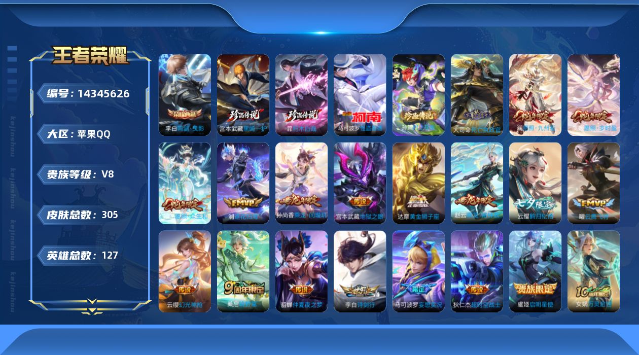 127英雄-305皮肤-v7 1典藏 4珍品传说 19传说 127英雄 305皮肤 可修改实名 【英雄全皮】:云缨全皮大司命全皮影全皮苍全皮 【稀有英雄】:敖隐小龙人大司命嬴政始皇帝韩信韩跳跳夏洛特夏师傅艾琳橘右京橘子娜可露露鸟人不知火舞赵云金蝉唐僧戈娅 【荣耀水晶