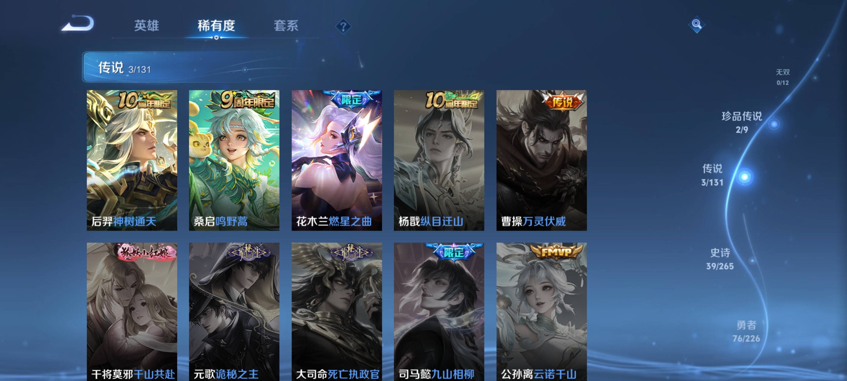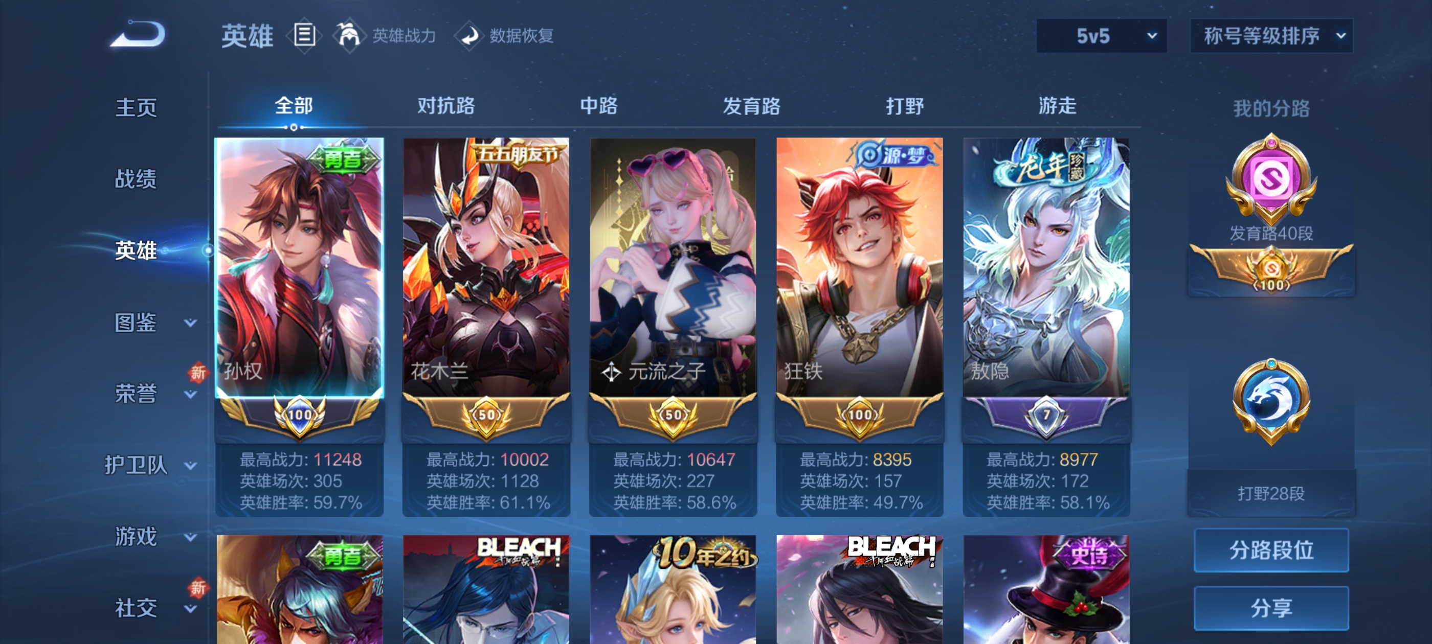 贵族v6 148皮 小国标孙权1.1w战力 金标花木兰1w战力 金标元流之子1w战力 金标狂铁 2珍品传说(朽木白哉,黑崎一护)3传说 燃星之曲,神树通天,鸣野蒿