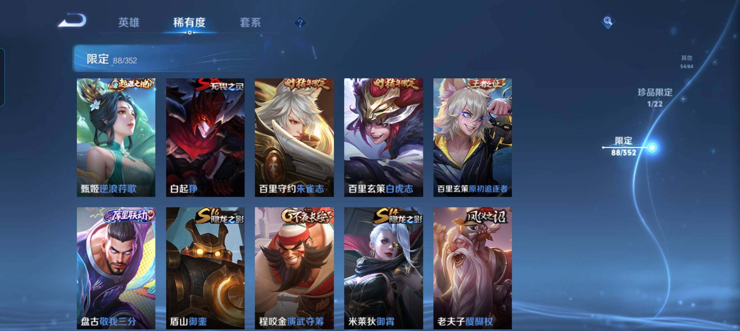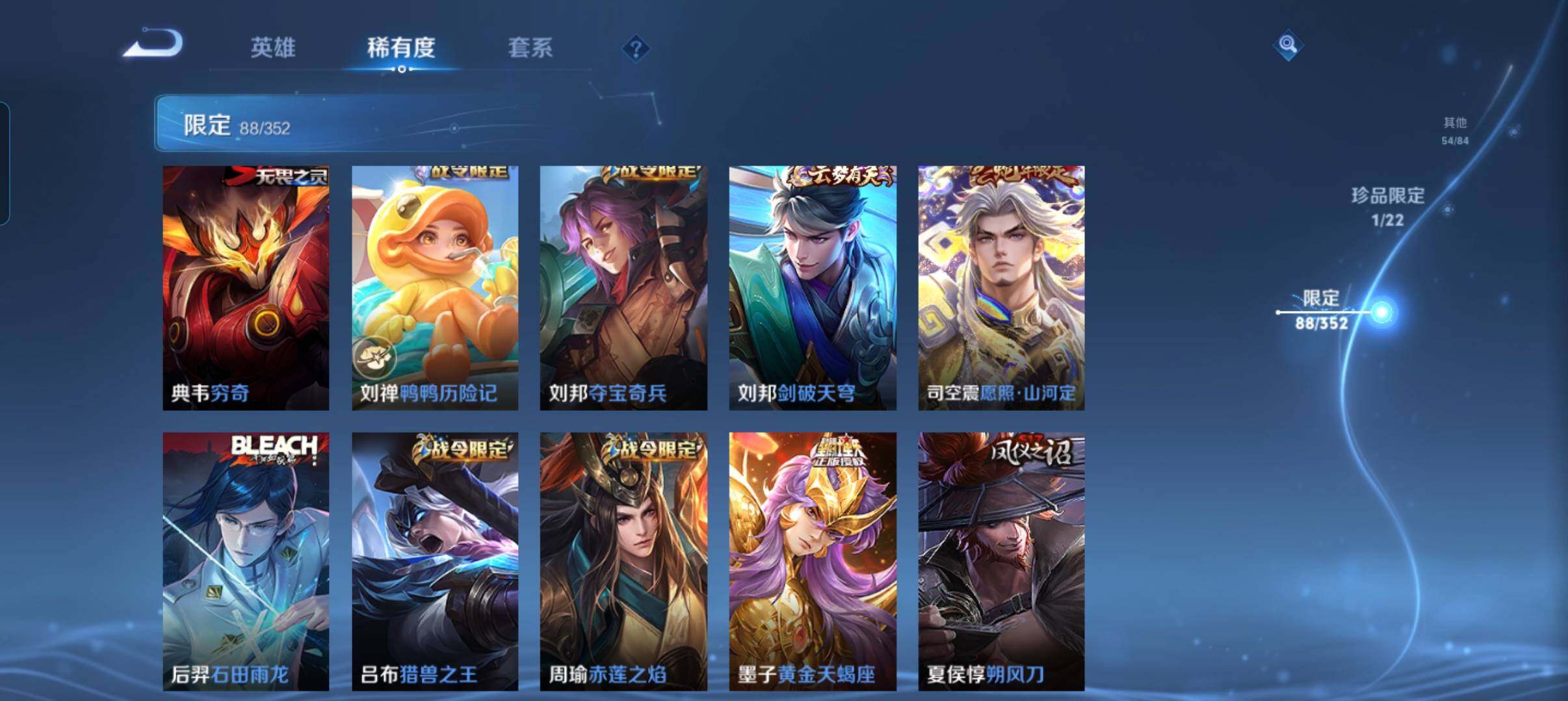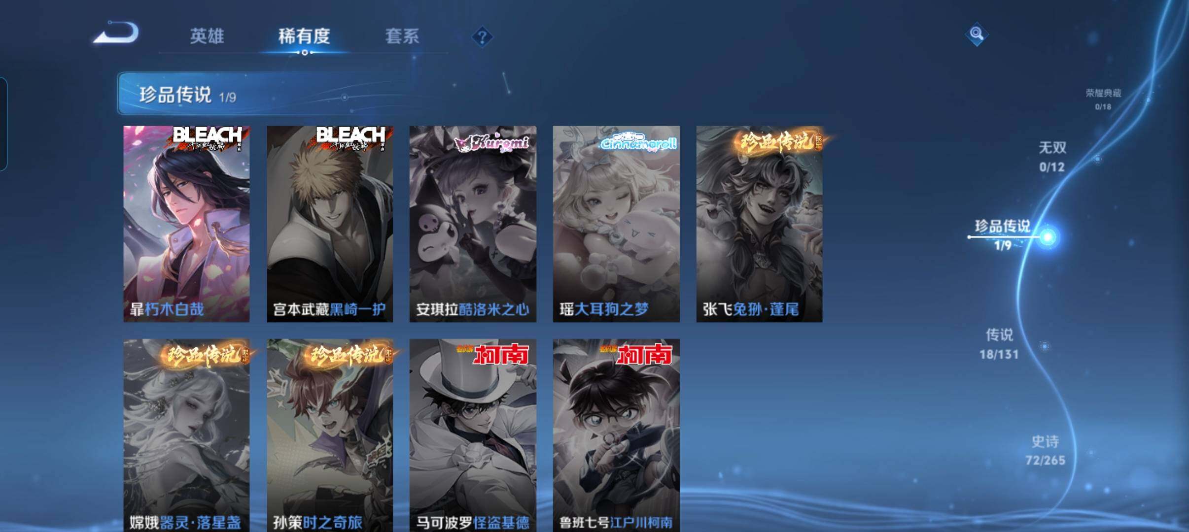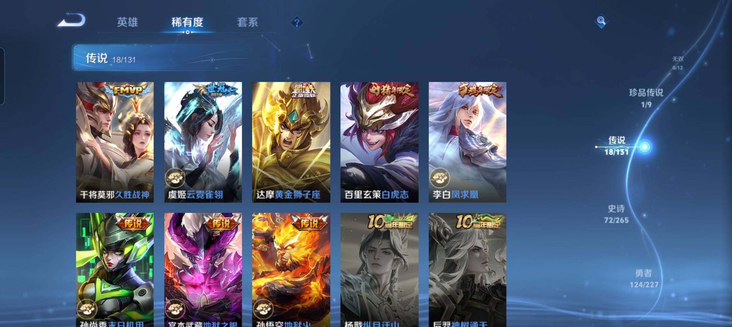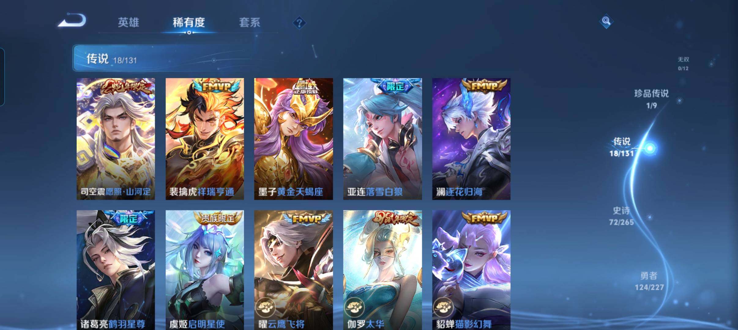 127英雄-269皮肤-账号亮点:暃朽木白哉 司空震愿照山河定,裴擒虎祥瑞亨通,墨子黄金天蝎座,亚连落雪白狼,澜逐花归海,诸葛亮鹤羽星尊,虞姬启明星使,曜云鹰飞将,伽罗太华,貂蝉猫影幻舞,干将莫邪久胜战神,虞姬云霓雀翎,达摩黄金狮子座,百里玄策白虎志,李白凤求凰,孙尚香末日机甲,宫本武藏地狱之眼,孙悟空地狱火470 【英雄全皮】:影全皮 【珍品传说】:暃朽木白哉 【传说皮肤】:司空震愿照山河定,裴擒虎祥瑞亨通,墨子黄