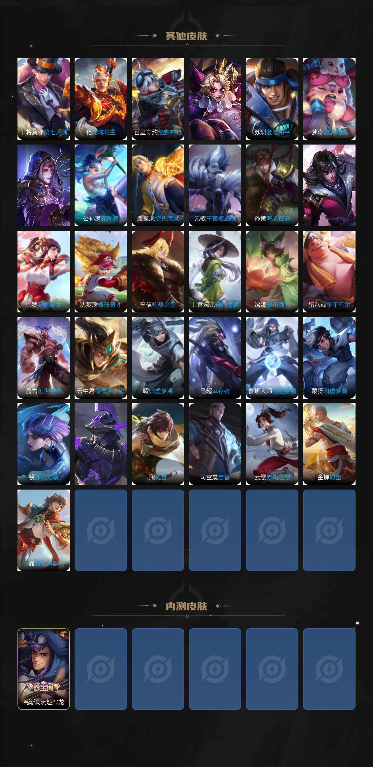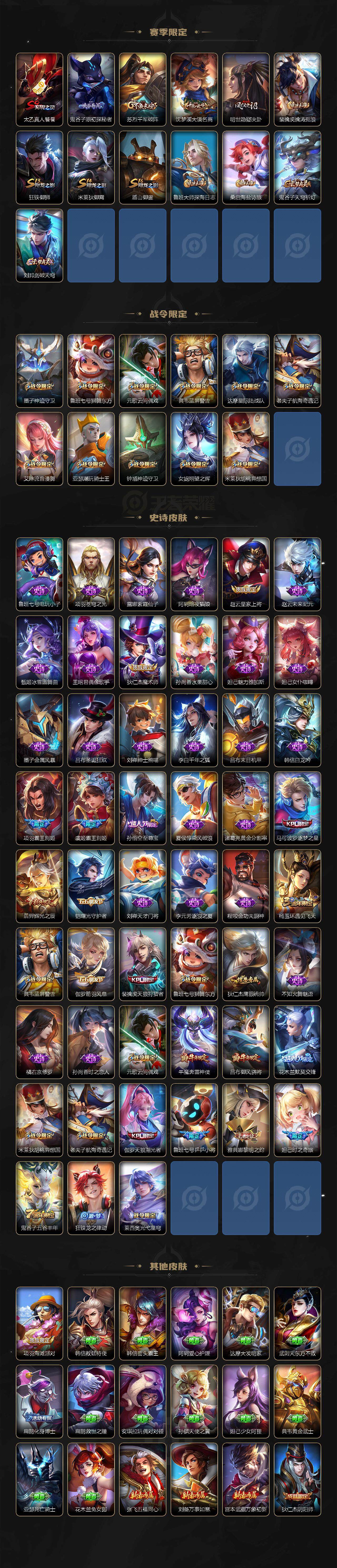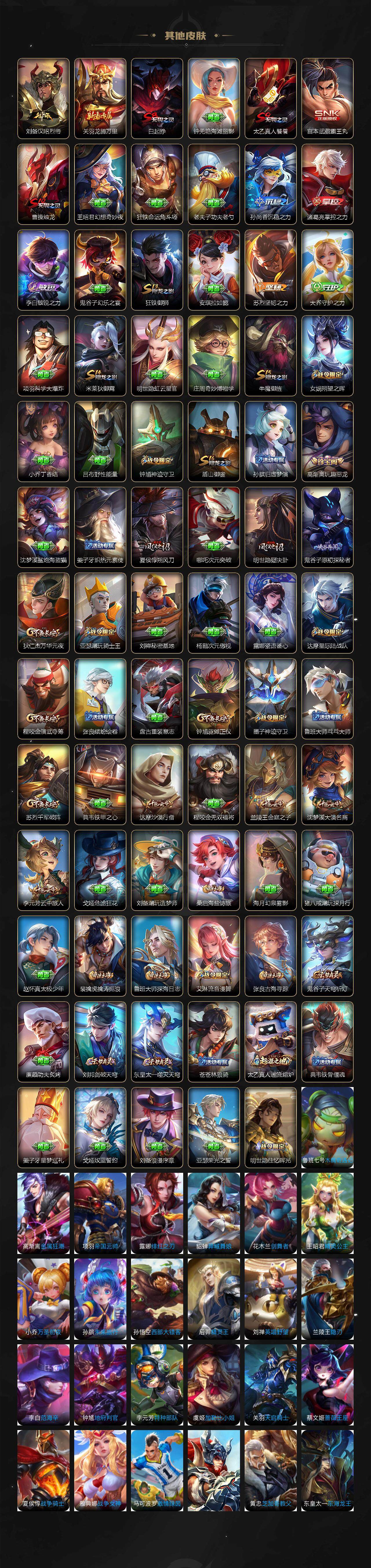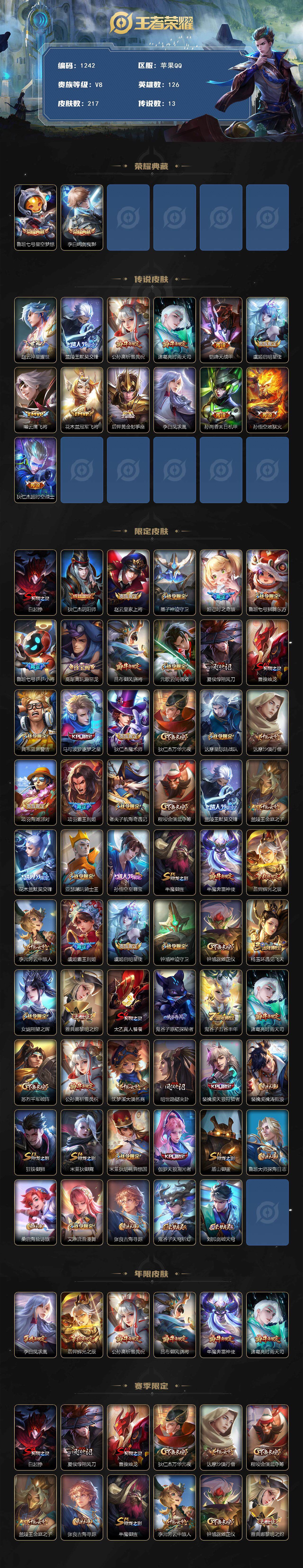 126英雄-217皮肤-贵族8/皮肤217/典藏2/传说13/史诗51/英雄126/星空梦想 鲁班七号/鸣剑·曳影 李白/淬星耀世 赵云/默契交锋 兰陵王/祈雪灵祝 公孙离/时雨天司 诸葛亮/绛天战甲 铠/启明星使 虞姬/云鹰飞将 曜/冠军飞将 花木兰/黄金射手座 后羿/凤求凰 李白/末日机甲 孙尚香/地狱火 孙悟空/超时空战士 狄仁杰/狰 白起/阴阳师 狄仁杰/皇家上将 赵云/神迹守卫 墨子/时之奇旅 妲己/狮舞东