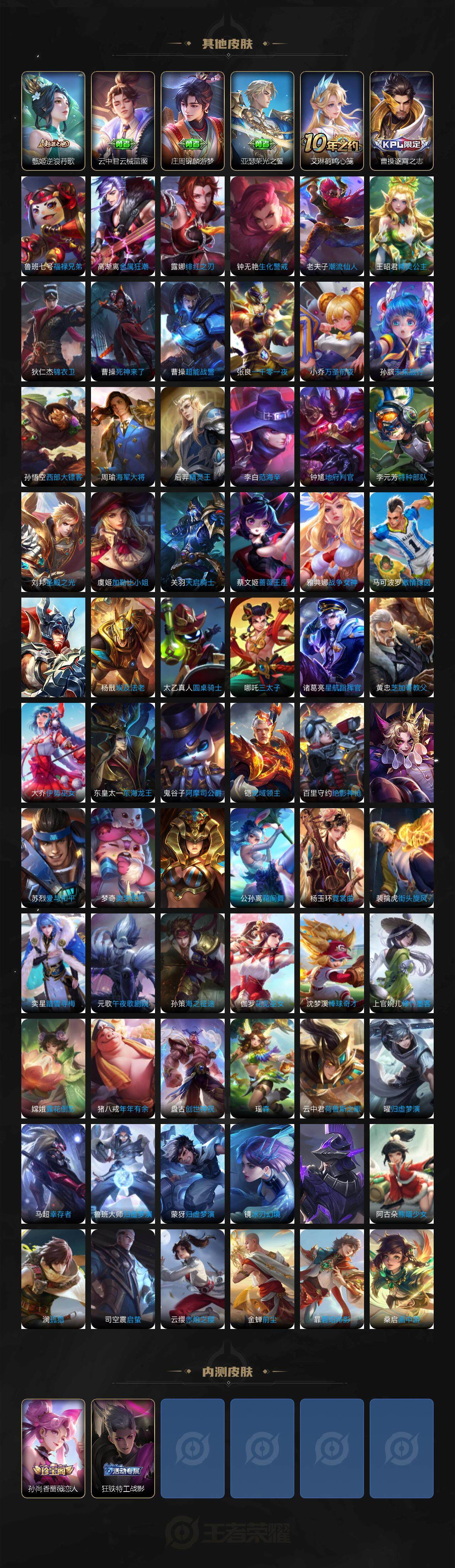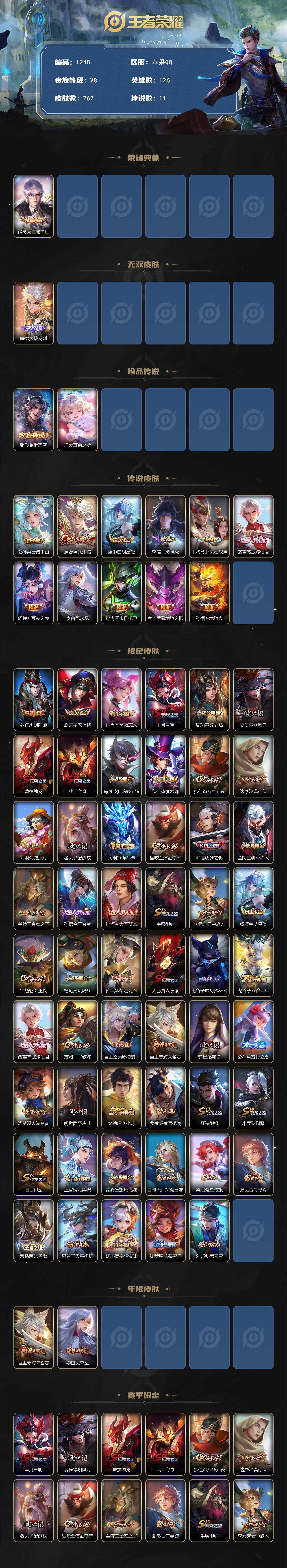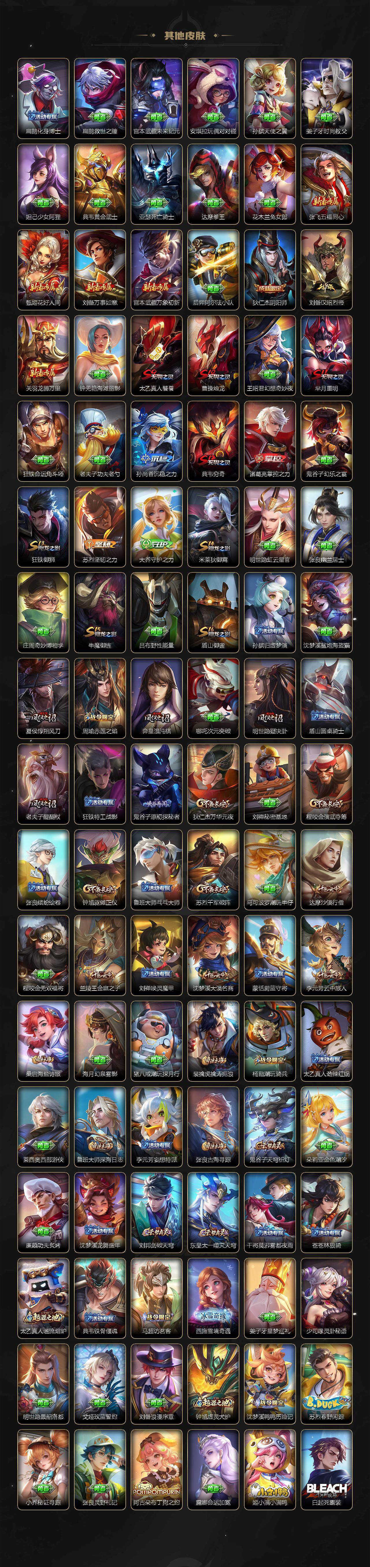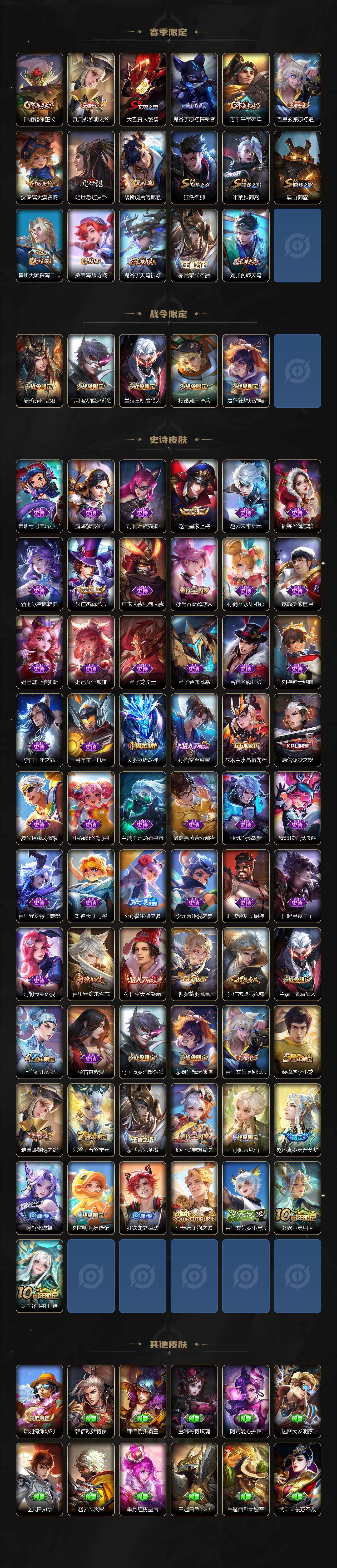 126英雄-262皮肤-贵族8/皮肤262/典藏1/传说11/史诗61/英雄126/蒙恬全皮/星域神启 诸葛亮/器灵·螭龙剑 曜/兔狲·蓬尾 张飞/大耳狗之梦 瑶/云诺千山 公孙离/愿照·九州拓 澜/启明星使 虞姬/一念神魔 李信/久胜战神 干将莫邪/武陵仙君 诸葛亮/仲夏夜之梦 貂蝉/凤求凰 李白/末日机甲 孙尚香/地狱之眼 宫本武藏/地狱火 孙悟空/阴阳师 狄仁杰/皇家上将 赵云/蔷薇恋人 孙尚香/重明 芈月/赤