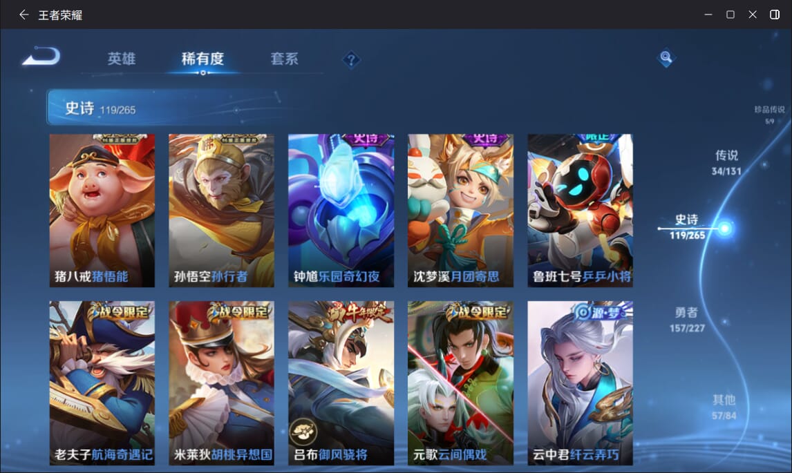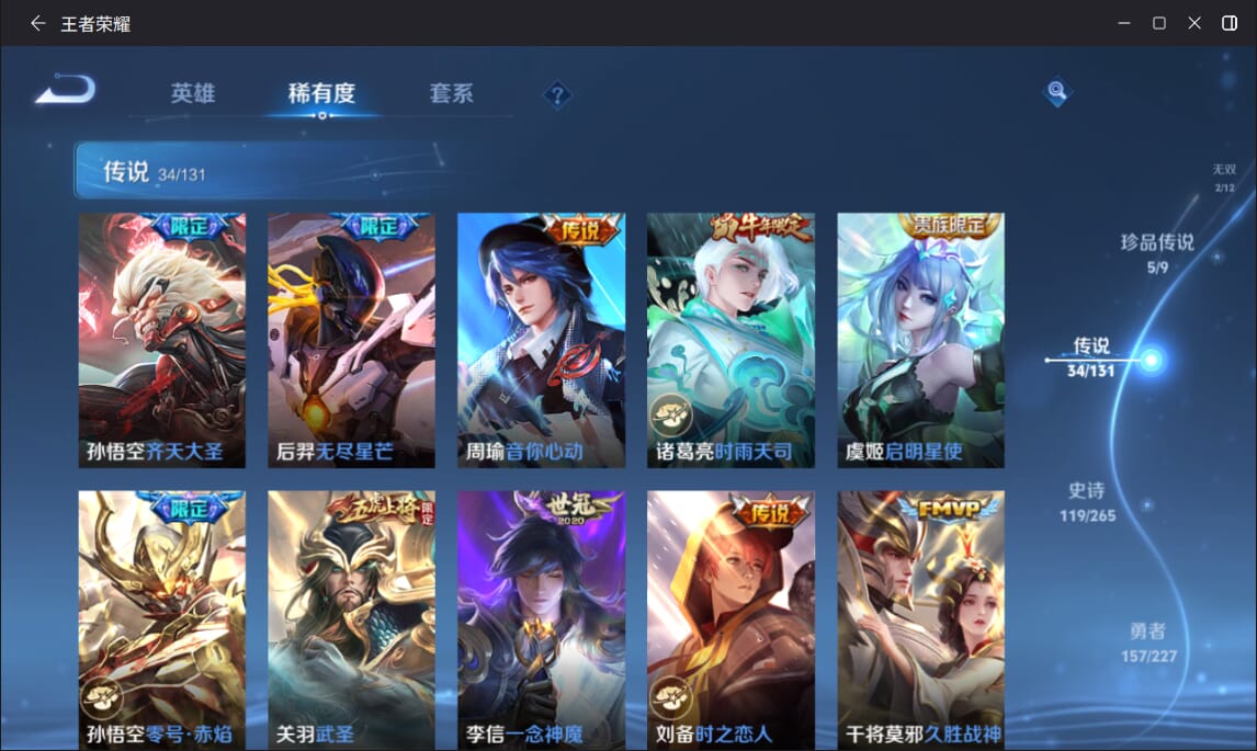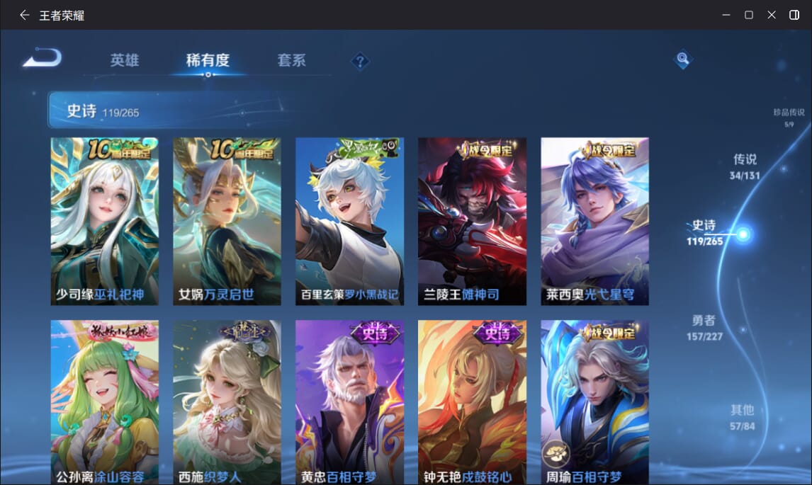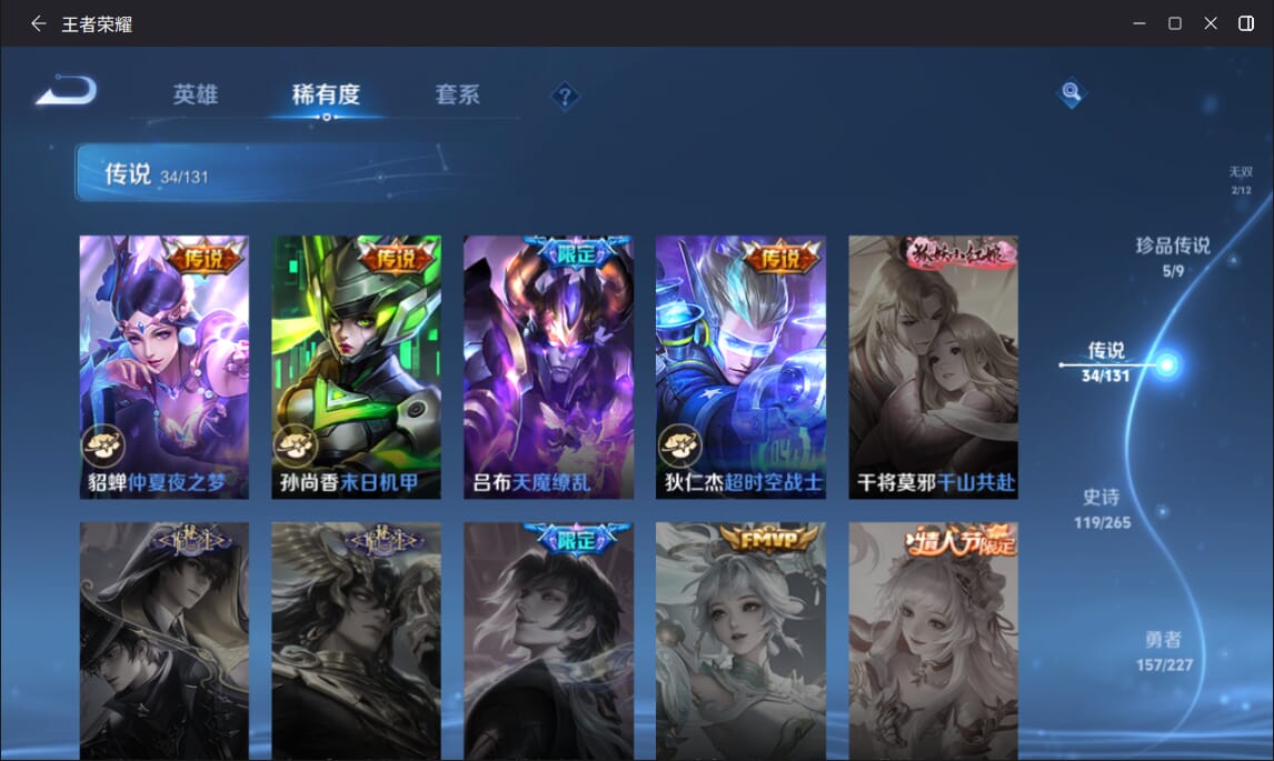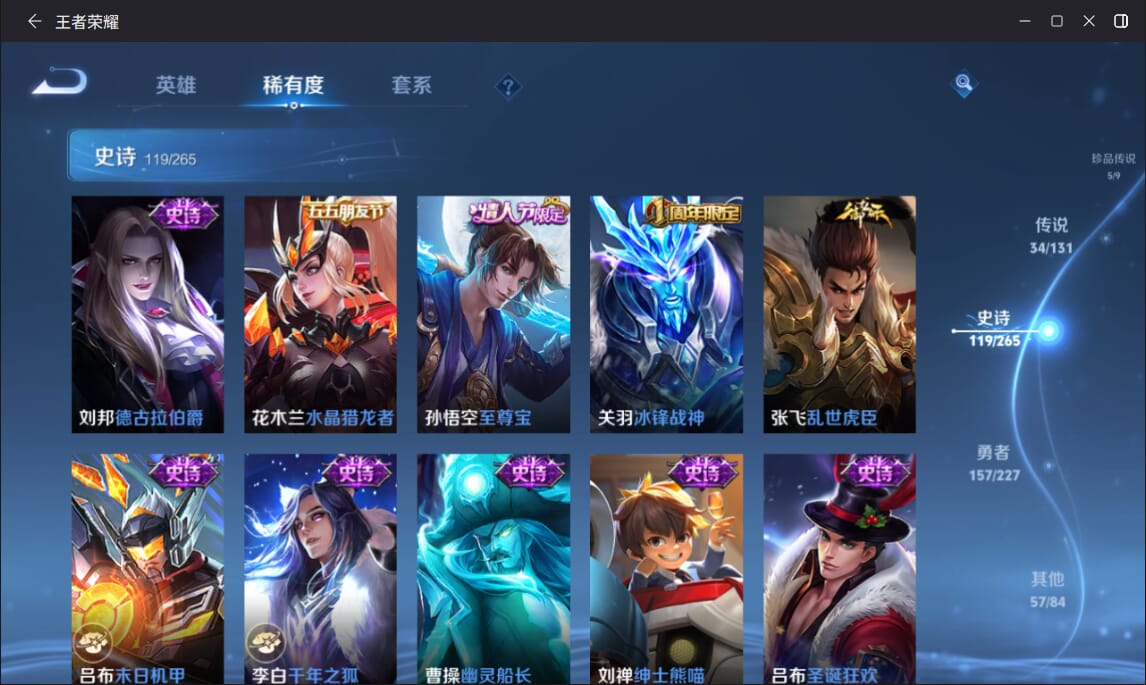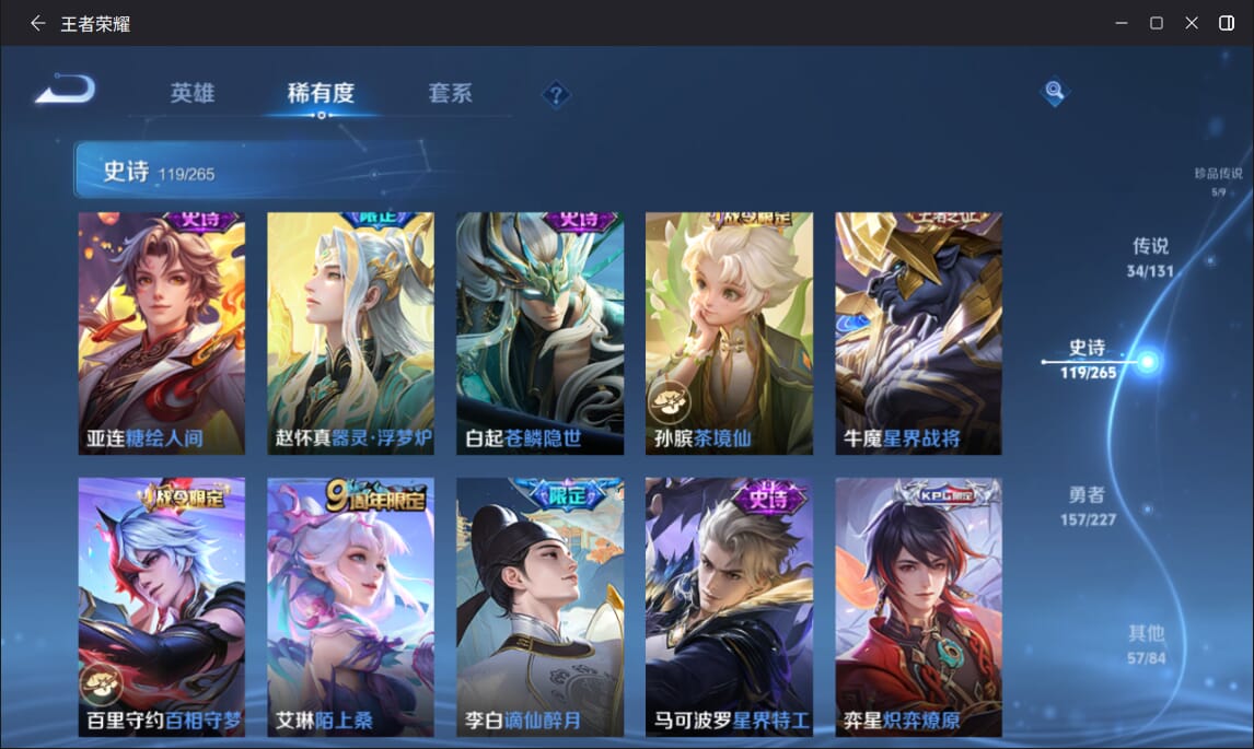 127英雄-377皮肤-实名: 可修改 英雄数: 127 皮肤数: 377 荣耀水晶: 全息碎影赤影疾锋弑呛猎影 无双皮: 雪境奇遇-甄姬天机白泽 珍品传说: 江户川柯南怪盗基德时之奇旅-孙策兔狲·蓬尾黑崎一护 传说皮: 久胜战神一念神魔末日机甲-孙尚香仲夏夜之梦零号·赤焰音你心动-周瑜时之恋人-