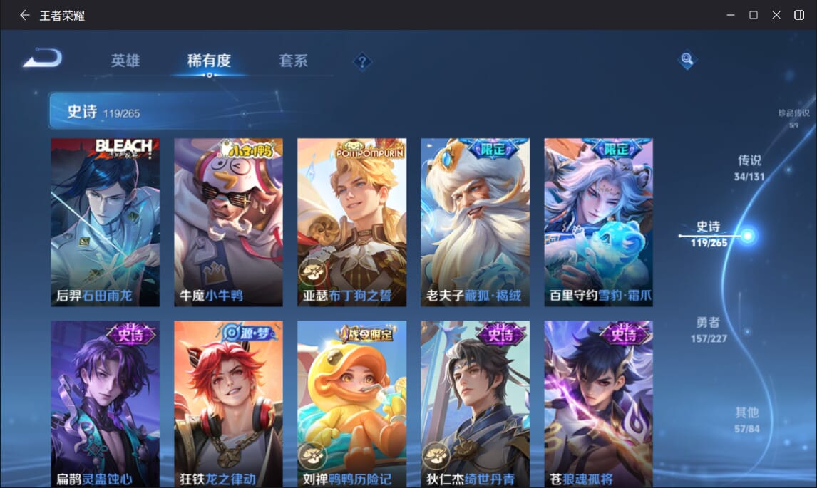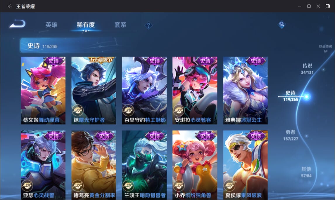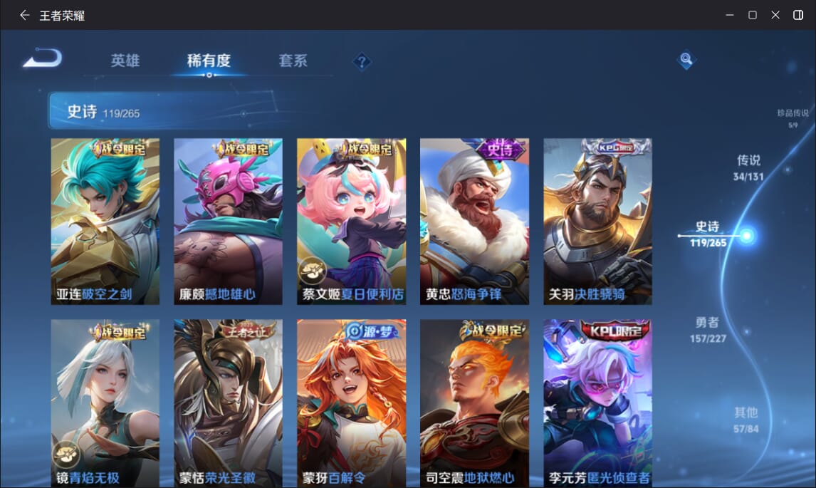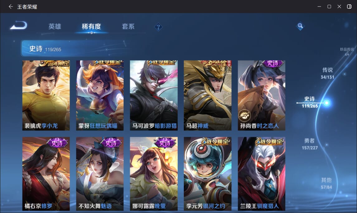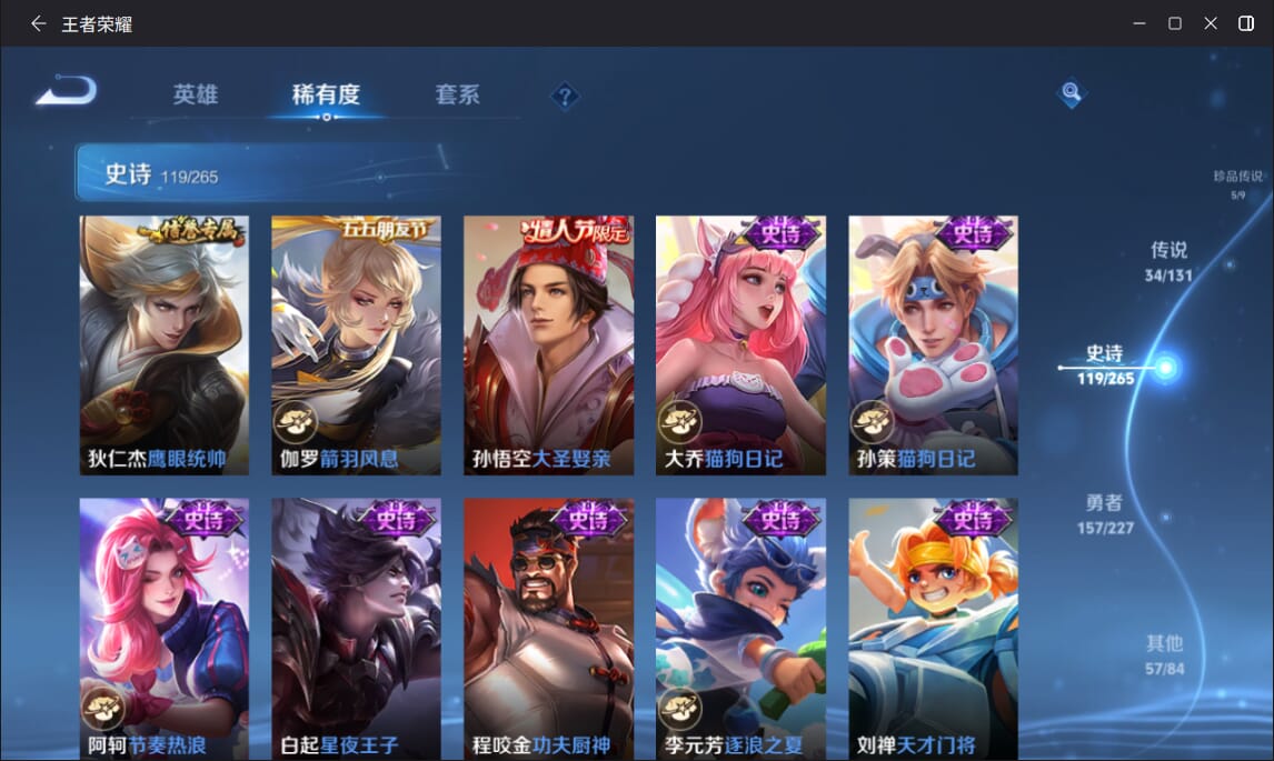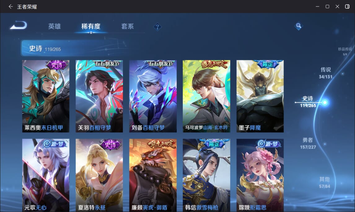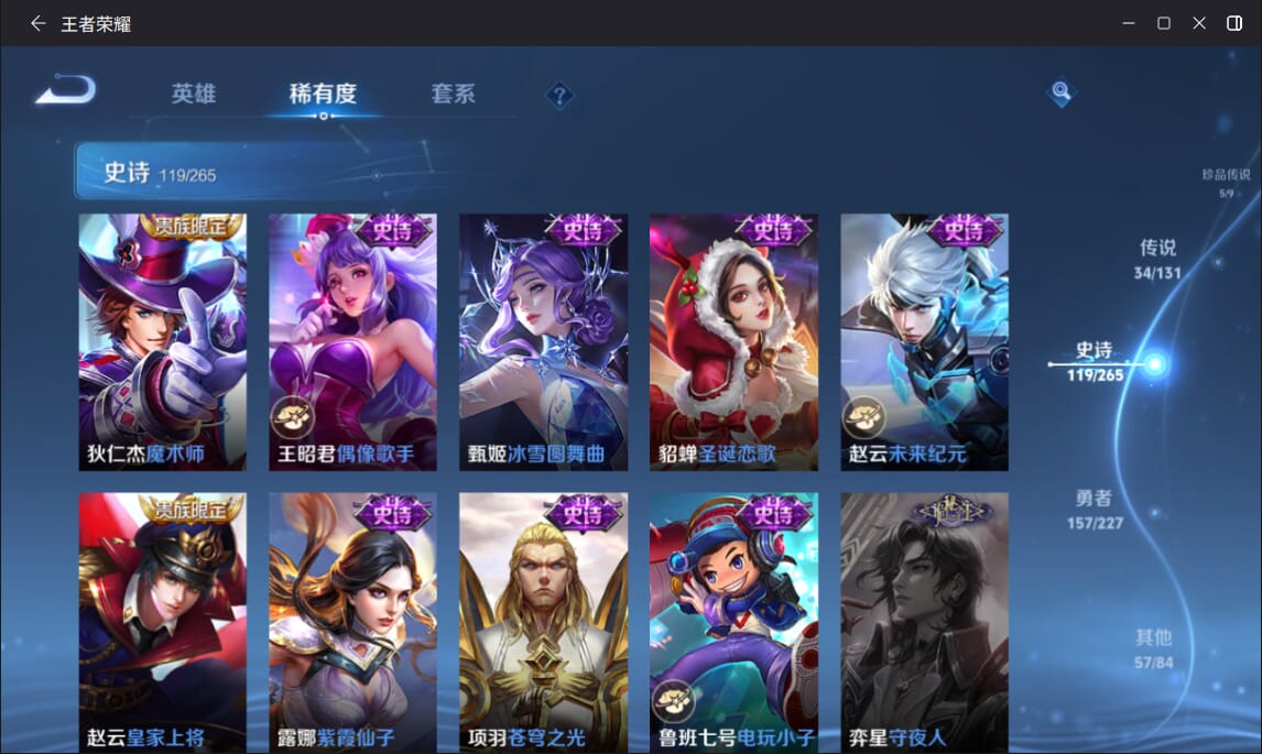 127英雄-377皮肤-实名: 可修改 英雄数: 127 皮肤数: 377 荣耀水晶: 全息碎影赤影疾锋弑呛猎影 无双皮: 雪境奇遇-甄姬天机白泽 珍品传说: 江户川柯南怪盗基德时之奇旅-孙策兔狲·蓬尾黑崎一护 传说皮: 久胜战神一念神魔末日机甲-孙尚香仲夏夜之梦零号·赤焰音你心动-周瑜时之恋人-