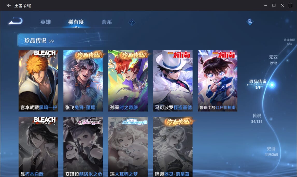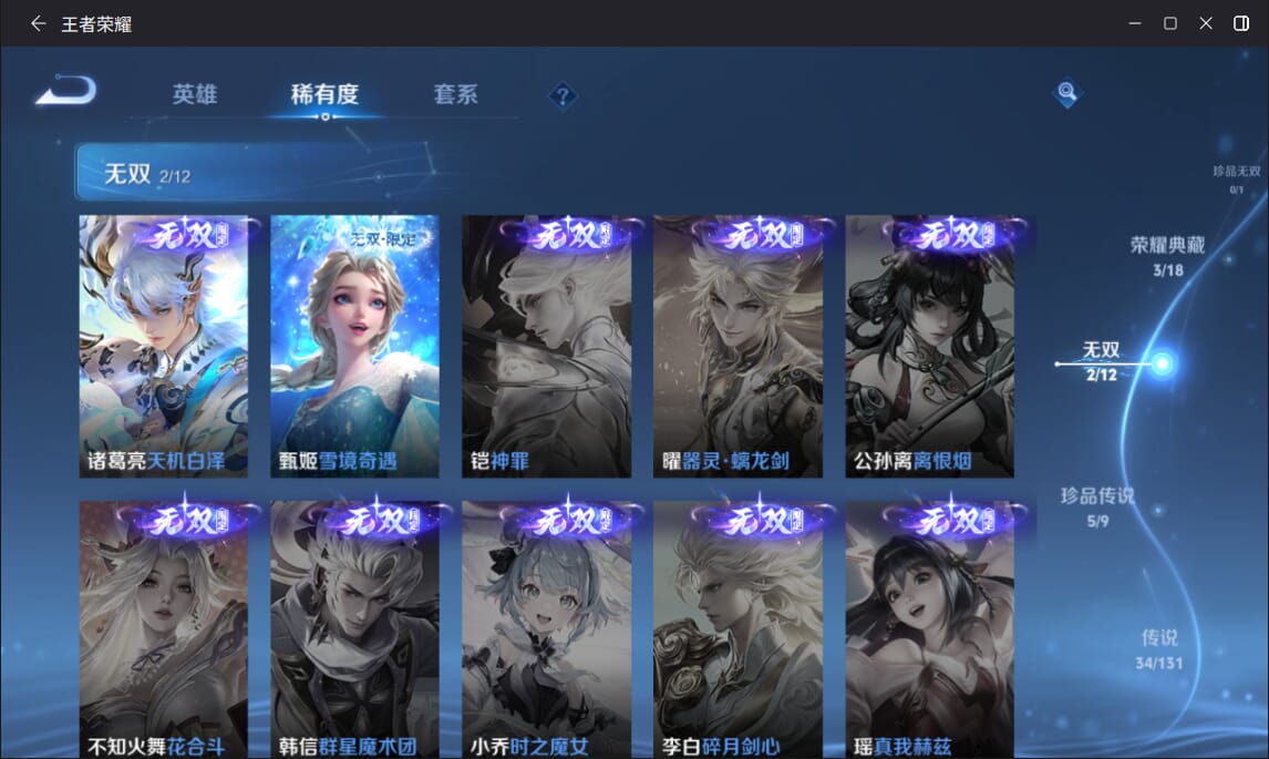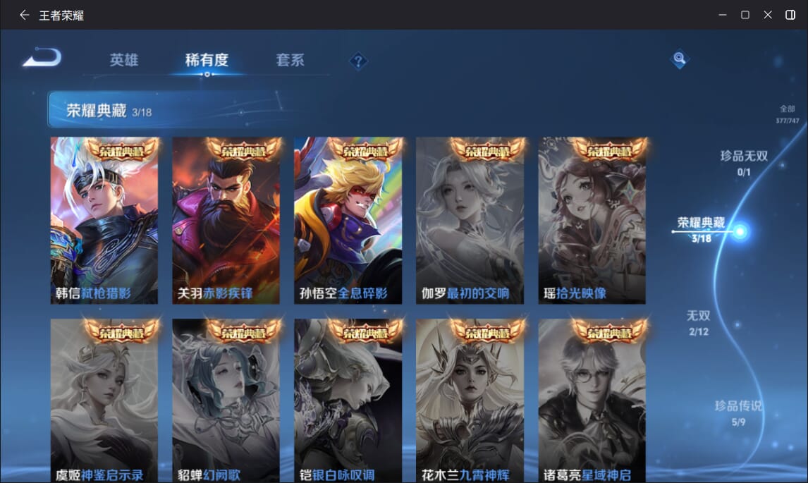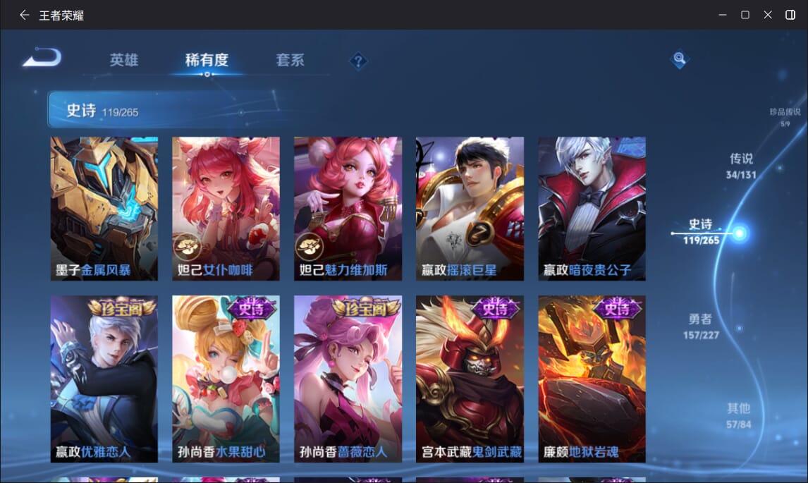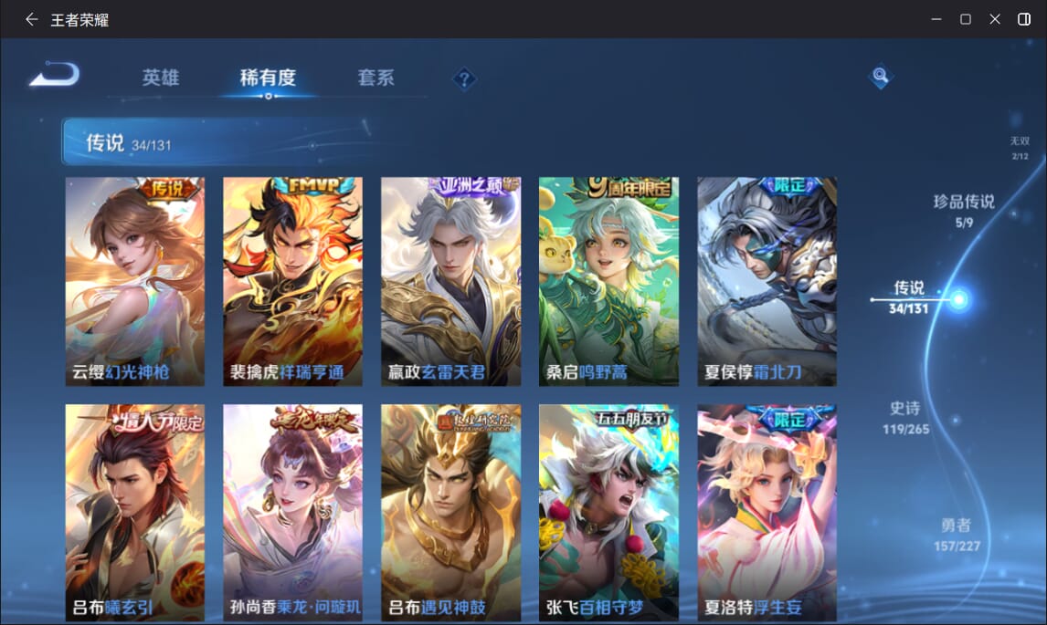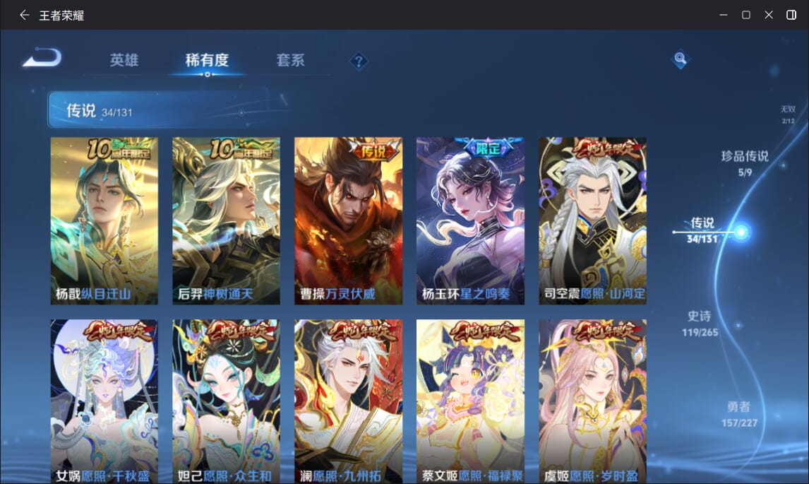 127英雄-377皮肤-实名: 可修改 英雄数: 127 皮肤数: 377 荣耀水晶: 全息碎影赤影疾锋弑呛猎影 无双皮: 雪境奇遇-甄姬天机白泽 珍品传说: 江户川柯南怪盗基德时之奇旅-孙策兔狲·蓬尾黑崎一护 传说皮: 久胜战神一念神魔末日机甲-孙尚香仲夏夜之梦零号·赤焰音你心动-周瑜时之恋人-