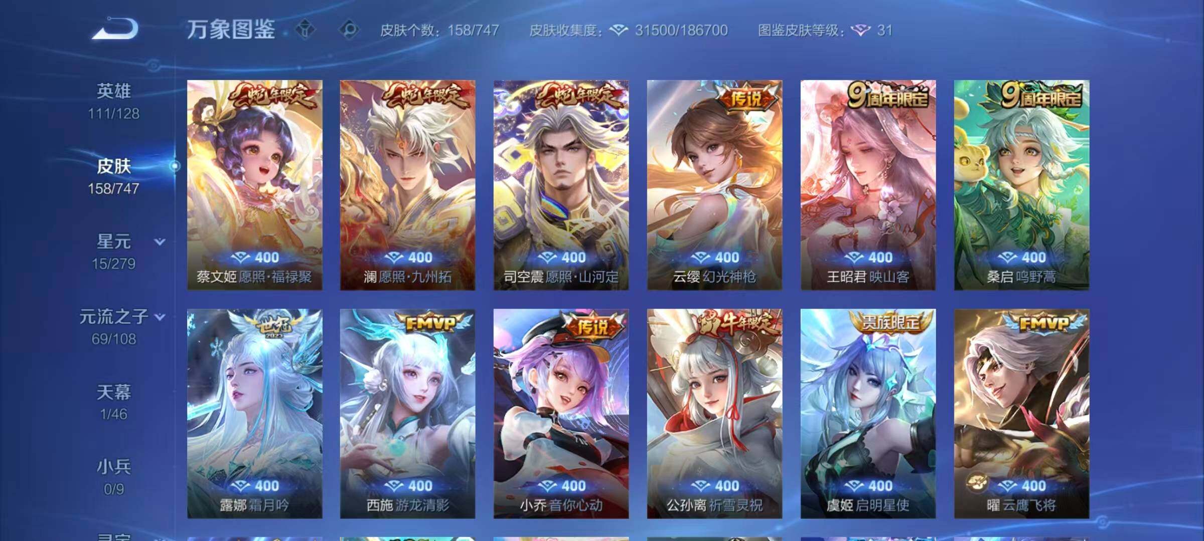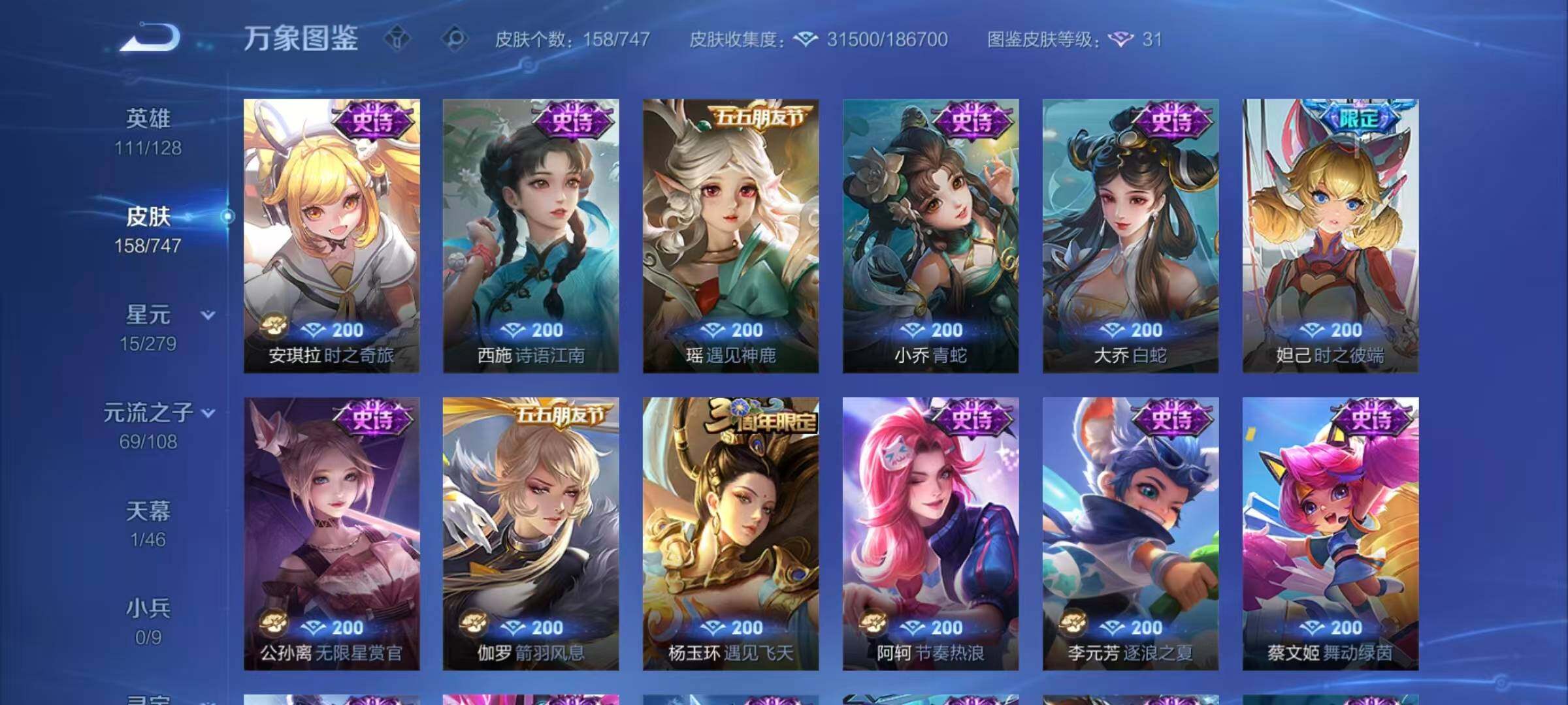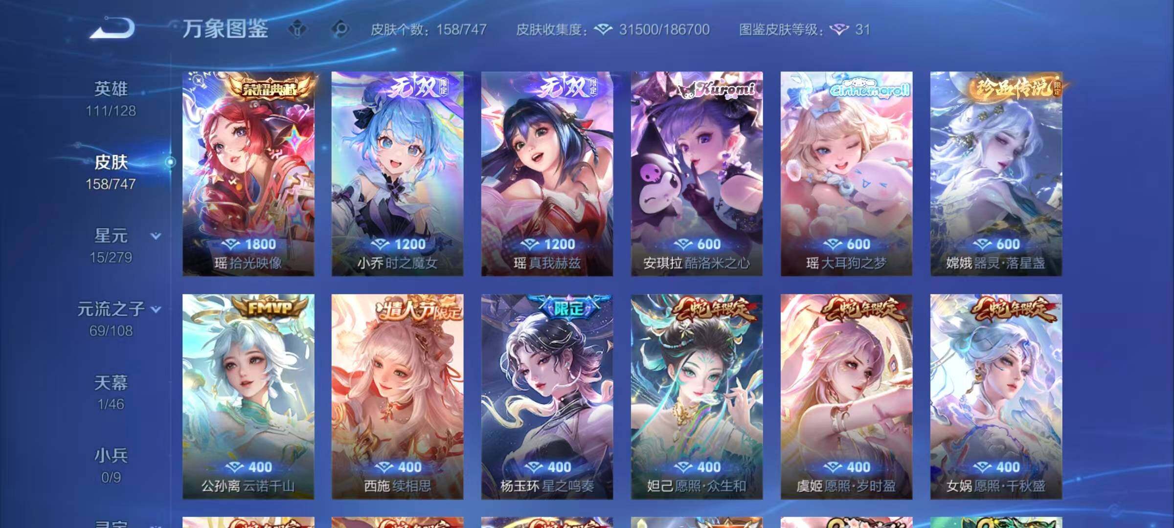 111英雄-158皮肤-【极品公主号 19质量传说 瑶无双 小乔无双 拾光映像 大耳狗 酷洛米之心 续相思 】安卓q-v8-最强王者段位-111英雄-158皮肤-1典藏皮肤-2无双-3珍品传说-19传说-53史诗 【英雄全皮】:少司缘全皮 【荣耀典藏】:瑶拾光映像 【无双皮肤】:瑶真我赫兹,小乔时之魔女 【珍品传说】:嫦娥器灵落星盏,瑶大耳狗之梦,安琪拉酷洛米之心 【传说皮肤】:公孙离云诺千山,西施续相思,杨玉环星