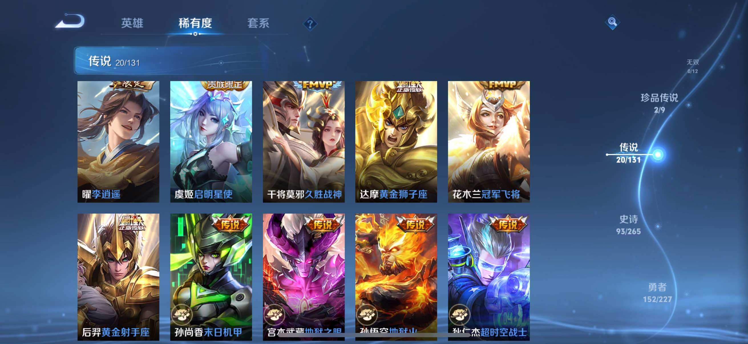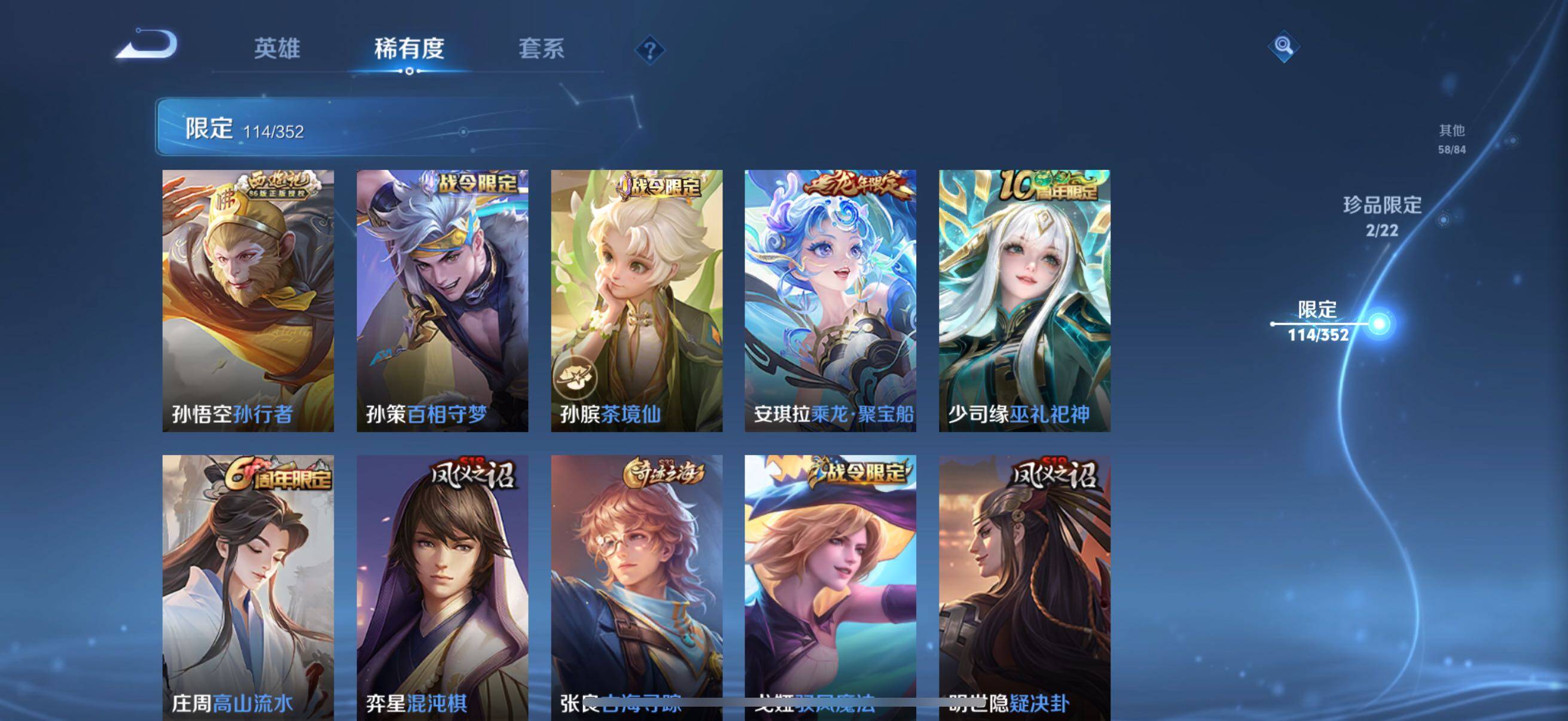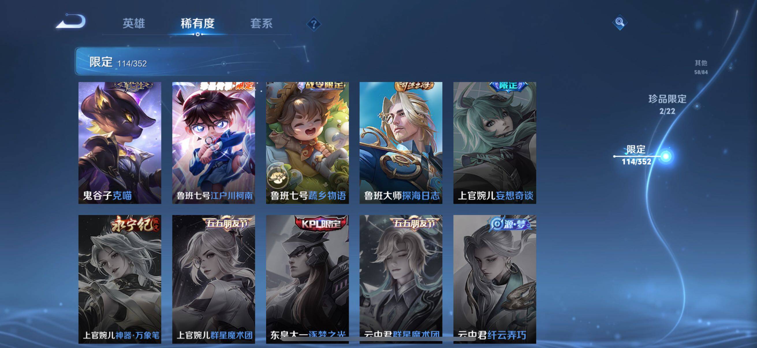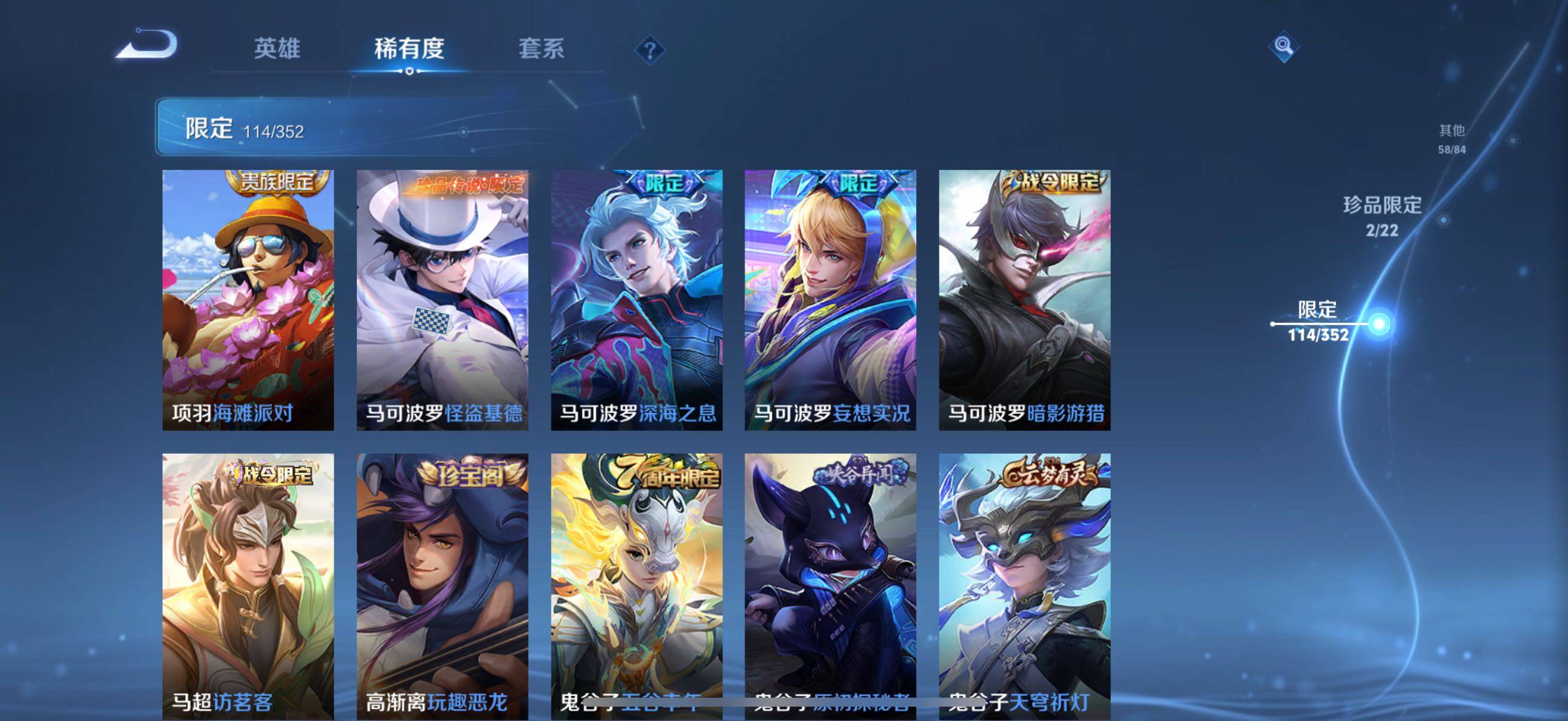 126英雄-326皮肤-账号亮点:孙悟空全息碎影 马可波罗怪盗基德,鲁班七号江户川柯南 后羿神树通天,澜愿照九州拓,虞姬愿照岁时盈,裴擒虎祥瑞亨通,桑启鸣野蒿,夏侯惇霜北刀,马可波罗妄想实况,不知火舞绯月行,马可波罗深海之息,马超无双飞将,曜李 ,虞姬启明星使,干将莫邪久胜战神,达摩黄金狮子座,花木兰冠军飞将,后羿黄金射手座,孙尚香末日机甲,宫本武藏地狱之眼,孙悟空地狱火,狄仁杰超时空战士625-25 【英雄全皮