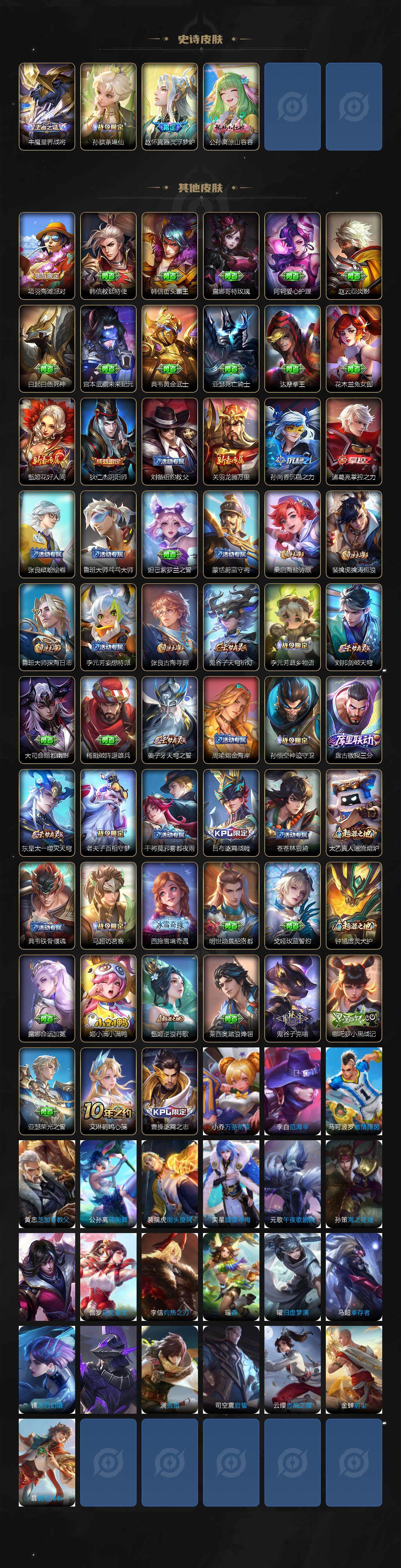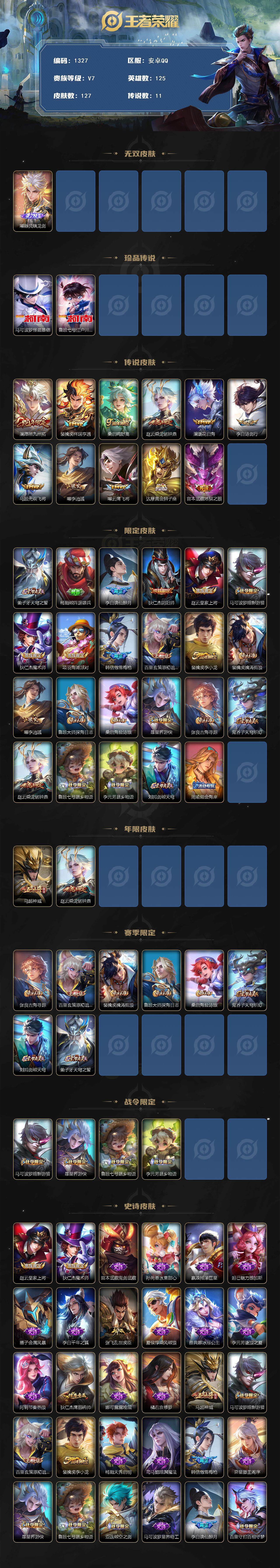 125英雄-127皮肤-贵族7/皮肤127/传说11/史诗34/英雄125/器灵·螭龙剑 曜/怪盗基德 马可波罗/江户川柯南 鲁班七号/愿照·九州拓 澜/祥瑞亨通 裴擒虎/鸣野蒿 桑启/乘龙·铭钟鼎 赵云/逐花归海 澜/诗剑行 李白/无双飞将 马超/李 曜/云鹰飞将 曜/黄金狮子座 达摩/地狱之眼 宫本武藏/天穹之誓 姜子牙/破阵·退雄兵 杨戬/谪仙醉月 李白/阴阳师 狄仁杰/皇家上将 赵云/暗影游猎 马可波罗/