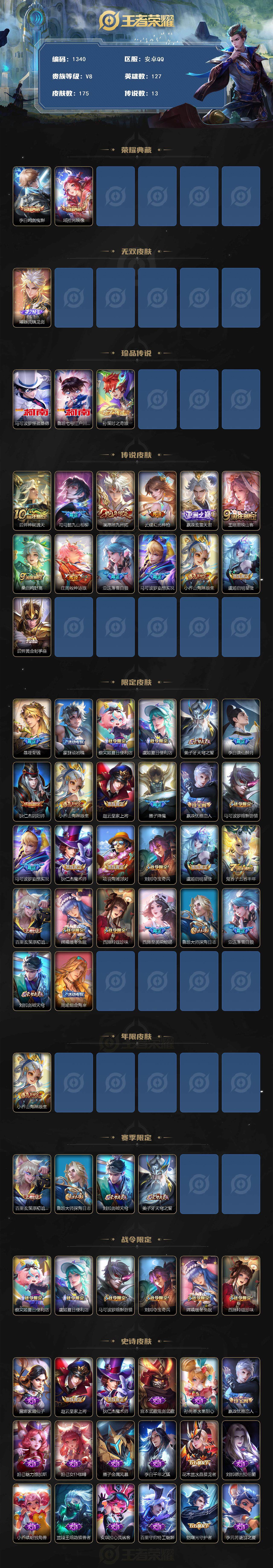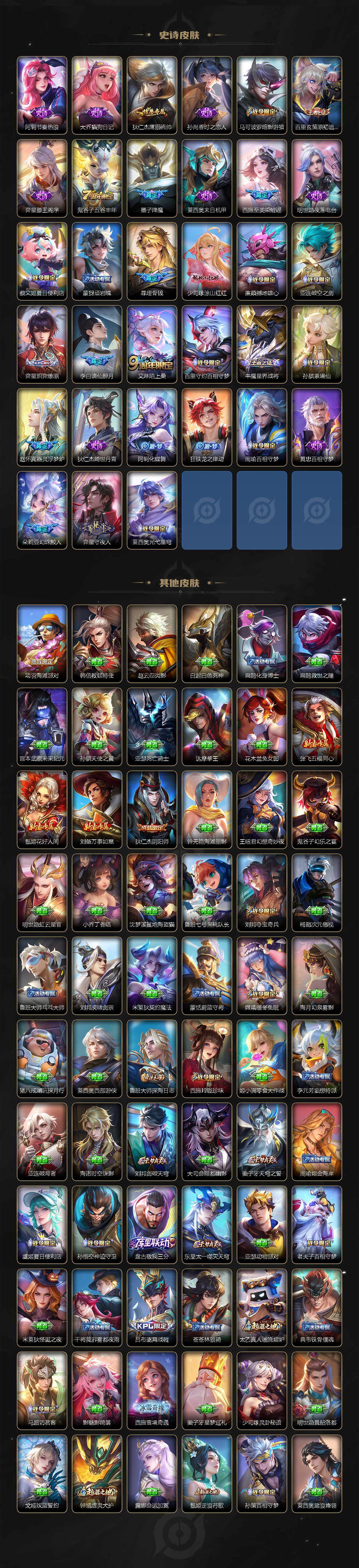 127英雄-175皮肤-贵族8/皮肤175/典藏2/传说13/史诗51/英雄127/刘邦全皮/莱西奥全皮/影全皮/鸣剑·曳影 李白/拾光映像 瑶/器灵·螭龙剑 曜/怪盗基德 马可波罗/江户川柯南 鲁班七号/时之奇旅 孙策/神树通天 后羿/九山相柳 司马懿/愿照·九州拓 澜/幻光神呛 云缨/玄雷天君 嬴政/映山客 王昭君/鸣野蒿 桑启/牧神诗旅 庄周/落雪白狼 亚连/妄想实况 马可波罗/山海·琳琅生 小乔/启明星使 虞