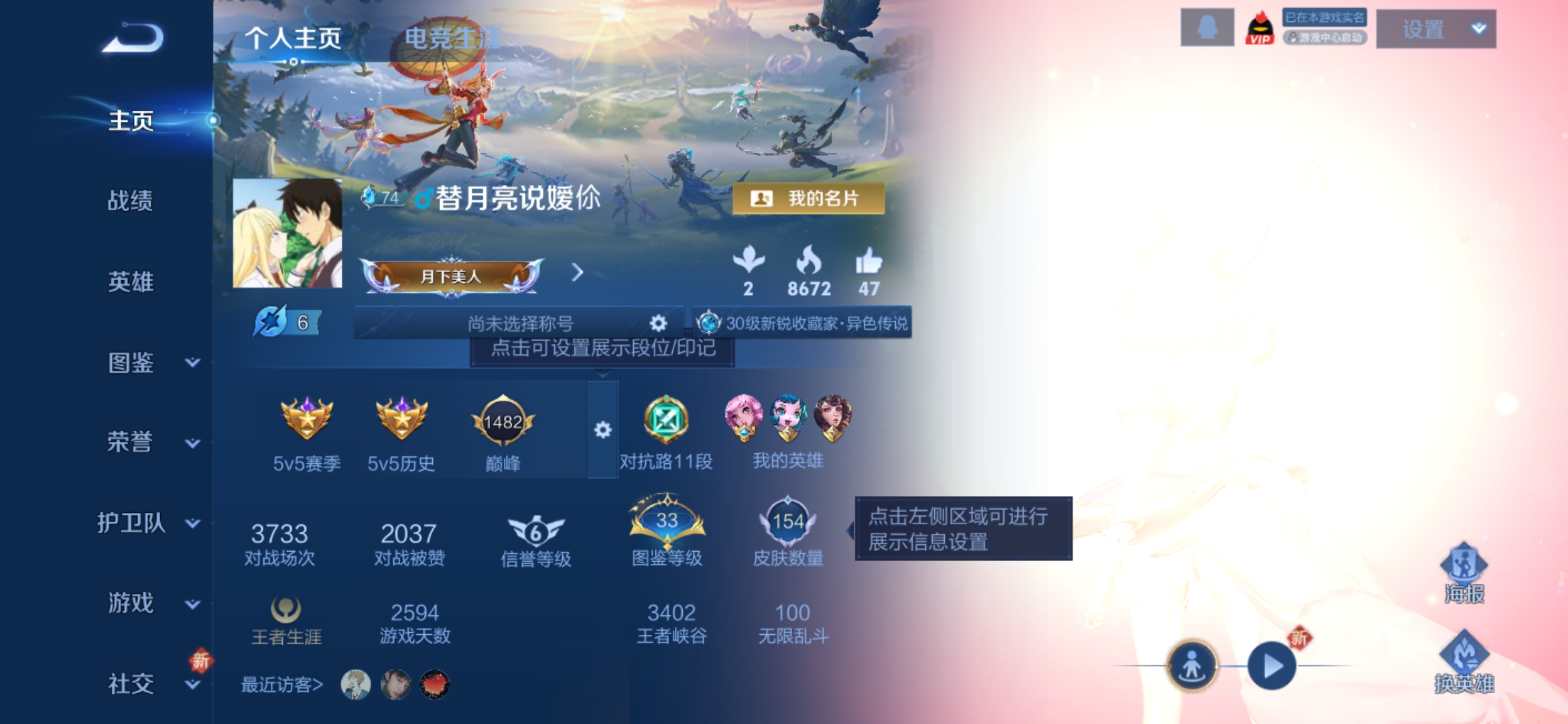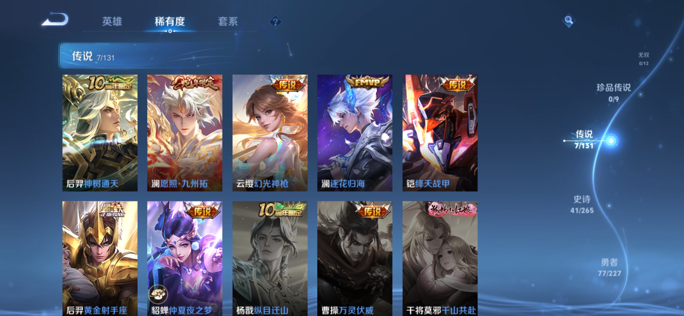 126英雄-154皮肤-传说7 史诗41 限定42 英雄126 皮肤154 稀有英雄9 贵族0级 总场次3732 皮肤价值:97716 【传说皮肤7】 后羿神树通天 澜逐花归海 貂蝉仲夏夜之梦 后羿黄金射手座 铠绛天战甲 云缨幻光神呛 澜愿照九州拓