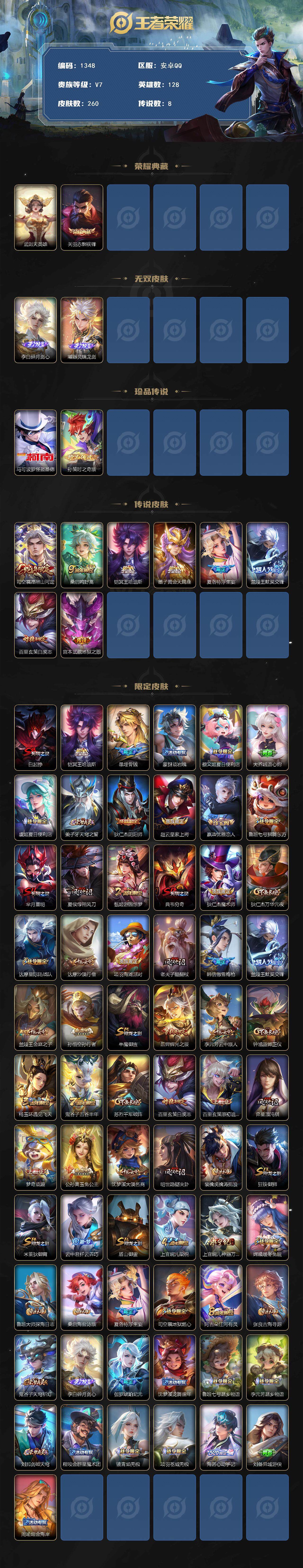 128英雄-260皮肤-贵族7/皮肤260/典藏1/传说8/史诗75/英雄128/司空震全皮/影全皮/海诺全皮/武则天/赤影疾锋 关羽/碎月剑心 李白/器灵·螭龙剑 曜/怪盗基德 马可波罗/时之奇旅 孙策/愿照·山河定 司空震/鸣野蒿 桑启/冥王哈迪斯 铠/黄金天蝎座 墨子/浮生妄 夏洛特/默契交锋 兰陵王/白虎志 百里玄策/地狱之眼 宫本武藏/狰 白起/埋骨钱 暃/顽岩魄 蒙犽/夏日便利店 蔡文姬/绒语心约 大乔/