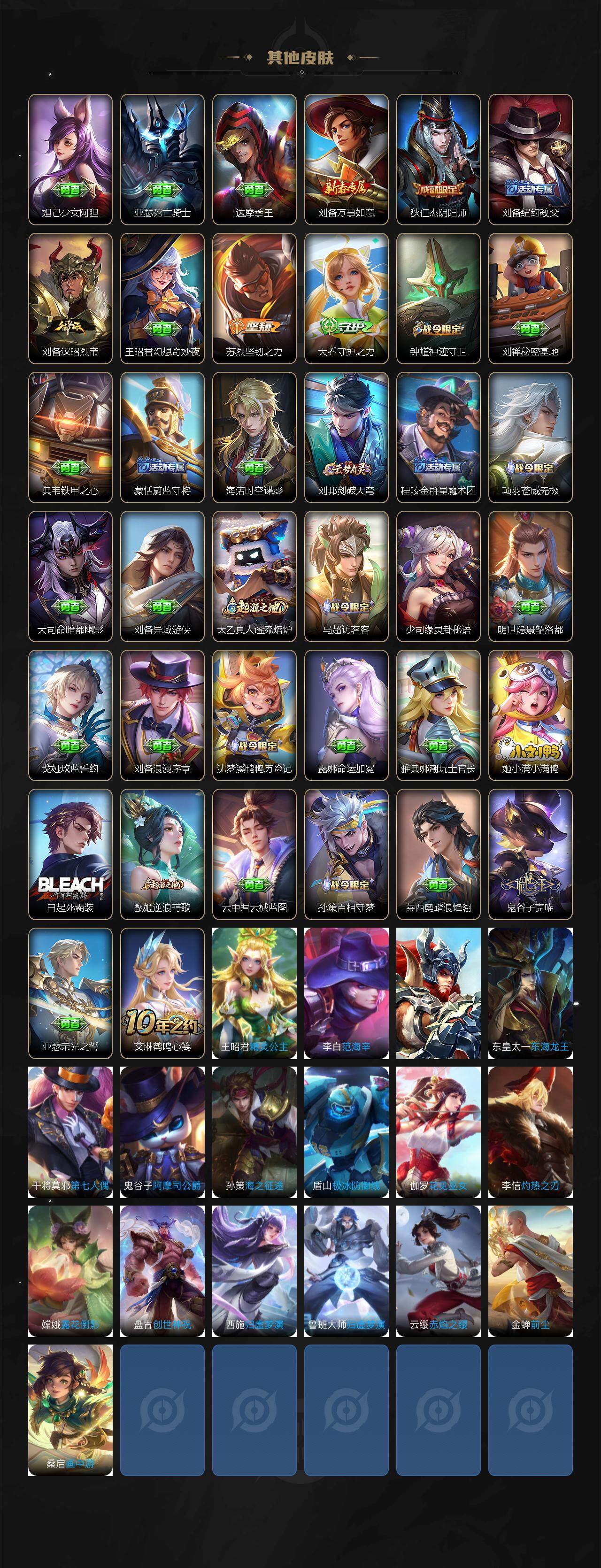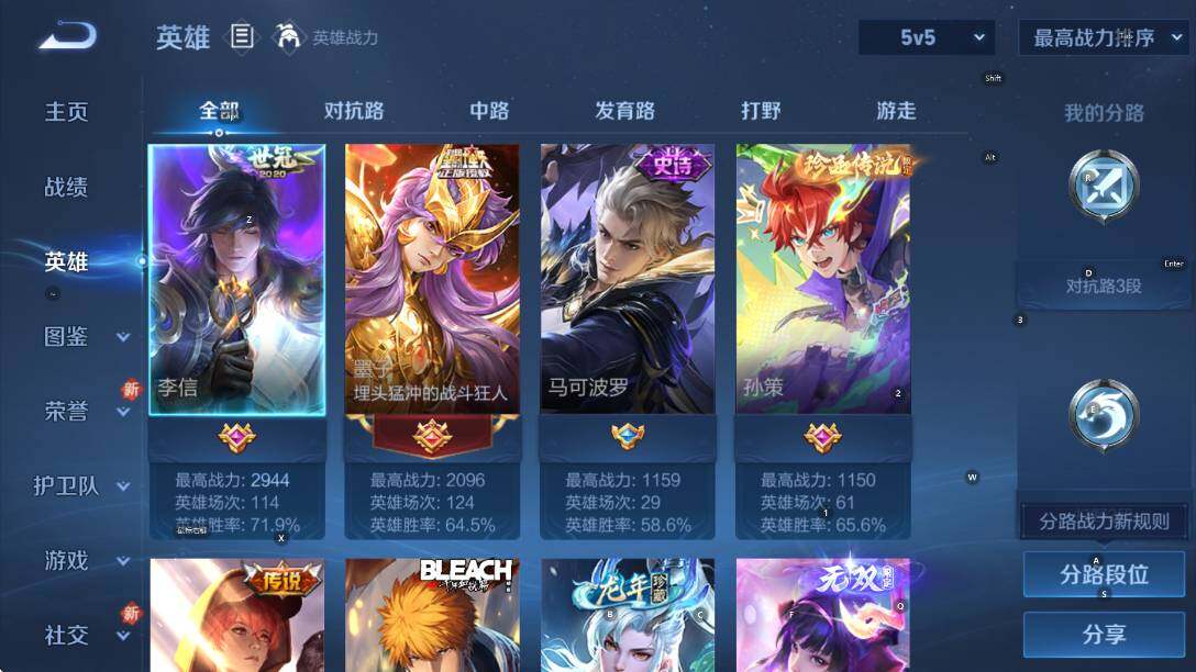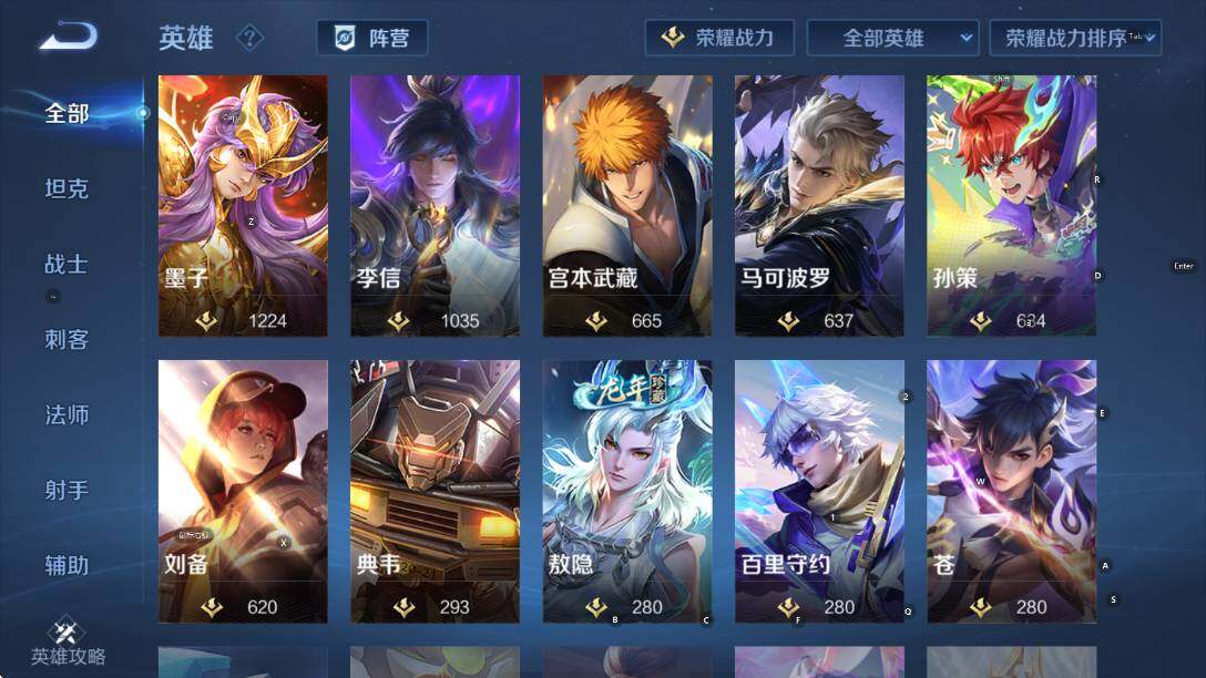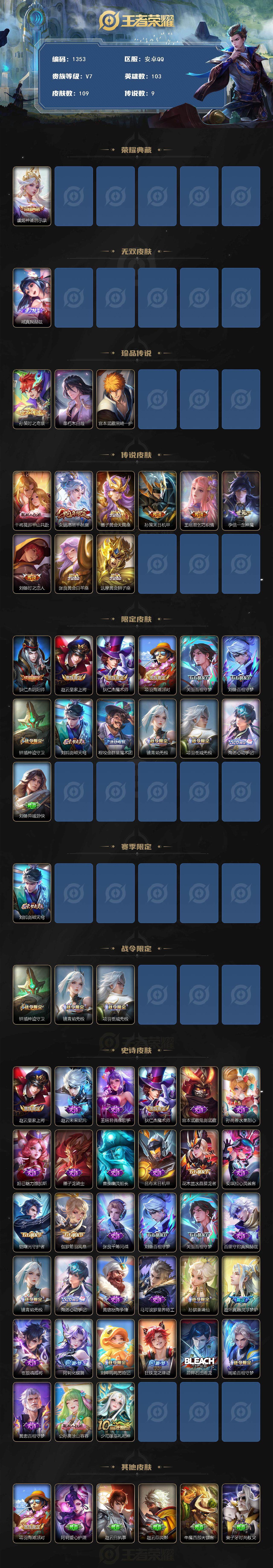 103英雄-109皮肤-贵族7/皮肤109/典藏1/传说9/史诗33/英雄103/海诺全皮/神鉴启示录 虞姬/真我赫兹 瑶/时之奇旅 孙策/朽木白哉 暃/黑崎一护 宫本武藏/千山共赴 干将莫邪/愿照·千秋盛 女娲/黄金天蝎座 墨子/末日机甲 孙策/乞巧织情 王昭君/一念神魔 李信/时之恋人 刘备/黄金白羊座 张良/黄金狮子座 达摩/阴阳师 狄仁杰/皇家上将 赵云/魔术师 狄仁杰/海滩派对 项羽/百相守梦 关羽/百相守