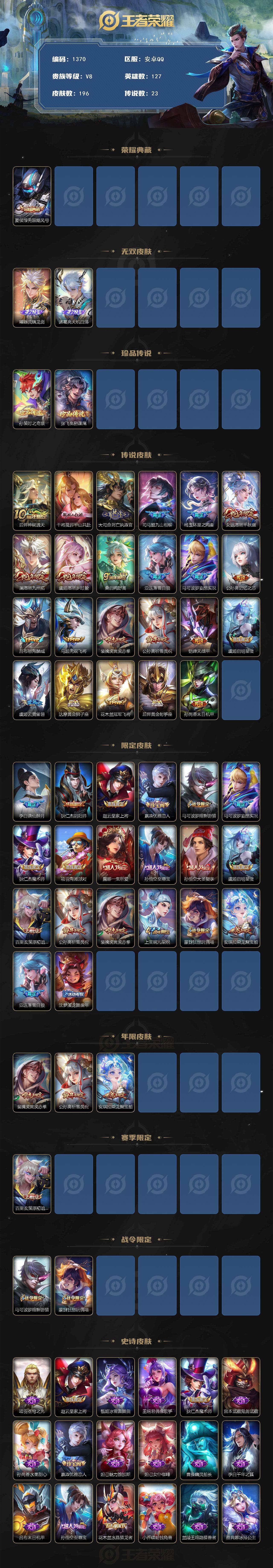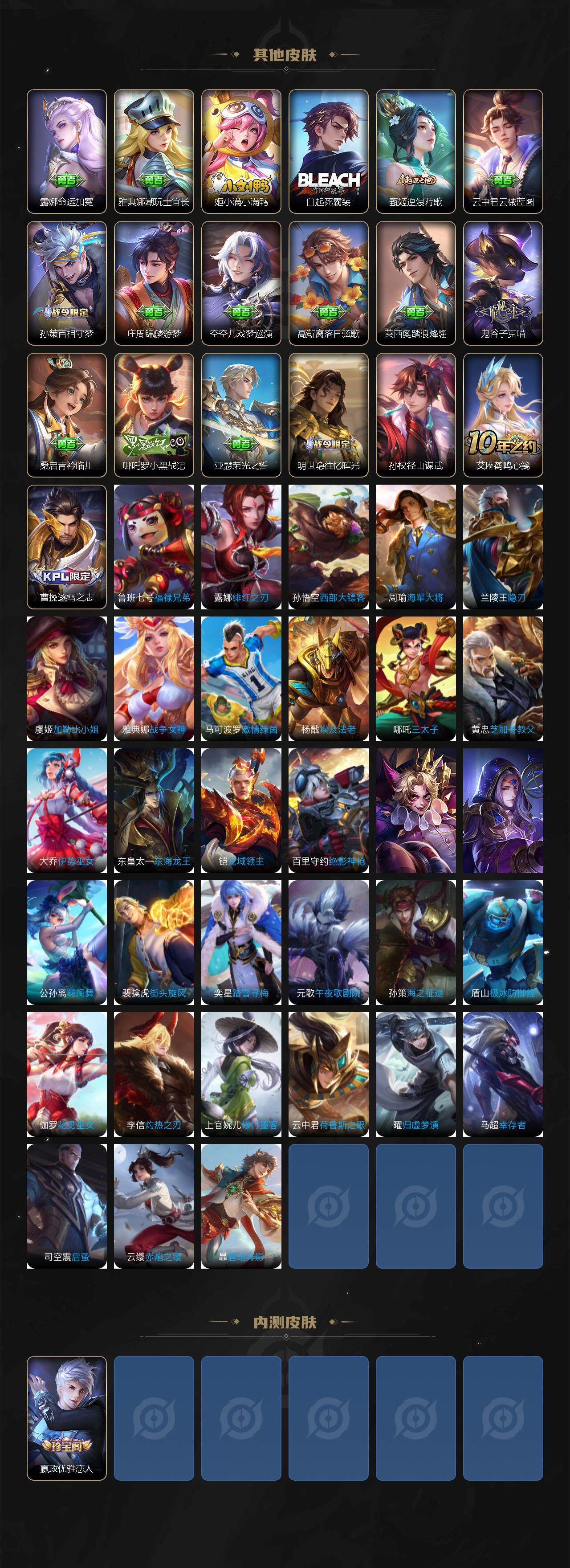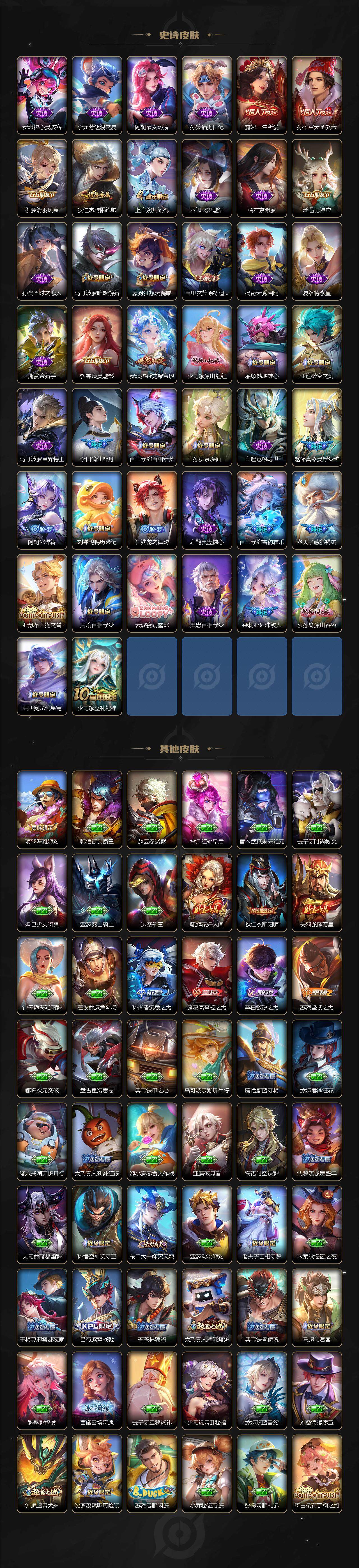127英雄-196皮肤-贵族8/皮肤196/典藏1/传说23/史诗62/英雄127/孙权全皮/空空儿全皮/影全皮/少司缘全皮/无限飓风号 夏侯惇/器灵·螭龙剑 曜/天机白泽 诸葛亮/时之奇旅 孙策/兔狲·蓬尾 张飞/神树通天 后羿/千山共赴 干将莫邪/死亡执政官 大司命/九山相柳 司马懿/星之鸣奏 杨玉环/愿照·千秋盛 女娲/愿照·九州拓 澜/愿照·岁时盈 虞姬/鸣野蒿 桑启/落雪白狼 亚连/妄想实况 马可波罗/记忆