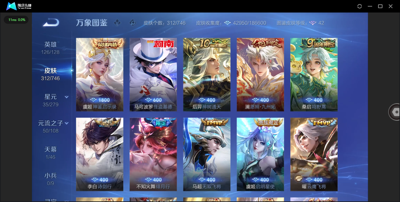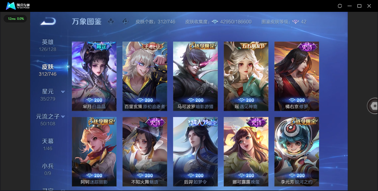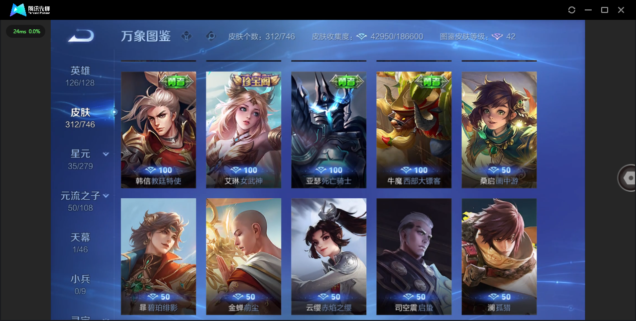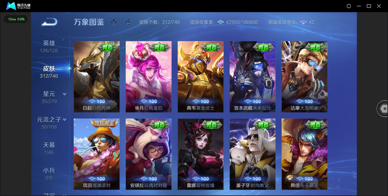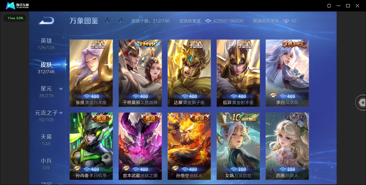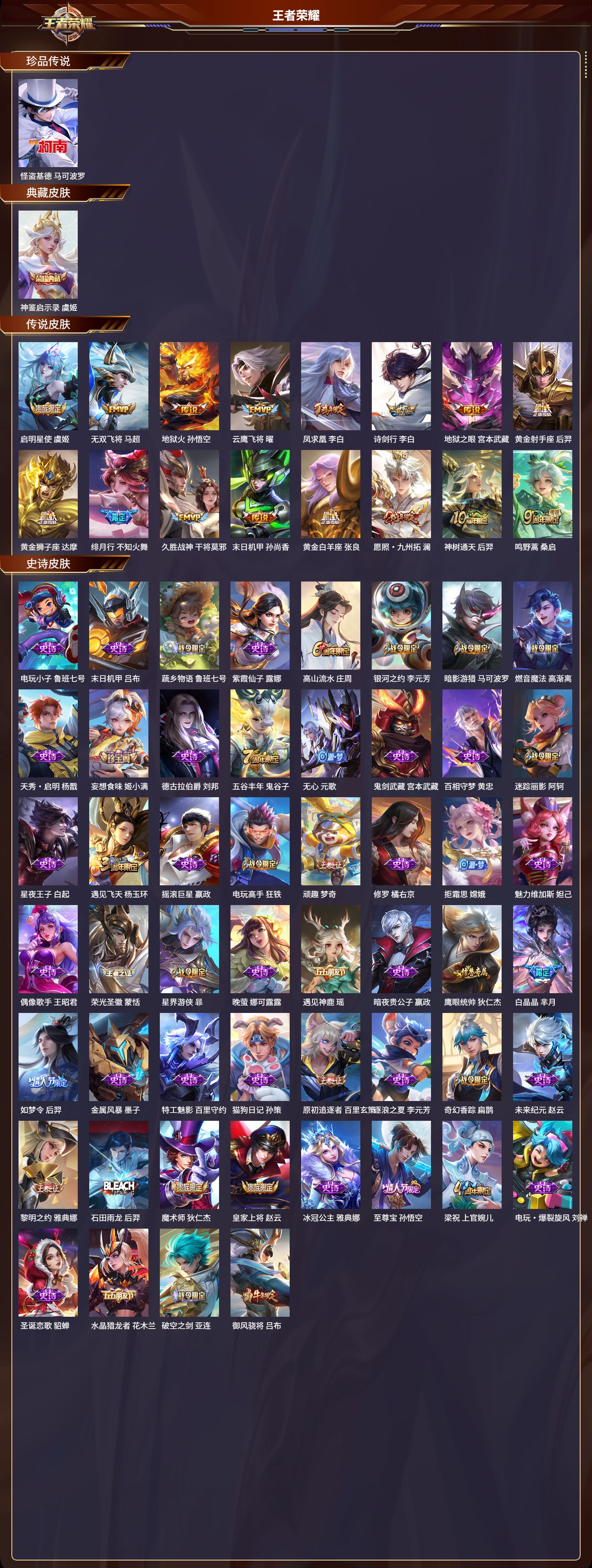 124英雄-312皮肤-安卓qq/非凡王者/312皮肤/124英雄/1典藏/0珍品无双/0无双/1珍品传说/16传说/83史诗/8稀有英雄【1 珍品传说】怪盗基德 马可波罗【1 典藏皮肤】神鉴启示录 虞姬【16 传说皮肤】启明星使 虞姬无双飞将 马超地狱火 孙悟空云鹰飞将 曜凤求凰 李白诗剑行 李白地狱之眼 宫本武藏黄金射手座 后羿黄金狮子座 达摩绯月行 不知火舞久胜战神 干将莫邪末日机甲 孙尚