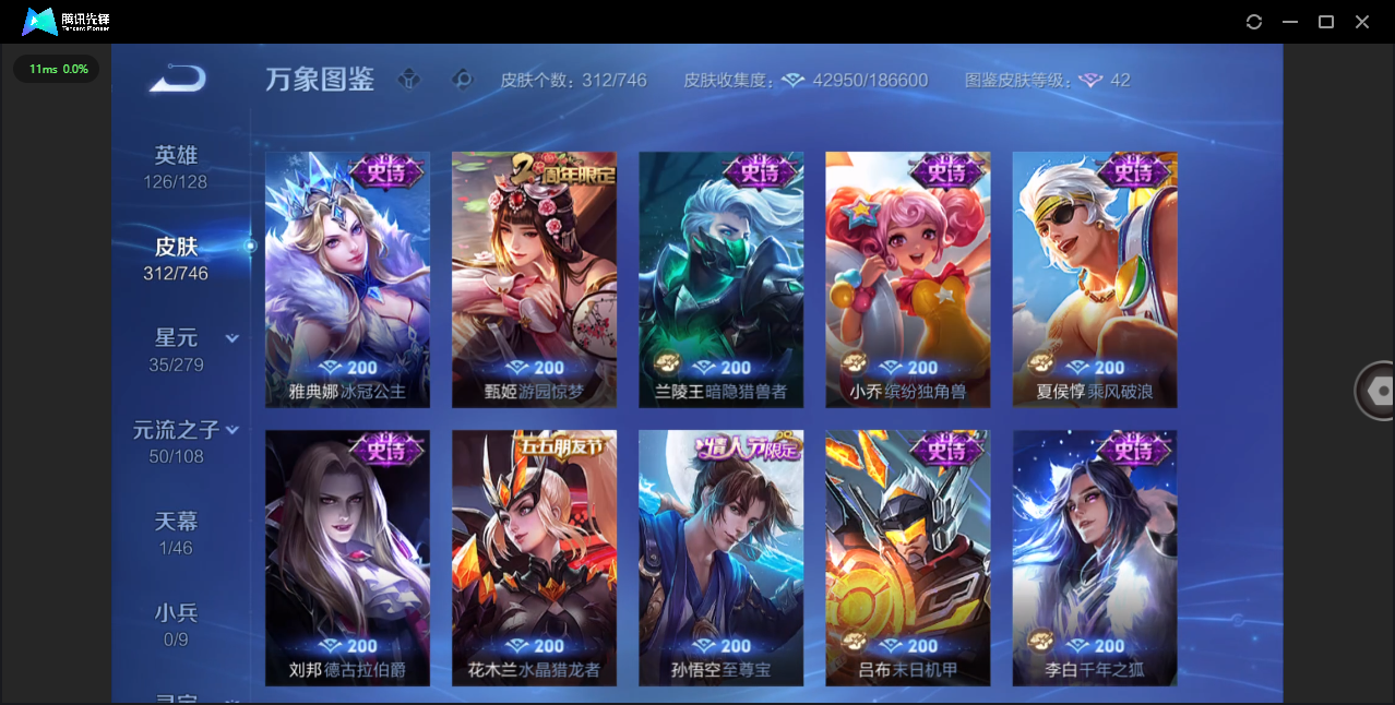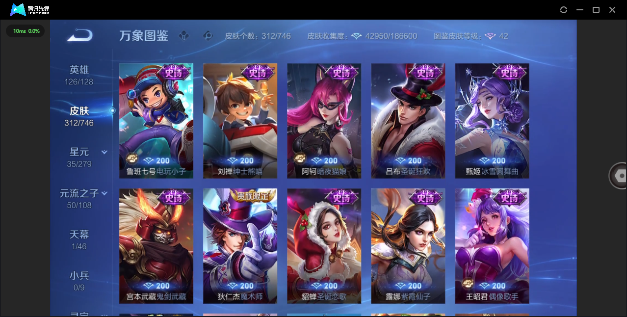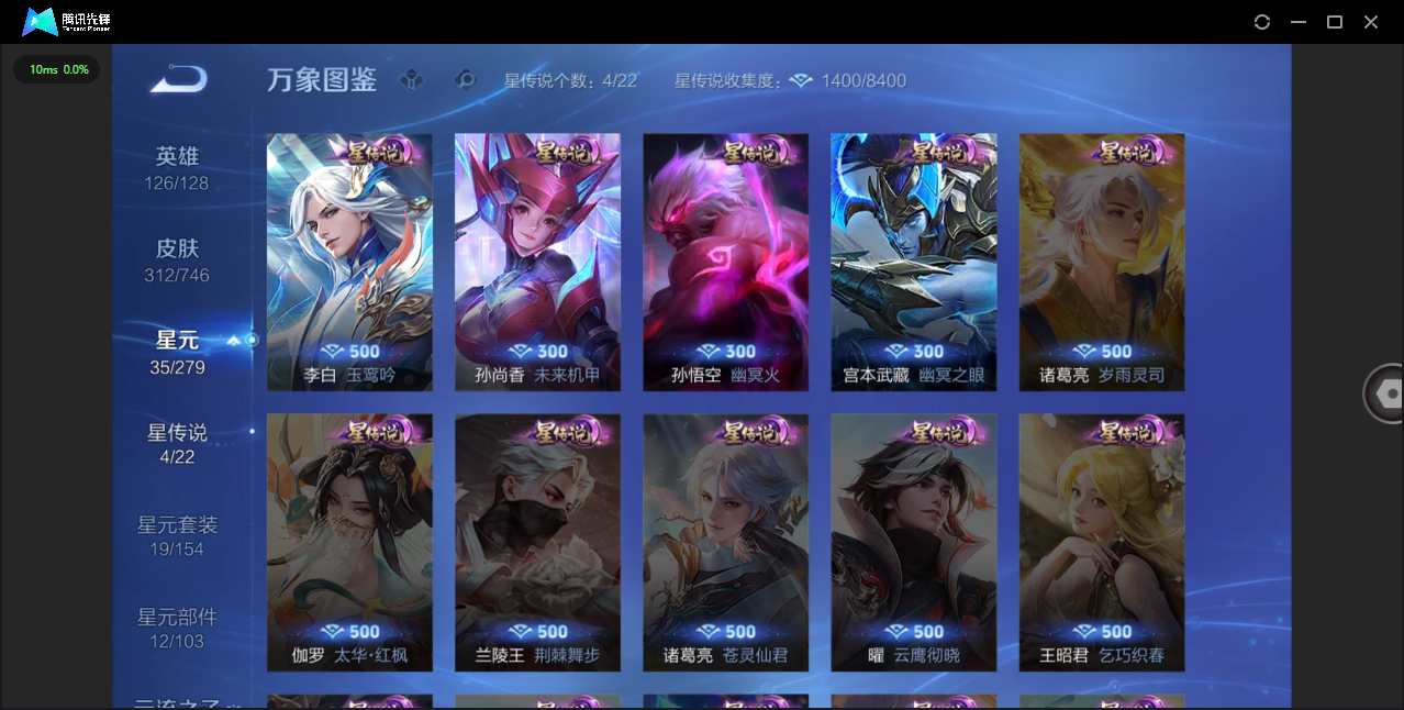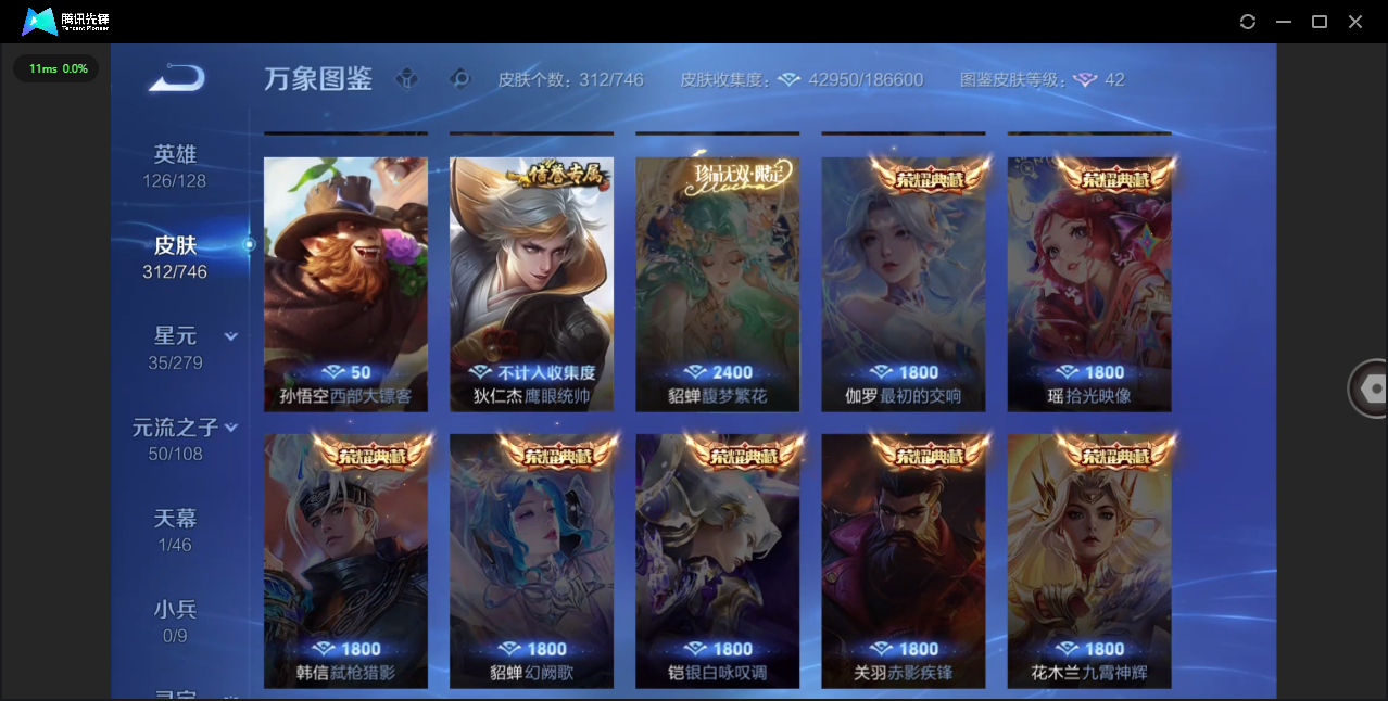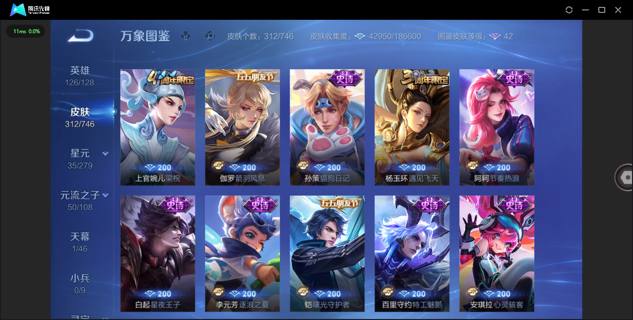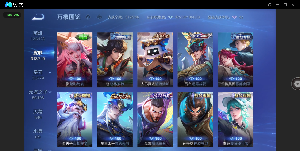 124英雄-312皮肤-安卓qq/非凡王者/312皮肤/124英雄/1典藏/0珍品无双/0无双/1珍品传说/16传说/83史诗/8稀有英雄【1 珍品传说】怪盗基德 马可波罗【1 典藏皮肤】神鉴启示录 虞姬【16 传说皮肤】启明星使 虞姬无双飞将 马超地狱火 孙悟空云鹰飞将 曜凤求凰 李白诗剑行 李白地狱之眼 宫本武藏黄金射手座 后羿黄金狮子座 达摩绯月行 不知火舞久胜战神 干将莫邪末日机甲 孙尚