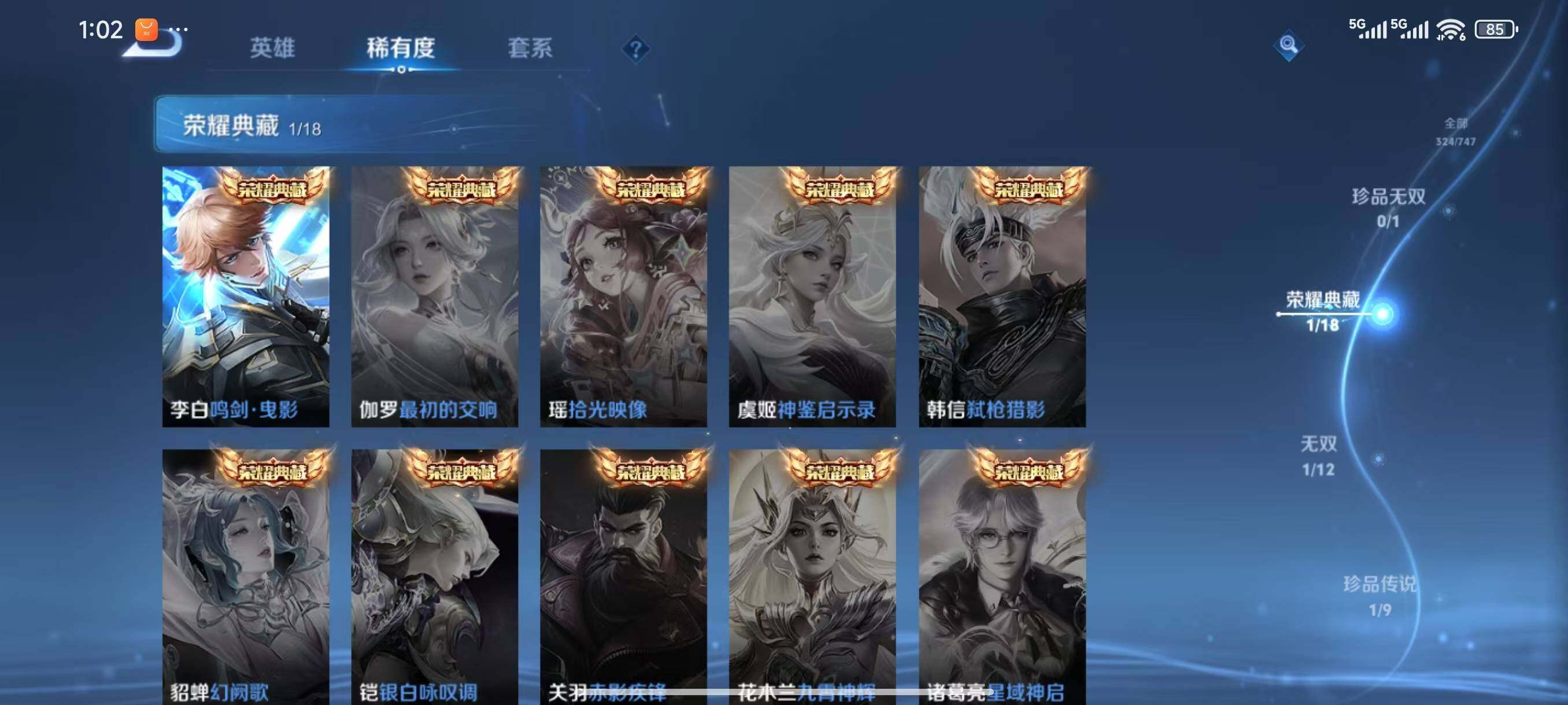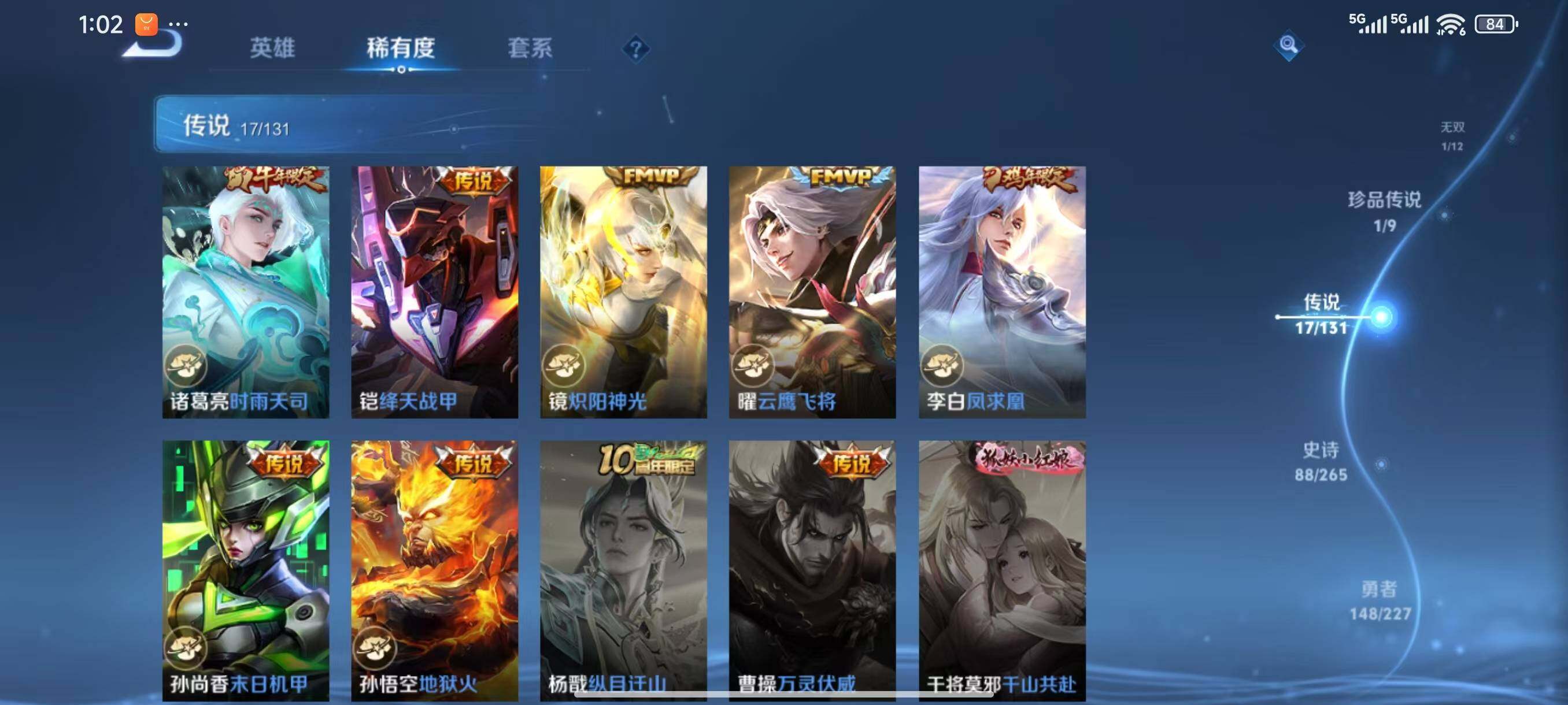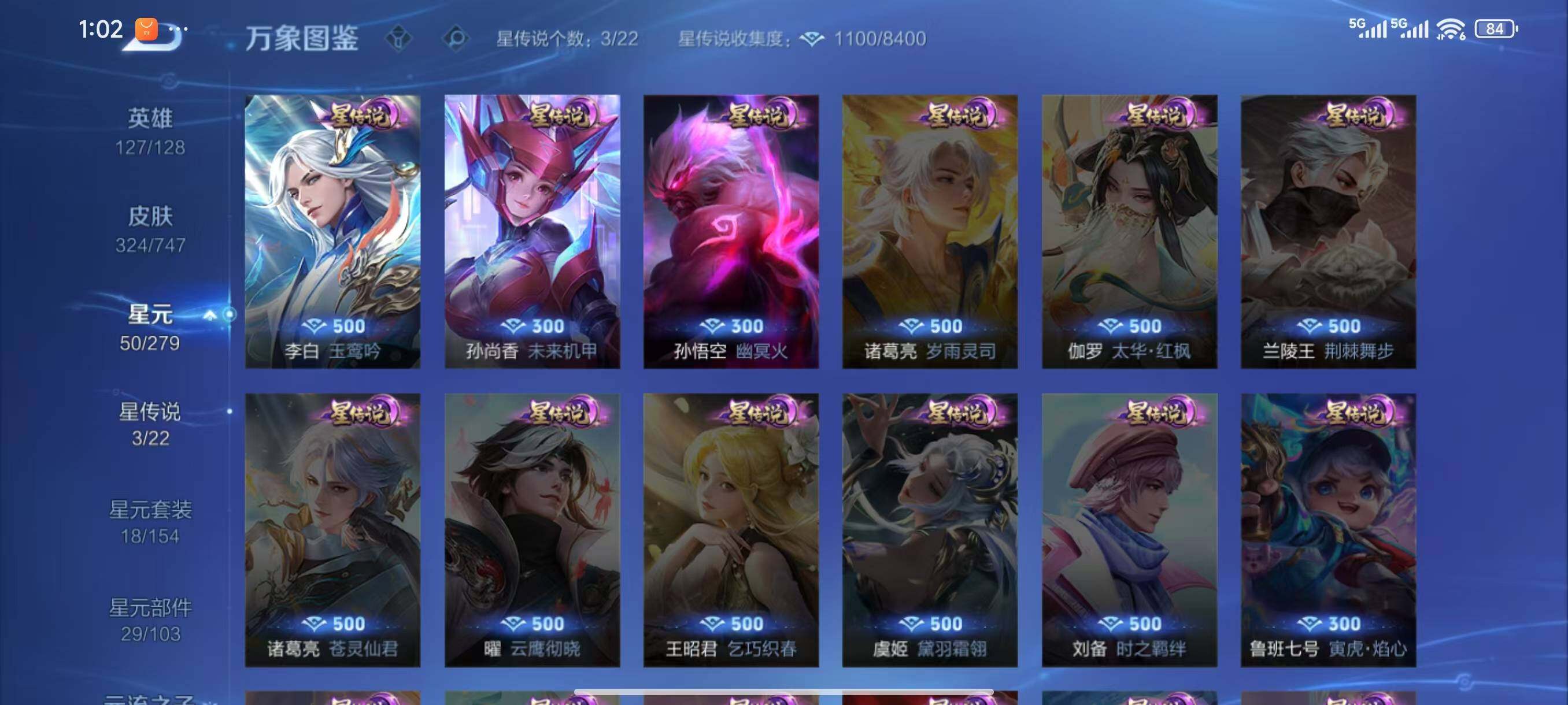 127英雄-324皮肤-金标李白,安卓q-v7-最强王者段位-127英雄-324皮肤-1典藏皮肤-1无双-1珍品传说-17传说-88史诗 【英雄全皮】:孙权全皮,猪八戒全皮,蒙恬全皮 【荣耀典藏】:李白鸣剑曳影 【无双皮肤】:曜器灵螭龙剑 【珍品传说】:马可波罗怪盗基德 【传说皮肤】:后羿神树通天,妲己愿照众生和,澜愿照九