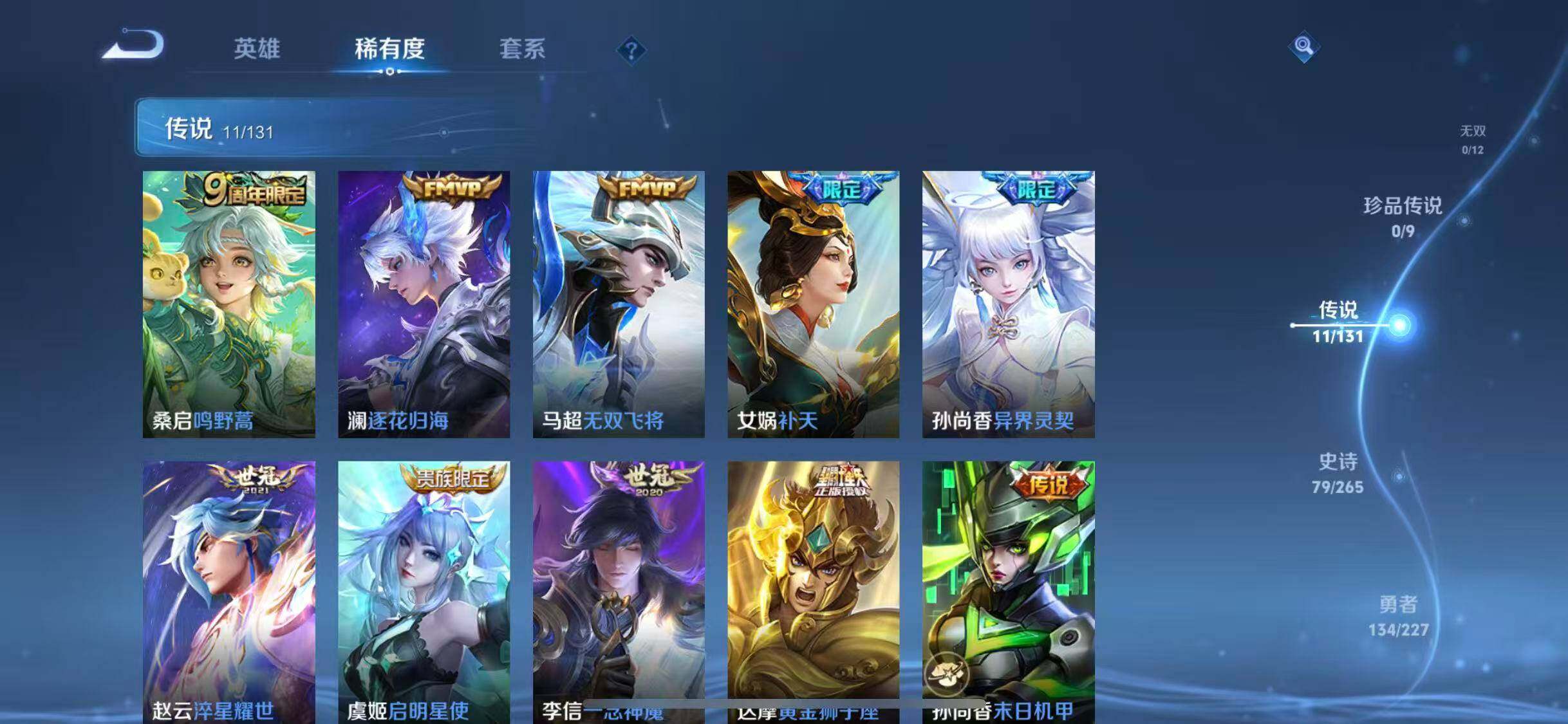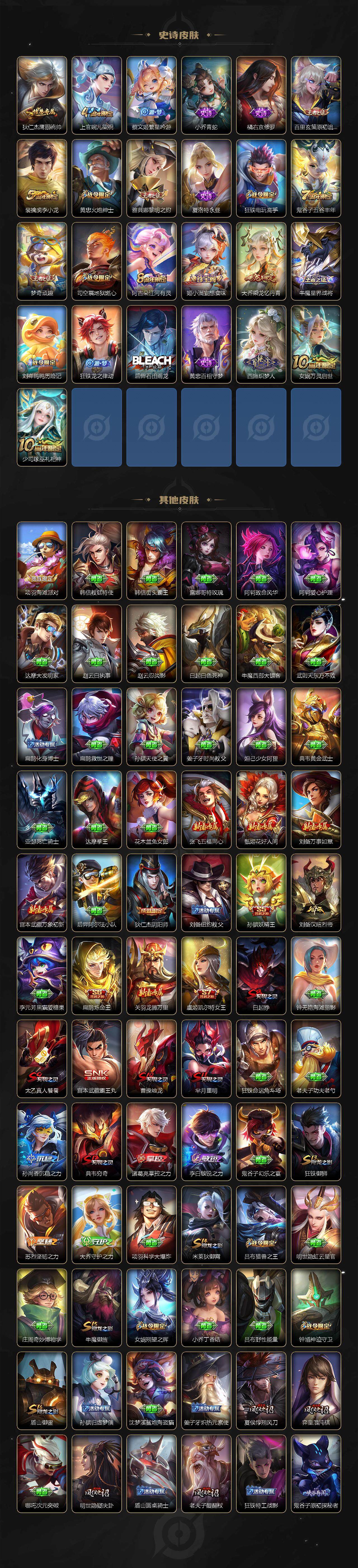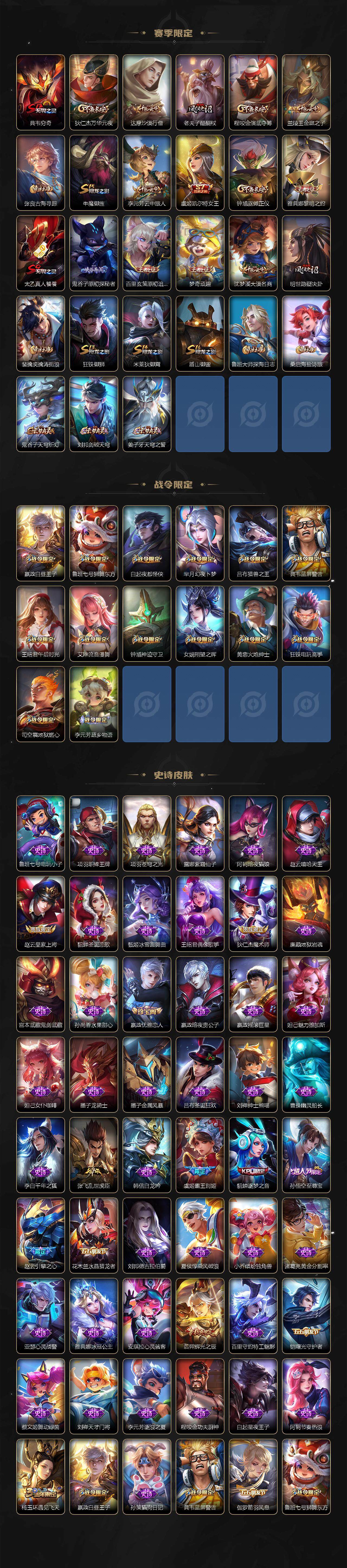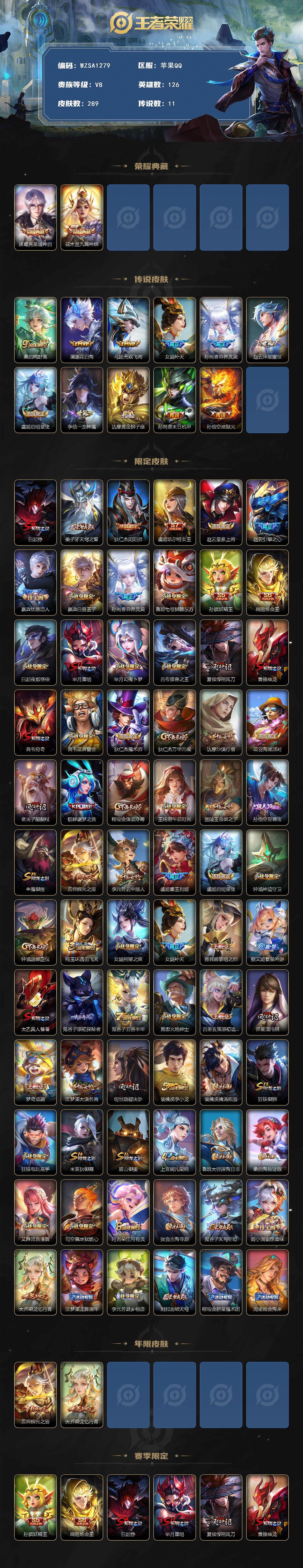 126英雄-289皮肤-【wzsa1279】贵族8/皮肤289/典藏2/传说11/史诗79/英雄126/鬼谷子全皮/狂铁全皮/空空儿全皮/影全皮/诸葛亮-星域神启/花木兰-九霄神辉/桑启鸣野蒿/澜-逐花归海/马超-无双飞将/女娲-补天/孙尚香-异界灵契/赵云-淬星耀世/虞姬-启明星使/李信-一念神魔/达摩-黄金狮子座/孙尚香-末日机甲/孙悟空-地狱火/白起-狰/姜子牙天穹之誓/狄仁杰-阴阳师/虞姬-凯尔特女王/赵云-