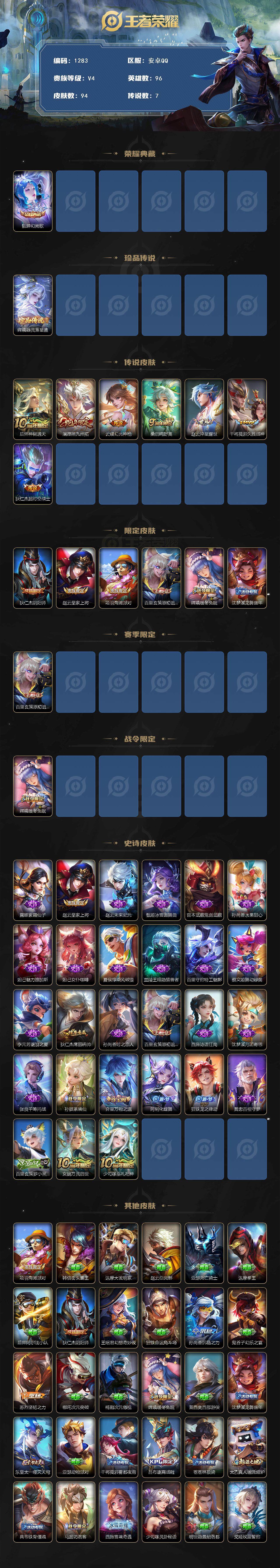 96英雄-94皮肤-贵族4/皮肤94/典藏1/传说7/史诗27/英雄96/幻阙歌 貂蝉/器灵·落星盏 嫦娥/神树通天 后羿/愿照·九州拓 澜/幻光神呛 云缨/鸣野蒿 桑启/淬星耀世 赵云/久胜战神 干将莫邪/超时空战士 狄仁杰/阴阳师 狄仁杰/皇家上将 赵云/海滩派对 项羽/原初追逐者 百里玄策/暖冬·兔眠 嫦娥/龙舞盛年 沈梦溪/紫霞仙子 露娜/未来纪元 赵云/冰雪圆舞曲 甄姬/鬼剑武藏 宫本武藏/水果甜心 孙