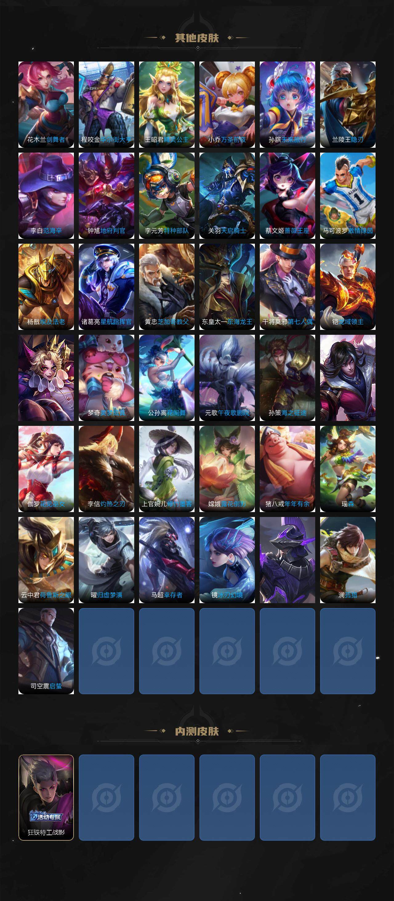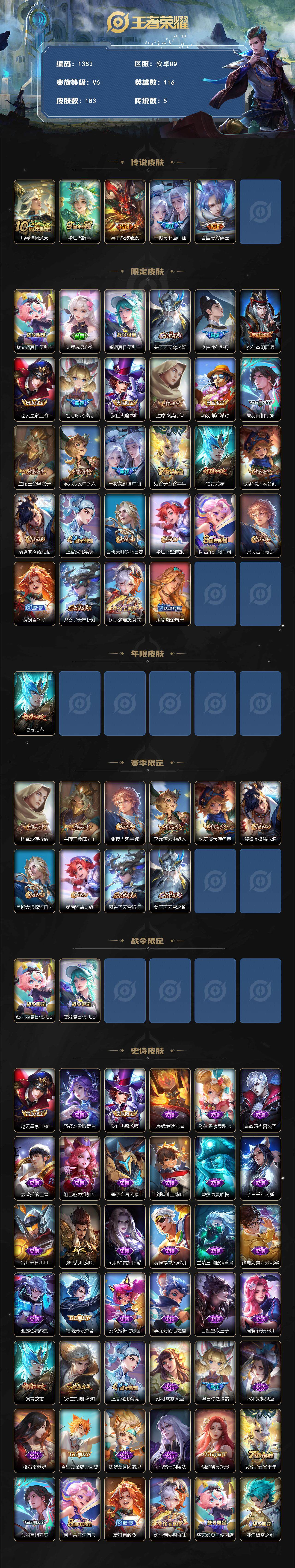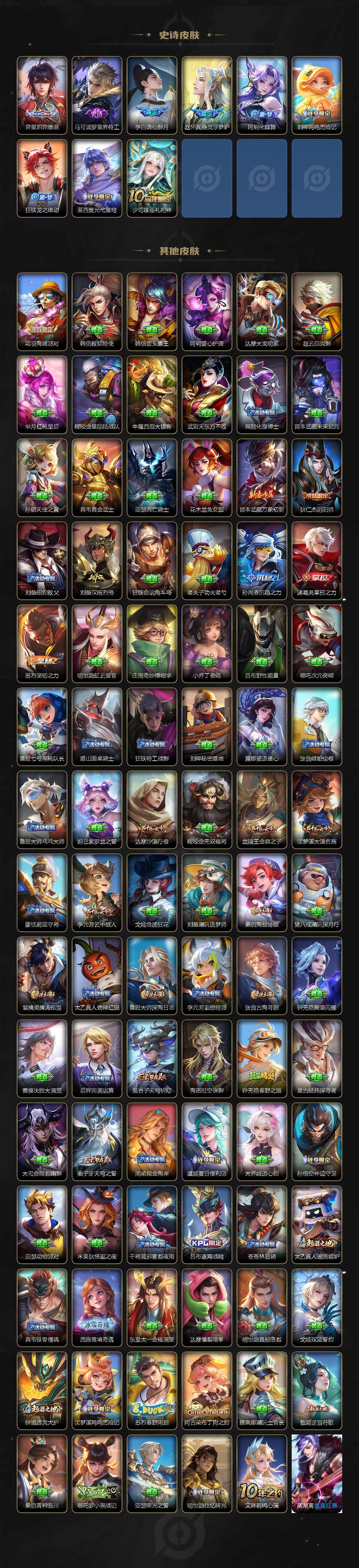 116英雄-183皮肤-贵族6/皮肤183/传说5/史诗51/英雄116/神树通天 后羿/鸣野蒿 桑启/战鼓燎原 典韦/画中仙 干将莫邪/碎云 百里守约/夏日便利店 蔡文姬/绒语心约 大乔/夏日便利店 虞姬/天穹之誓 姜子牙/谪仙醉月 李白/阴阳师 狄仁杰/皇家上将 赵云/时之彼端 妲己/魔术师 狄仁杰/沙漠行僧 达摩/海滩派对 项羽/百相守梦 关羽/金庭之子 兰陵王/云中旅人 李元芳/五谷丰年 鬼谷子/青龙志 铠/