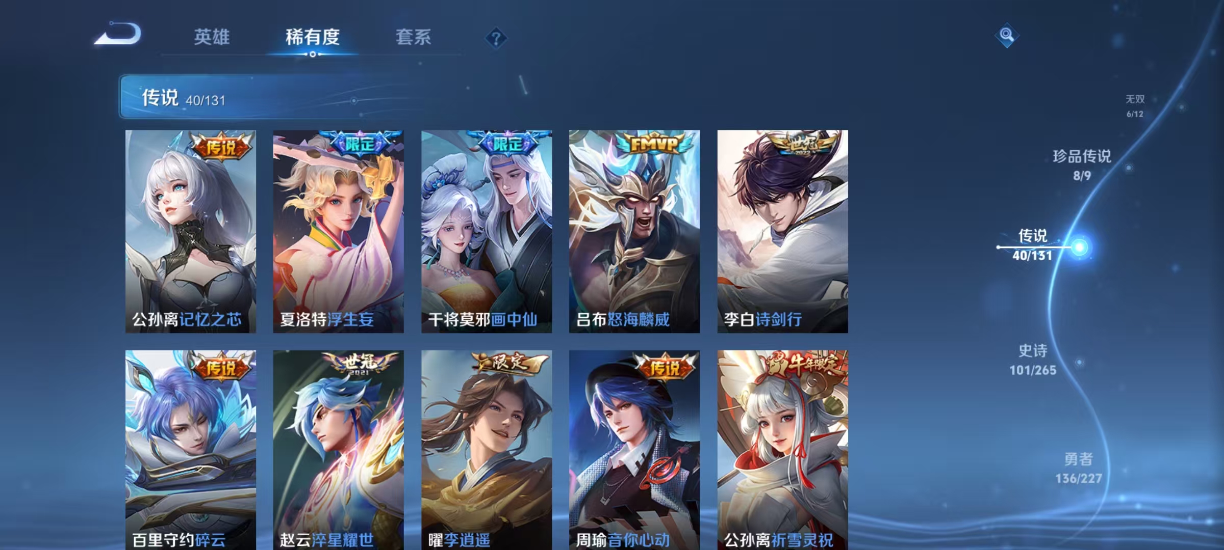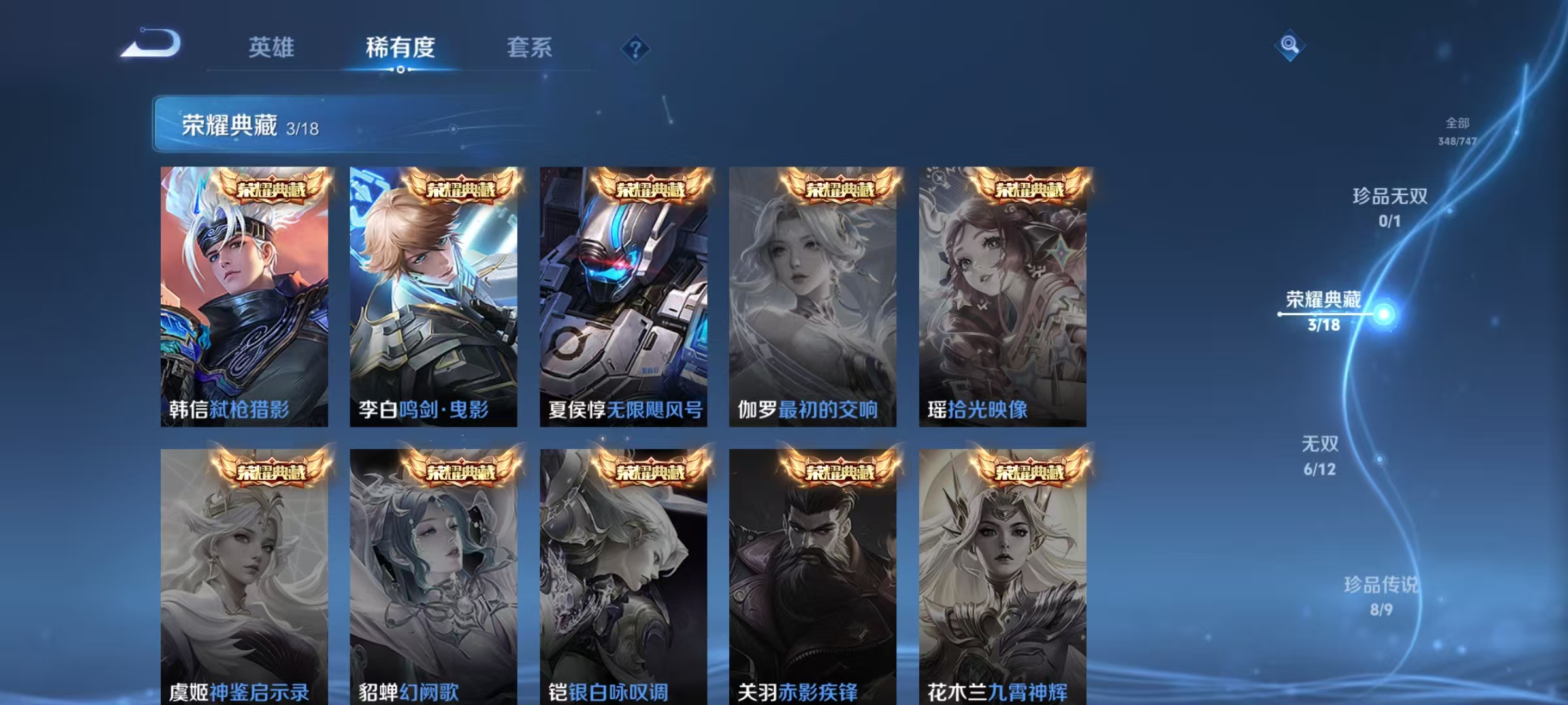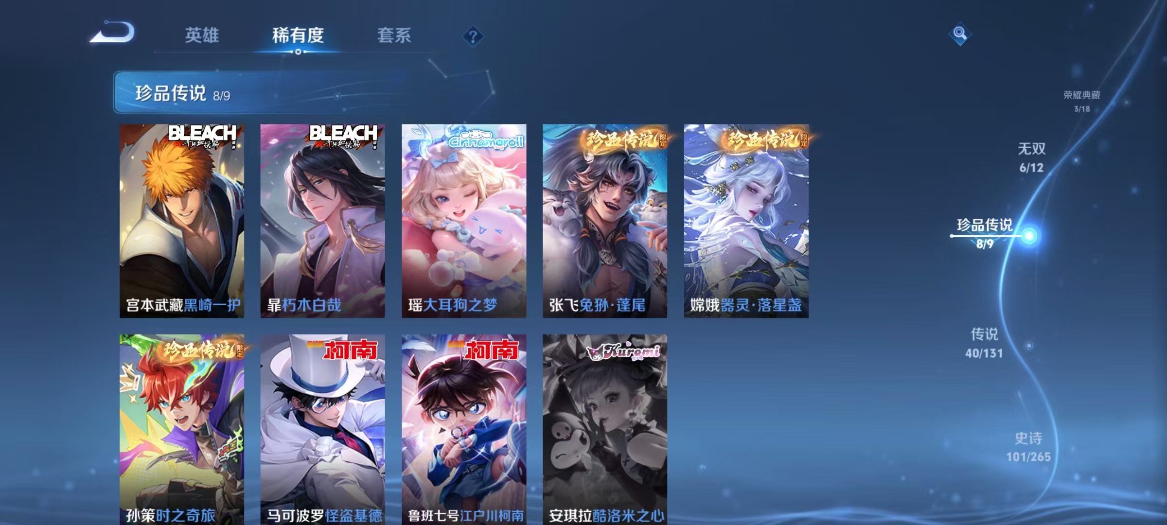 v9 精氪号 背包亲密度道具多多 348皮 3典藏(弑呛猎影 鸣剑·曳影 无限飓风号)6无双(时之魔女 群星魔术团 神罪 雪境奇遇 天机白泽 器灵·螭龙剑)8珍品(器灵·落星盏 黑崎一护 怪盗基德 时之奇旅 兔狲·蓬尾 江户川柯南 朽木白哉 大耳狗之梦)40传说(久胜战神 超时空战士 牧神诗旅 千山共赴 时雨天司 鸣野蒿 遇见神鼓 霜月吟 时之奇旅 鹤羽星尊 百相守梦 冥王哈迪斯 怒海麟威 浮生妄 淬星耀世 画中仙 记忆之芯 霜北刀 李 纵目迁山 云诺千山 碎云 黄金天蝎座 祈雪灵祝 末日机甲 愿照·山河定 神树通天 黄金射手座 音你心动 启明星使 万灵伏威 愿照·千秋盛 地狱之眼 琥珀纪元 愿照·岁时盈 一念神魔 妄想实况 云鹰飞将 黄金白羊座 诗剑行)101史诗(飞衡 青春决赛季 傲雪梅呛 至尊宝 御风骁将 山海·玄木吟 大圣娶亲 谪仙醉月 东方月初 埋骨钱)棉花糖聚会天幕 怪盗基德天幕