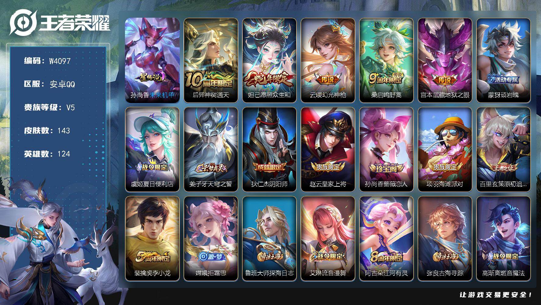 124英雄-143皮肤-【w4097】安卓qq-有二次-贵5-124英雄-143皮肤-5传说-1星元-53限定-6按键-灵宝-6印记-6614贵族积分-营地-热门皮肤-妲己愿照·众生和,云缨幻光神呛,宫本武藏地狱之眼,公孙离涂山容容,西施织梦人,朵莉亚幻珠鲛人,赵怀真器灵·浮梦炉,吕布末日机甲,妲己女仆咖啡 【星元皮肤】:孙尚香未来机甲