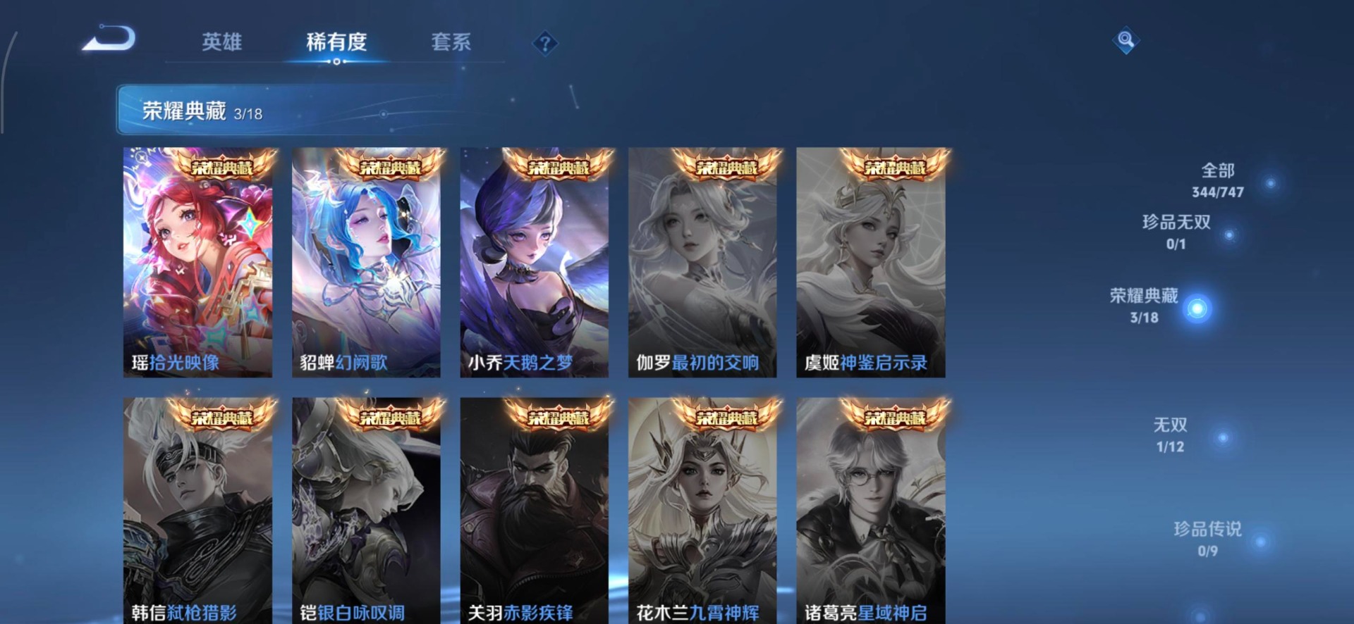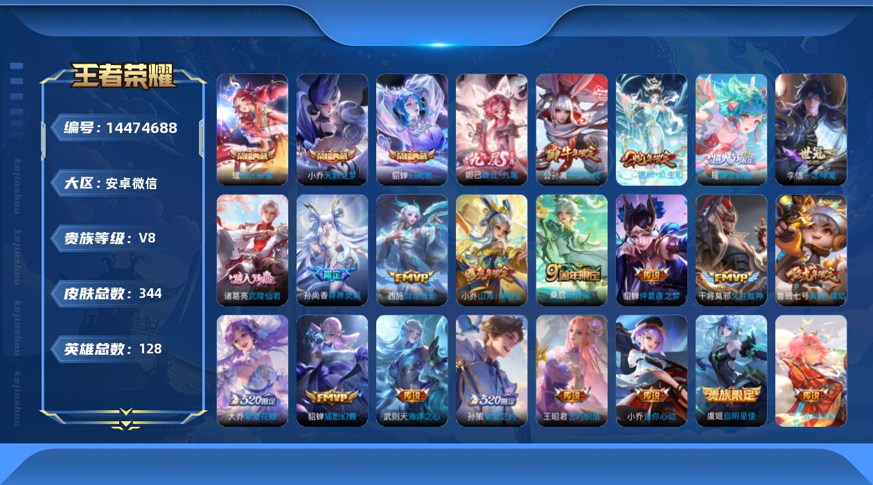 v8 3典藏 1无双 22传说 128英雄 344皮肤 典藏英雄武则天 可修改实名 【英雄全皮】:敖隐全皮猪八戒全皮 【稀有英雄】:敖隐小龙人大司命嬴政始皇帝韩信韩跳跳夏洛特夏师傅艾琳橘右京橘子娜可露露鸟人不知火舞赵云金蝉唐僧戈娅 【荣耀水晶】: