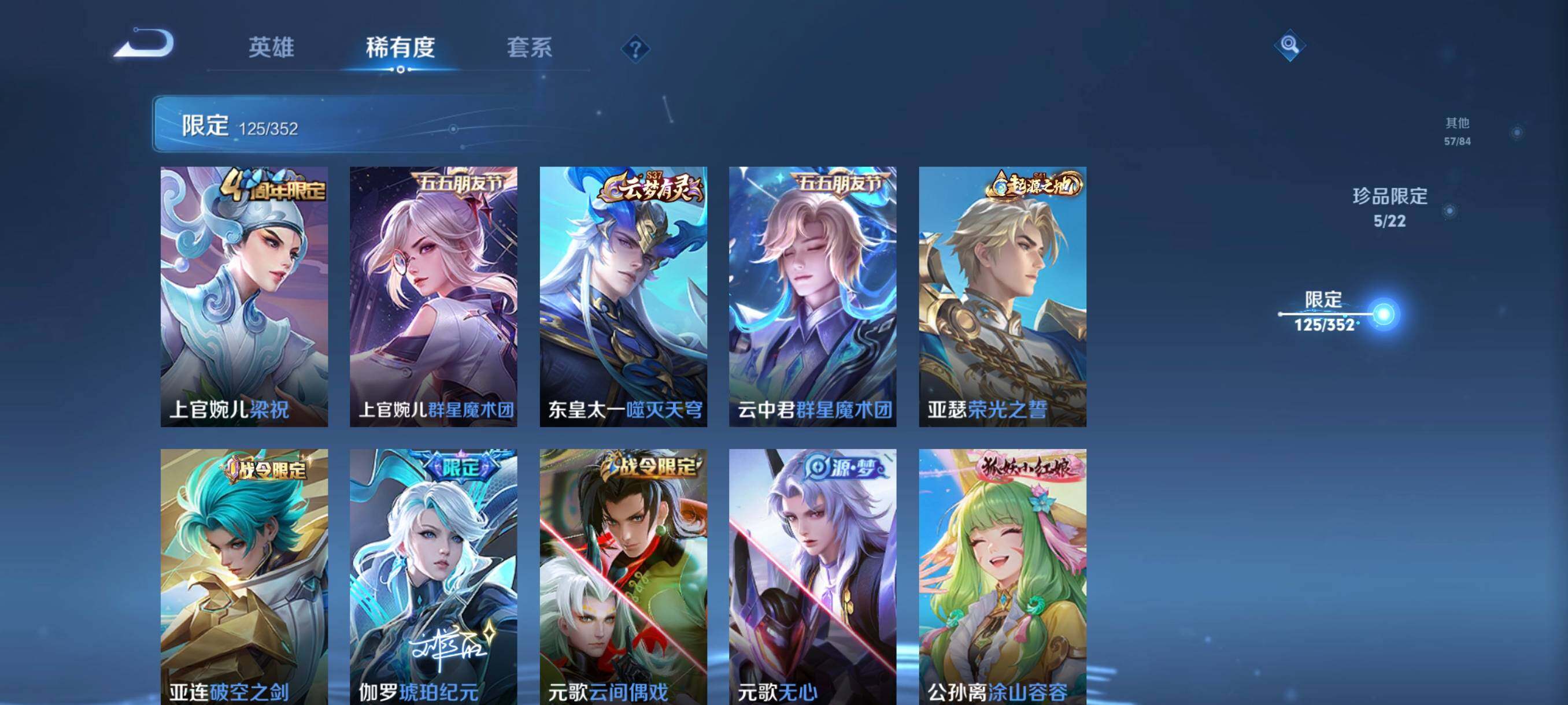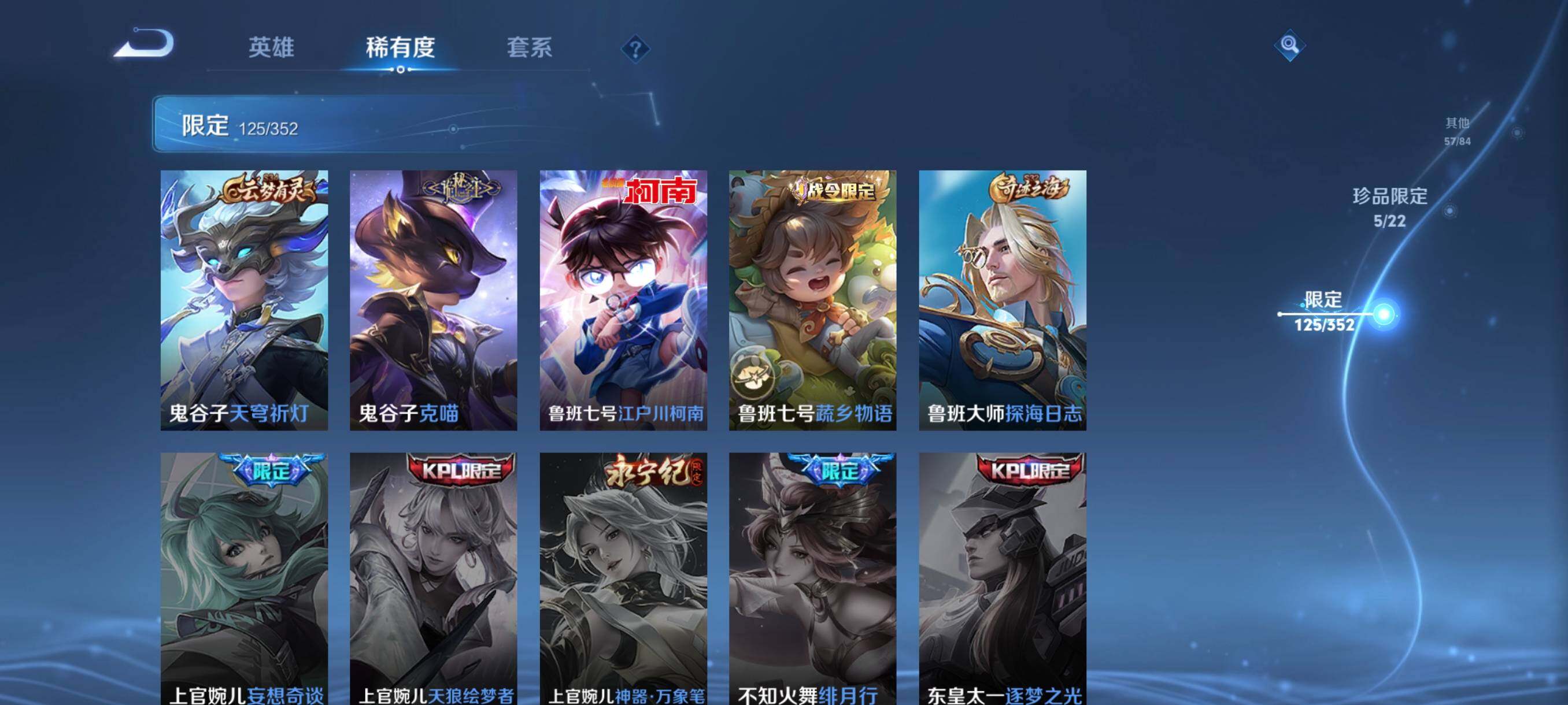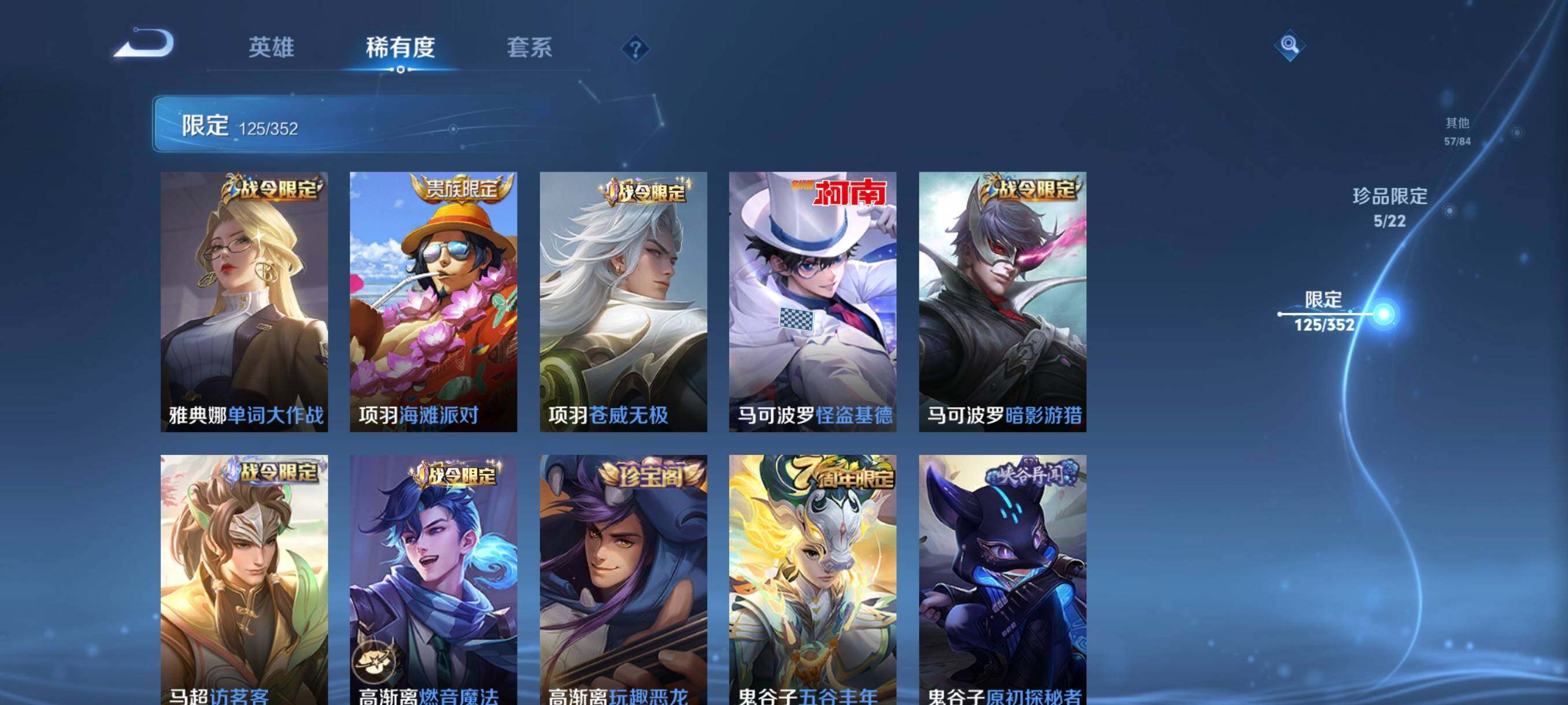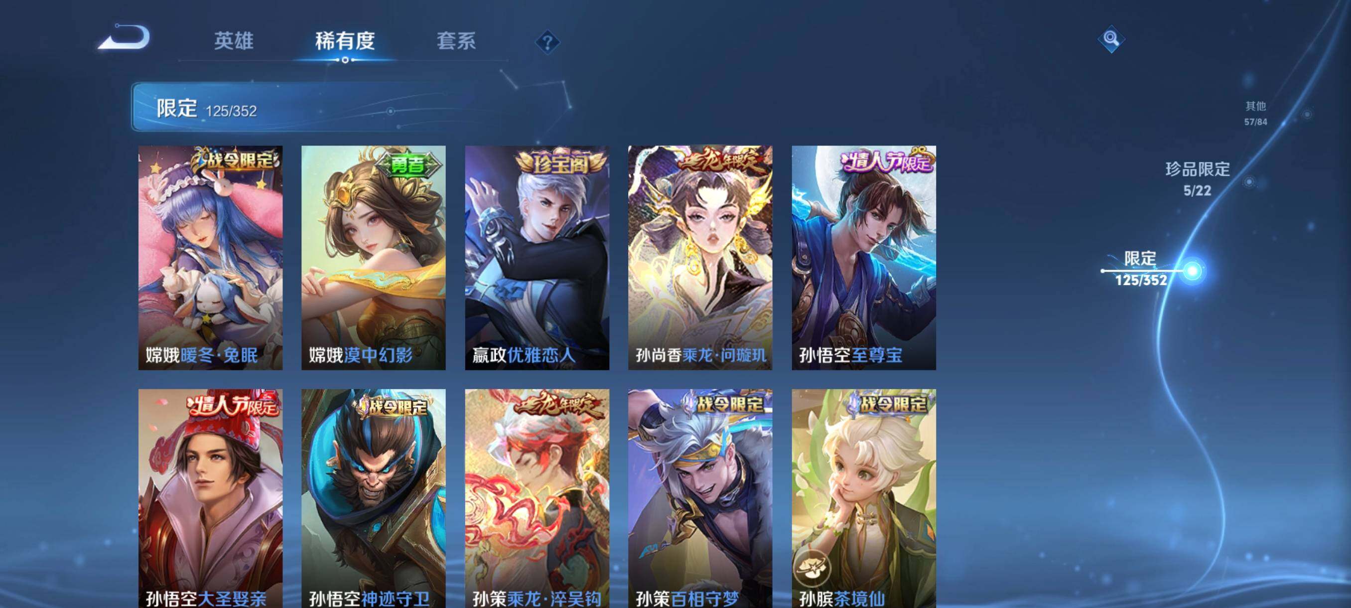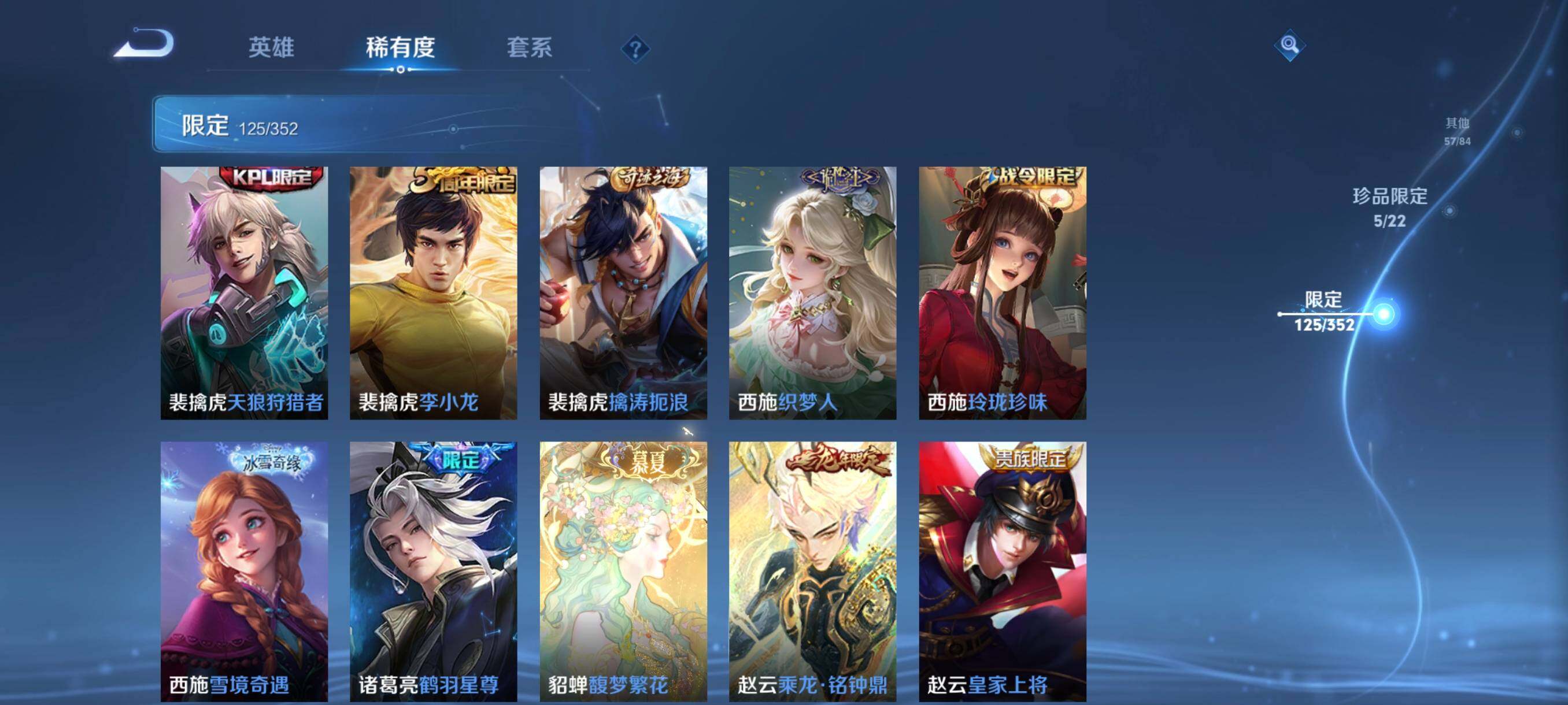 127英雄-334皮肤-账号亮点:34按键 孙悟空全息碎影,诸葛亮星域神启 貂蝉馥梦繁花 李白碎月剑心,韩信群星魔术团 马可波罗怪盗基德,鲁班七号江户川柯南 后羿神树通天,公孙离云诺千山,女娲愿照千秋盛,云缨幻光神呛,桑启鸣野蒿,云中君群星魔术团,孙尚香乘龙问璇玑,孙策乘龙淬吴钩,赵云乘龙铭钟鼎,澜逐花归海,诸葛亮鹤羽星尊,李信山海炽霜斩,马超无双飞将,曜李 ,镜炽阳神光,虞姬启明星使,李信一念神魔,干将莫邪久胜
