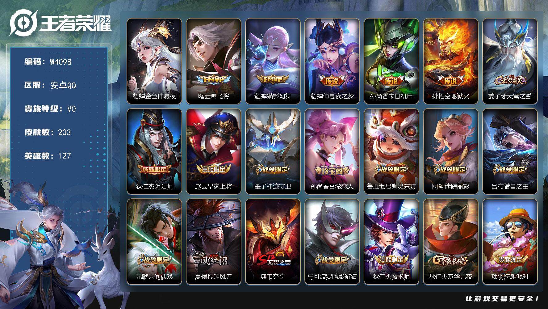127英雄-203皮肤-【w4098】安卓qq-有二次-贵7-127英雄-203皮肤-5传说-1星元-56限定-2按键-灵宝-5印记-3.5万贵族积分-营地-热门皮肤-曜云鹰飞将,貂蝉猫影幻舞,貂蝉仲夏夜之梦,孙尚香未日机甲,孙悟空地狱火,马超神威,孙尚香时之恋人,公孙离无限星赏官,安琪拉魔法小厨娘,妲己女仆咖啡 【星元皮肤】:貂蝉金色仲夏夜