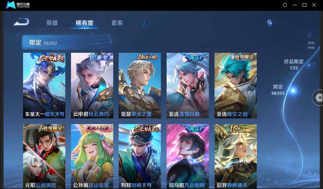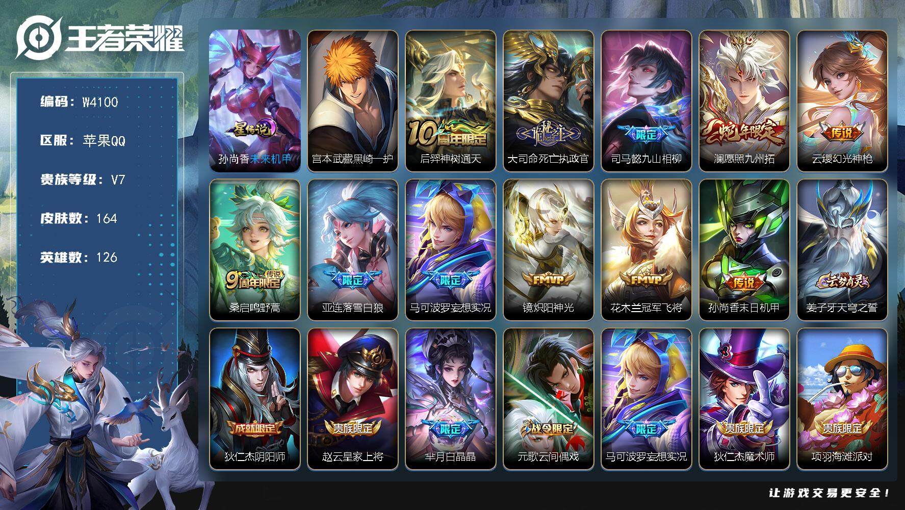 126英雄-164皮肤-【w4100】宫本武藏黑崎一护-苹果qq-有二次-贵7-126英雄-164皮肤-1珍品传说-11传说-1星元-58限定-10按键-灵宝-2印记-2.2万贵族积分-营地-热门皮肤-大司命死亡执政官,司马懿九山相柳,澜愿照·九州拓,云缨幻光神呛,亚连落雪白狼,马可波罗妄想实况,镜炽阳神光,孙悟空至尊宝 【星元皮肤】:孙尚香未来机甲
