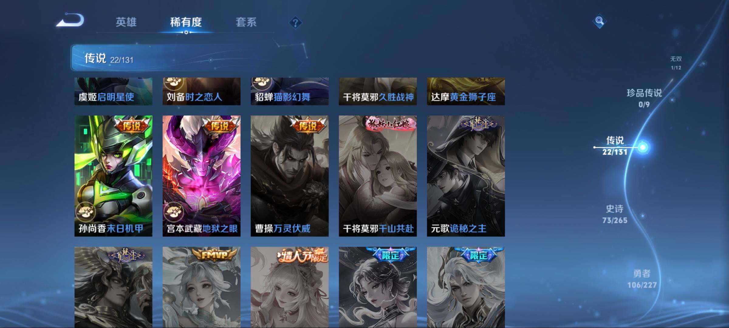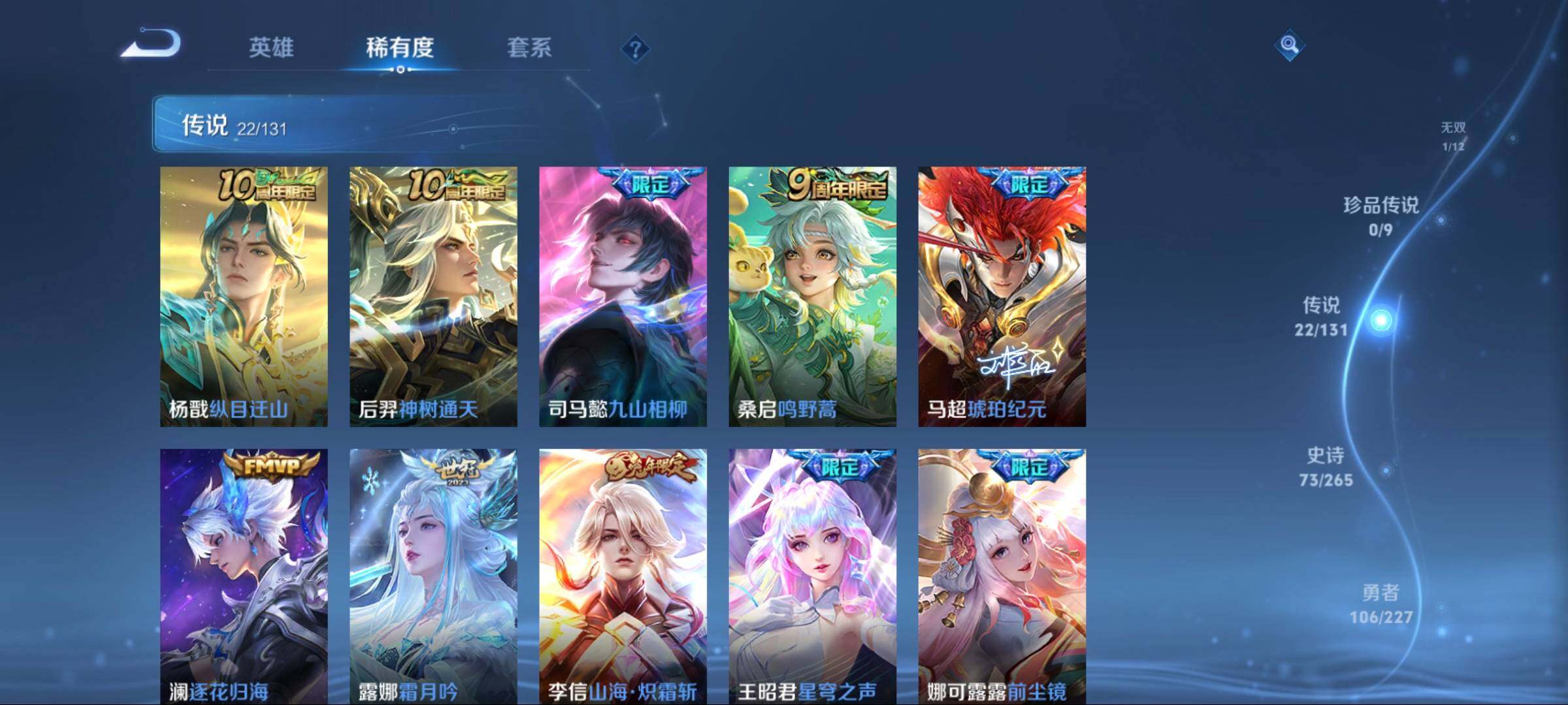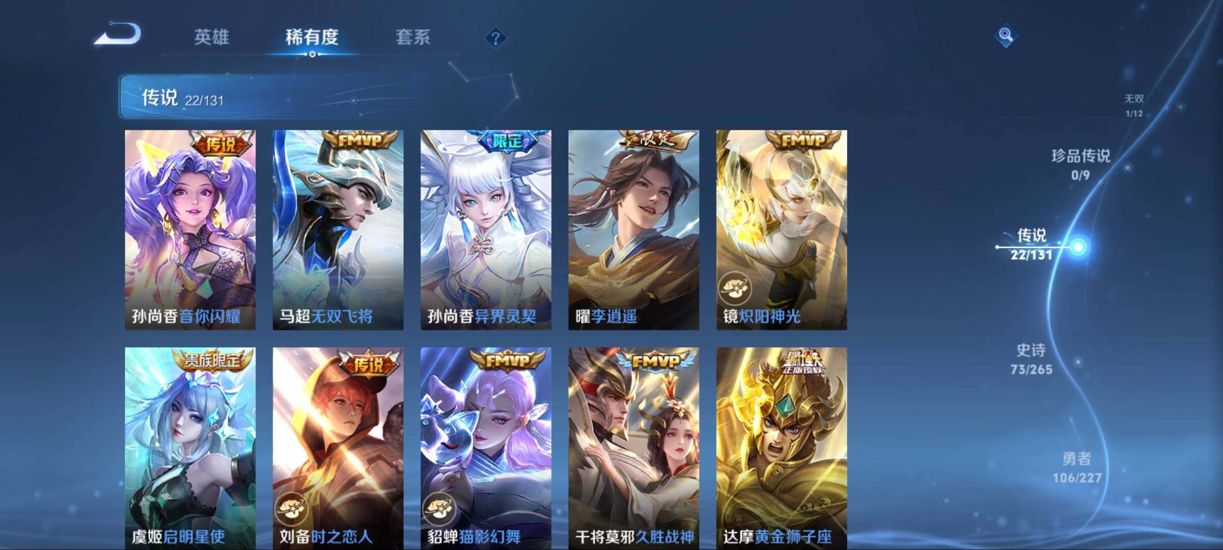 127英雄-257皮肤-账号亮点:连体号 韩信弑呛猎影 曜器灵螭龙剑 杨戬纵目迁山,后羿神树通天,司马懿九山相柳,桑启鸣野蒿,马超琥珀纪元,澜逐花归海,露娜霜月吟,李信山海炽霜斩,王昭君星穹之声,娜可露露前尘镜,孙尚香音你闪耀,马超无双飞将,孙尚香异界灵契,曜李 ,镜炽阳神光,虞姬启明星使,刘备时之恋人,貂蝉猫影幻舞,干将莫邪久胜战神,达摩黄金狮子座,孙尚香末日机甲,宫本武藏地狱之眼619-5 【英雄全皮】:蒙恬