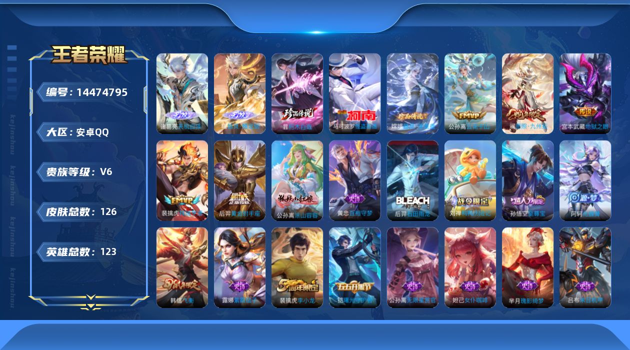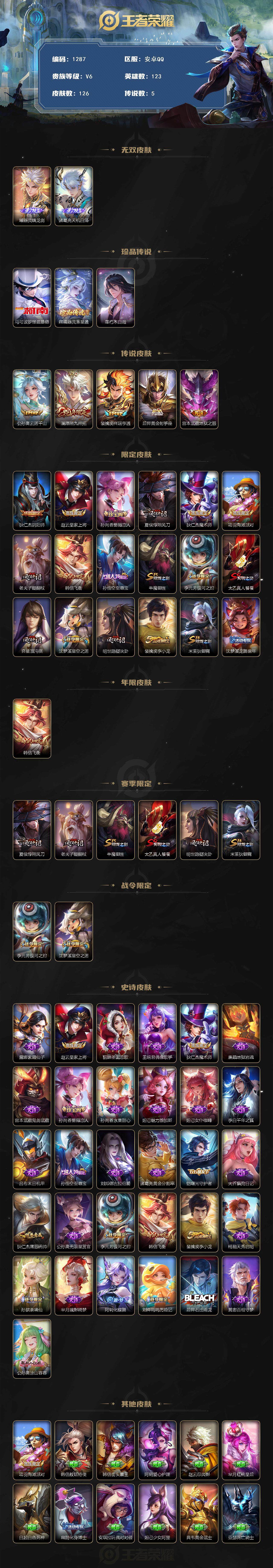 [14474795]贵族7-贵族积分30050-126皮0典藏5传说2无双3珍品传说 安卓手q198区126皮0典藏5传说2无双3珍品传说v6 营地id2134361501荣耀王者【珍品传说皮肤】:朽木白哉器灵·落星盏怪盗基德【无双皮肤】:天机白泽器灵·螭龙剑【优质限定皮肤】:至尊宝【传说皮肤】:地狱之眼云诺千山黄金射手座愿照·九州拓祥瑞亨通【史诗皮肤】:猫狗日记蔷薇恋人李