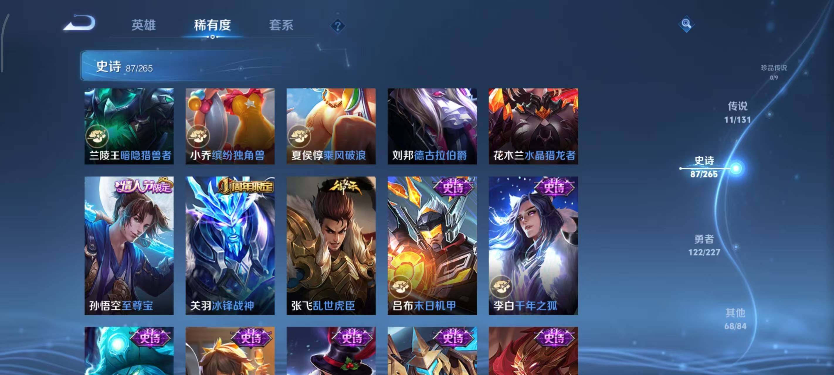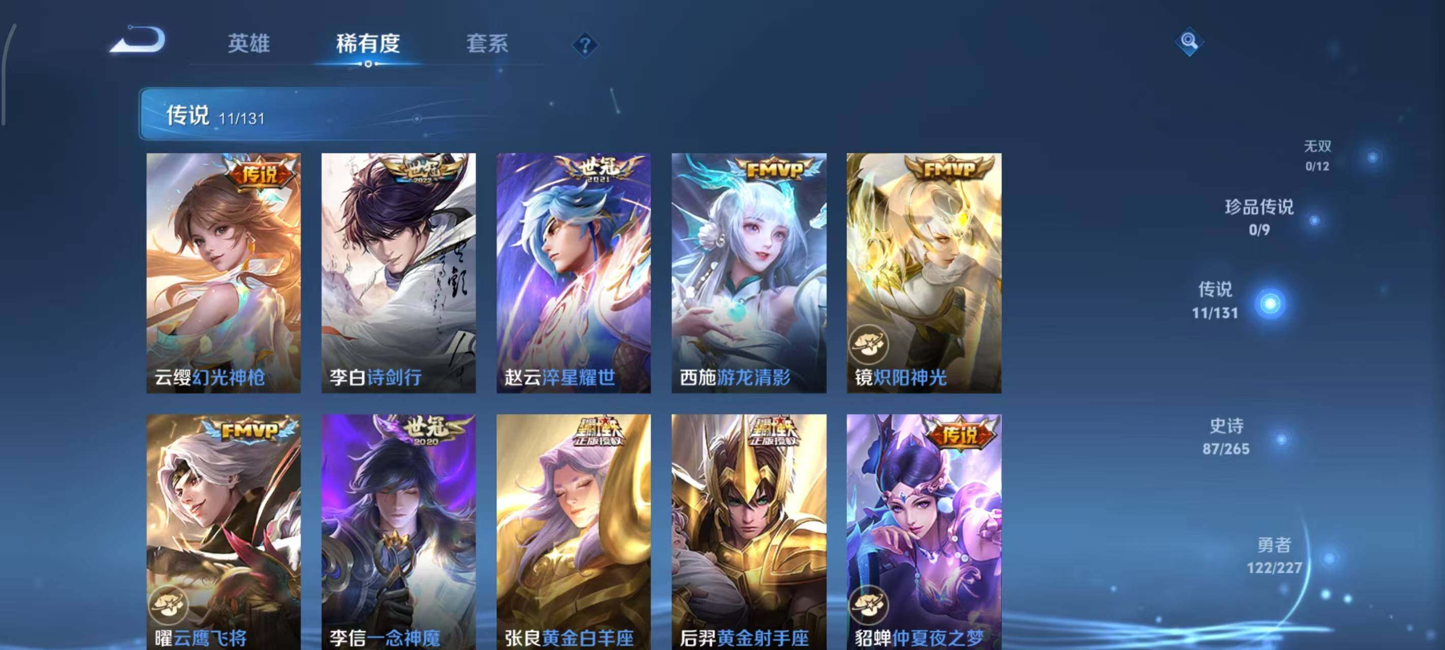 126英雄-289皮肤-安卓q-v7-289皮肤-1典藏皮肤-11传说-87史诗 【英雄全皮】:刘禅全皮,刘邦全皮,空空儿全皮 【荣耀典藏】:铠银白咏叹调 【传说皮肤】:云缨幻光神呛,李白诗剑行,赵云淬星耀世,西施游龙清影,镜炽阳神光,曜云鹰飞将,李信一念神魔,张良黄金白羊座,后羿黄金射手座,貂蝉仲夏夜之梦,宫本武藏地狱之