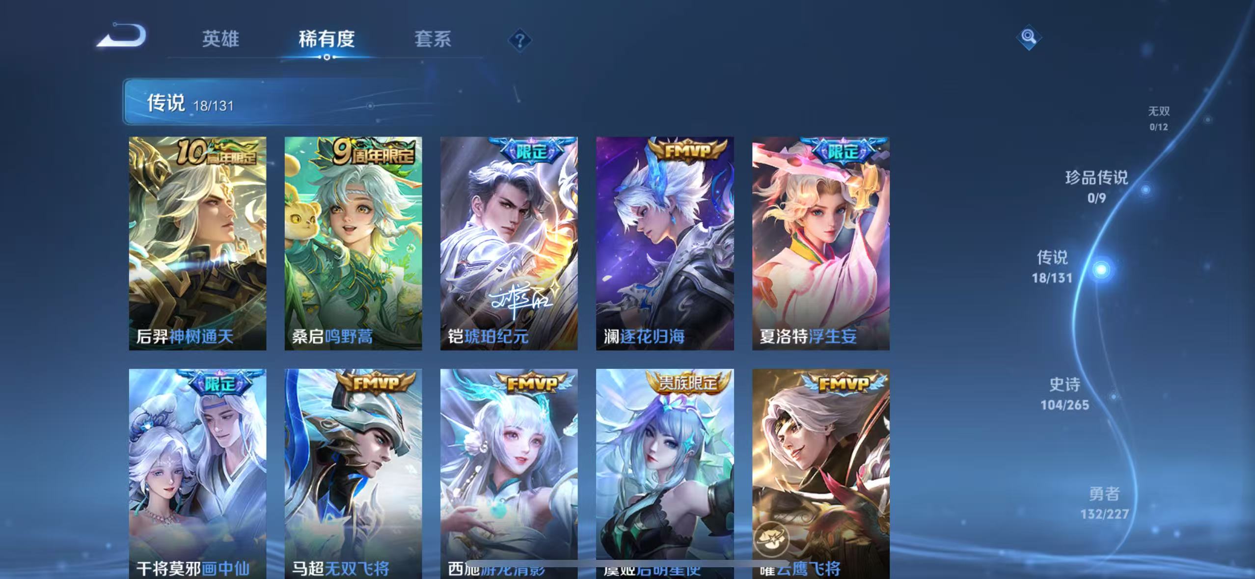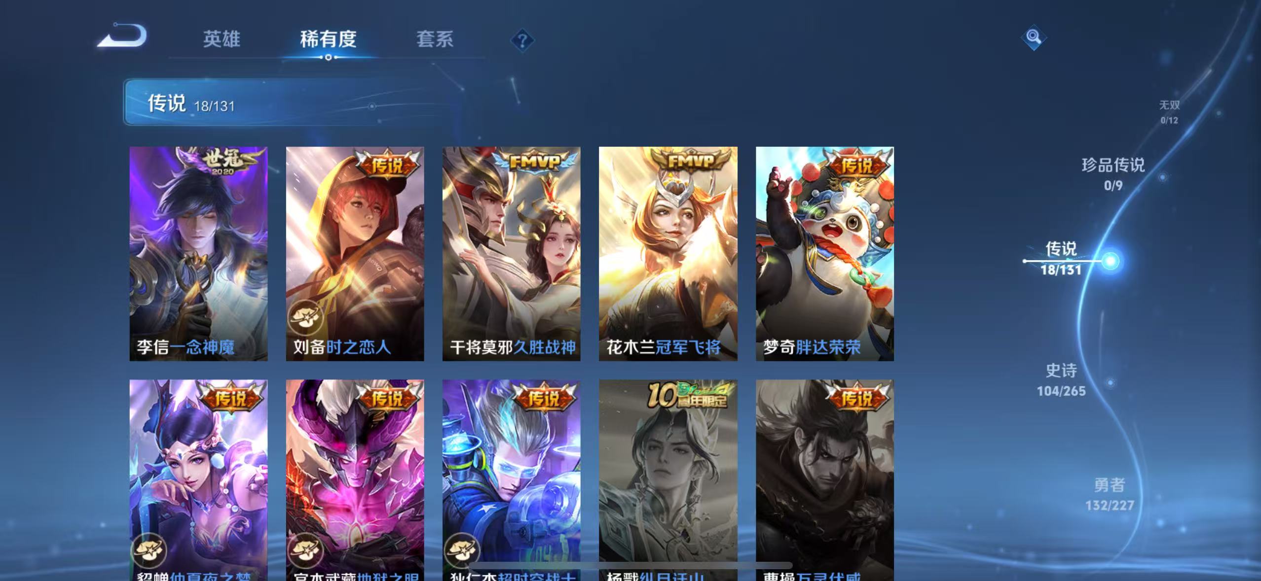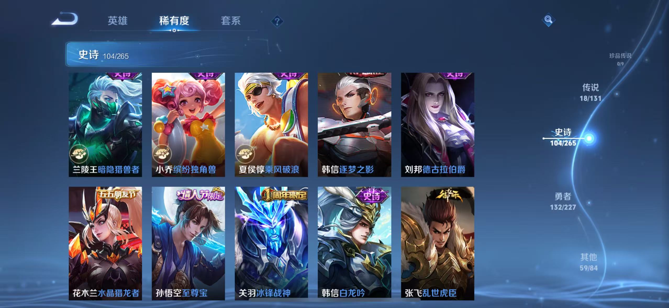 v8 打野皮肤号 314皮 1典藏(弑呛猎影)18传说(无双飞将 久胜战神 游龙清影 超时空战士 时之恋人 浮生妄 画中仙 逐花归海 胖达荣荣 仲夏夜之梦 琥珀纪元 冠军飞将 神树通天 启明星使 地狱之眼 一念神魔 云鹰飞将)104史诗(神威 一生所爱 默契交锋 冰霜恋舞曲 逐梦之影 冰锋战神 烈魂 至尊宝 逐梦之星 天狼溯光者 大圣娶亲)