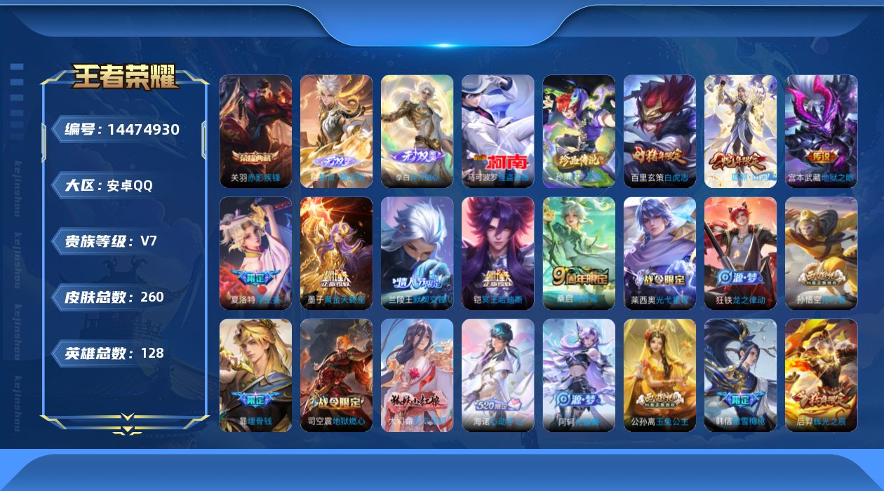 [14474930]贵族7-金标兰陵王-260皮-1典藏-8传说-2无双-2珍品传说-0珍品无双-4全皮-8改名卡-1灵宝改名卡 安卓手q149区 营地id463650430永恒钻石iii【珍品传说皮肤】:时之奇旅怪盗基德【无双皮肤】:器灵·螭龙剑碎月剑心【荣耀典藏】:赤影疾锋【优质限定皮肤】:白虎志【传说皮肤】:地狱之眼愿照·山河定浮生妄鸣野蒿默契交锋冥王哈迪斯白虎志黄金天蝎