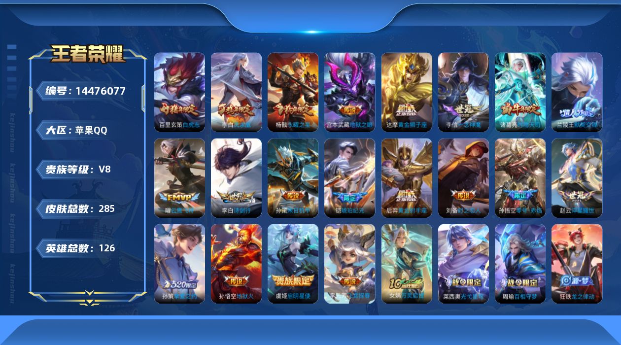 [14476077]金标宫本 玄策 积分夺宝333 苹果q-v8-285皮肤-22传说-76史诗 【英雄全皮】:孙权全皮,猪八戒全皮 【传说皮肤】:杨戬纵目迁山,后羿神树通天,铠琥珀纪元,李白诗剑行,孙策挚爱之约,孙策末日机甲,赵云淬星耀世,李元芳飞鸢探春,兰陵王默契交锋,诸葛亮时雨天司,虞姬启明星使,孙悟空零号赤焰,曜云鹰飞将,李信一念神魔,刘备时之恋人,达摩黄金狮子座,百里玄策白虎志,后羿黄金射手座,杨戬永曜之星,李白凤求凰,宫本武藏地狱之眼,孙悟空地狱火 【限定皮肤】:白起狰,姜子牙天穹之誓,狄仁杰阴阳师,虞姬凯尔特女王,赵云皇家上将,嬴政白昼王子,孙尚香蔷薇恋人,鲁班七号狮舞东方,庄周高山流水,孙膑妖精王,扁鹊炼金王,白起夜都怪侠,芈月重明,吕布猎兽之王,周瑜赤莲之焰,元歌云间偶戏,元歌无心,夏侯惇朔风刀,甄姬游园惊梦,曹操烛龙,典韦穷奇,典韦蓝屏警告,马可波罗暗影游猎,狄仁杰魔术师,狄仁杰万华元夜,达摩沙漠行僧,项羽海滩派对,老夫子醍醐杖,程咬金演武夺筹,韩信逐梦之影,韩信飞衡,韩信傲雪梅呛,兰陵王默契交锋,兰陵王驯魔猎人,兰陵王金庭之子,花木兰默契交锋,孙悟空大圣娶亲,孙悟空零号赤焰,孙悟空孙行者,牛魔御旌,后羿如梦令,李元芳银河之约,李元芳云中旅人,虞姬启明星使,钟馗神迹守卫,钟馗驱傩正仪,杨玉环遇见飞天,杨戬永曜之星,女娲朔望之晖,蔡文姬繁星吟游,太乙真人饕餮,鬼谷子原初探秘者,鬼谷子五谷丰年,诸葛亮时雨天司,苏烈千军破阵,百里玄策白虎志,百里玄策原初追逐者,百里守约朱雀志,弈星混沌棋,沈梦溪星空之诺,沈梦溪大漠名商,明世隐疑决卦,裴擒虎李小龙,狂铁御狮,米莱狄御霄,云中君纤云弄巧,云中君时之祈愿,盾山御銮,孙策挚爱之约,猪八戒西部大镖客,猪八戒猪悟能,上官婉儿梁祝,桑启海盐诗旅,艾琳女武神,艾琳流音漫舞,裴擒虎梅西,鬼谷子天穹祈灯,铠琥珀纪元,沈梦溪龙舞盛年,刘邦剑破天穹,程咬金群星魔术团 【年限皮肤】:百里玄策白虎志,百里守约朱雀志,李白凤求凰,杨戬永曜之星,诸葛亮时雨天司,韩信飞衡 【赛季限定】:孙膑妖精王,扁鹊炼金王,白起狰,芈月重明,夏侯惇朔风刀,曹操烛龙,典韦穷奇,狄仁杰万华元夜,达摩沙漠行僧,老夫子醍醐杖,程咬金演武夺筹,兰陵王金庭之子,牛魔御旌,李元芳云中旅人,虞姬凯尔特女王,钟馗驱傩正仪,太乙真人饕餮,鬼谷子原初探秘者,苏烈千军破阵,百里玄策原初追逐