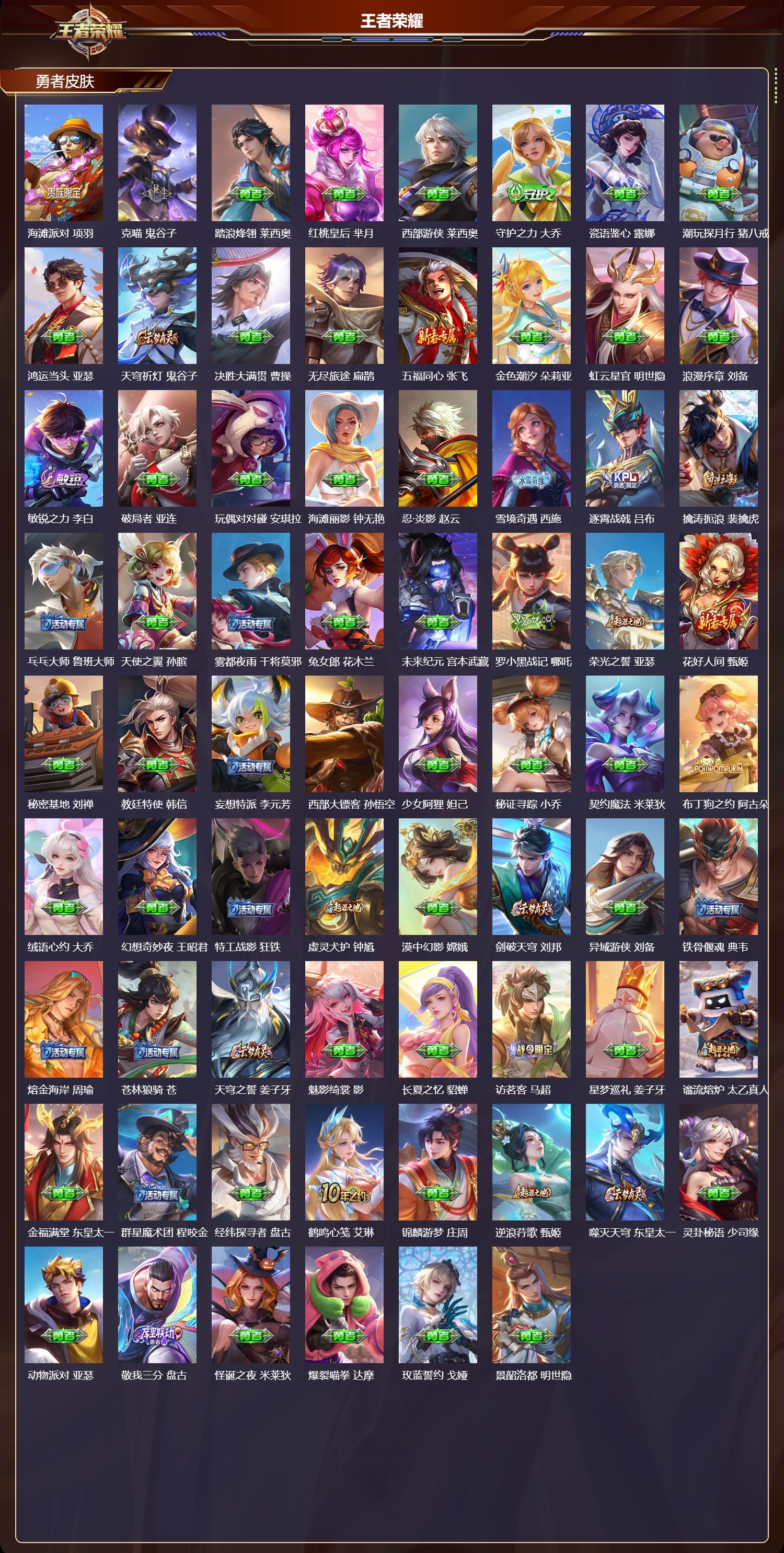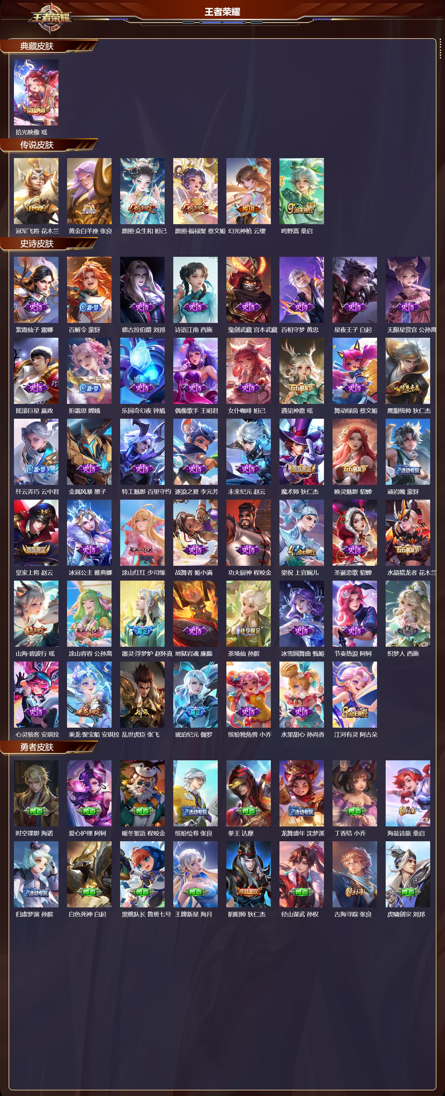 安卓qq/永恒钻石/165皮肤/123英雄/1典藏/0珍品无双/0无双/0珍品传说/6传说/47史诗/7稀有英雄【1 典藏皮肤】拾光映像 瑶【6 传说皮肤】冠军飞将 花木兰黄金白羊座 张良愿照·众生和 妲己愿照·福禄聚 蔡文姬幻光神呛 云缨鸣野蒿 桑启【47 史诗皮肤】紫霞仙子 露娜百解令 蒙犽德古拉伯爵 刘邦诗语江南 西施鬼剑武藏 宫本武藏百相守梦 黄