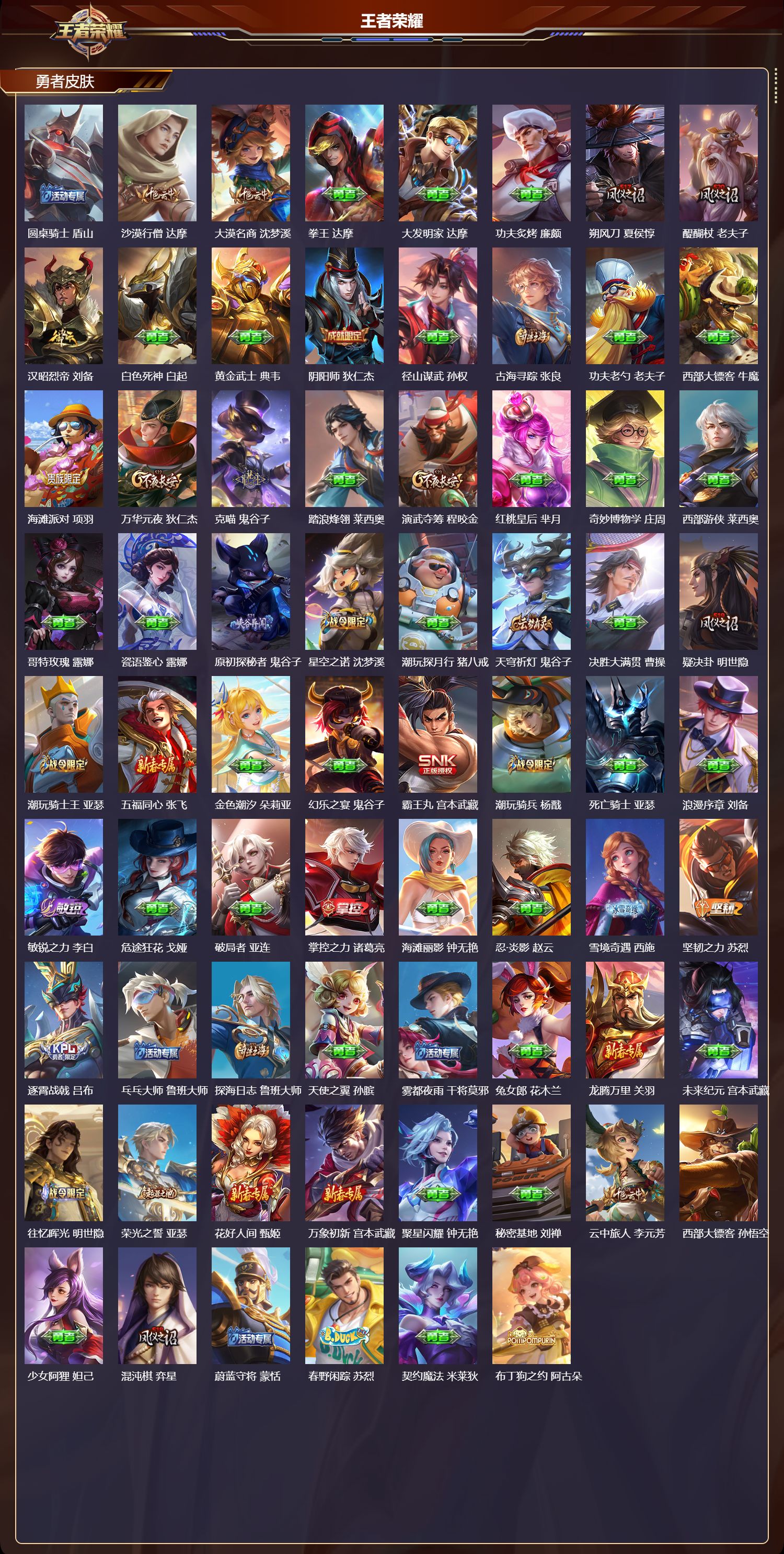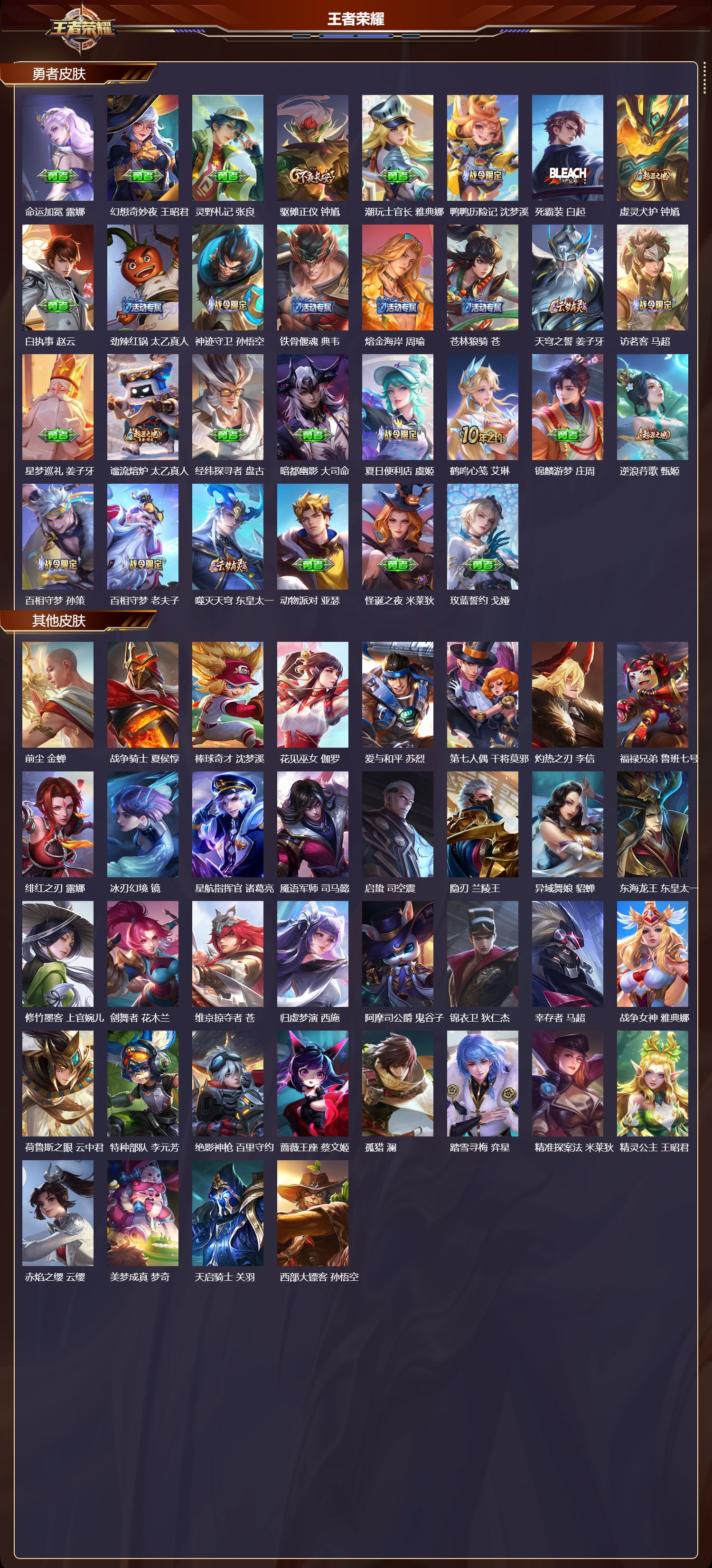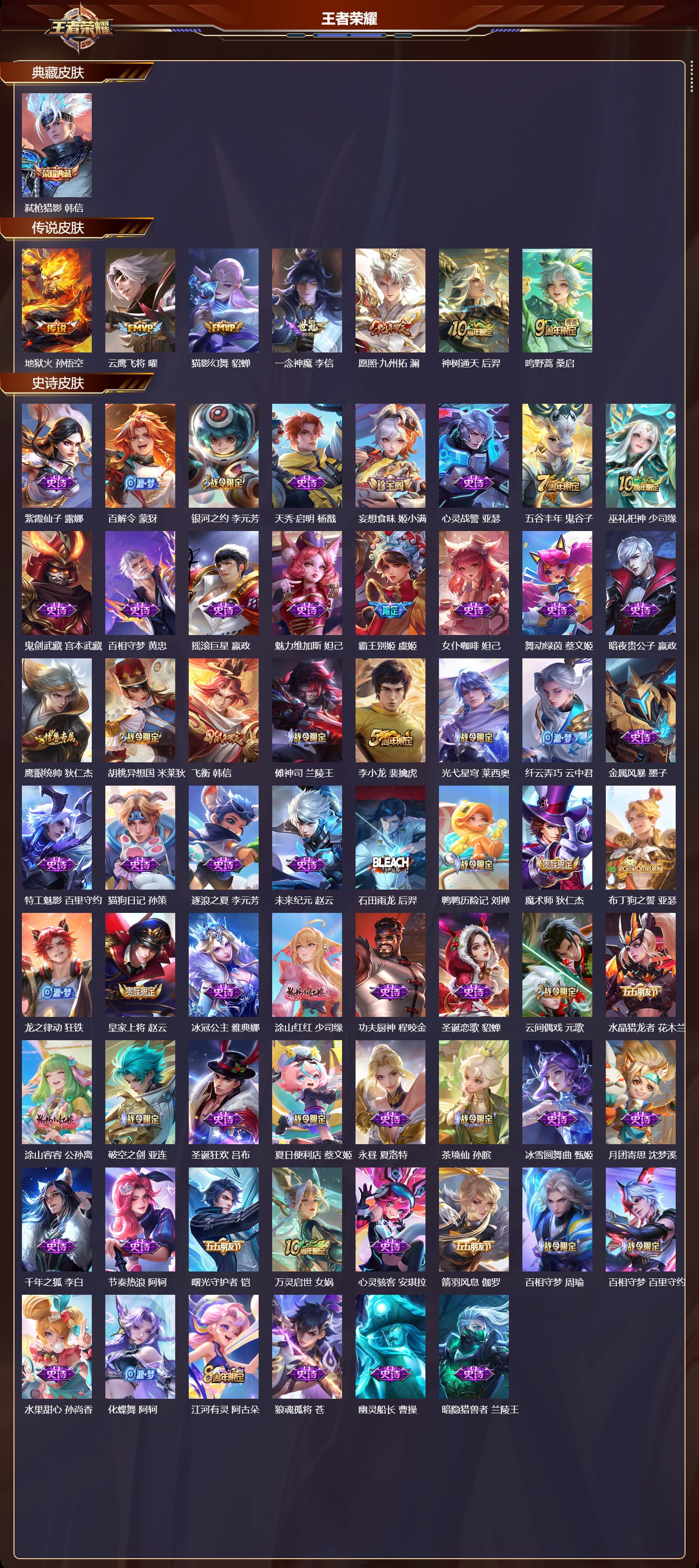 安卓qq/永恒钻石/205皮肤/125英雄/1典藏/0珍品无双/0无双/0珍品传说/7传说/62史诗/9稀有英雄【1 典藏皮肤】弑呛猎影 韩信【7 传说皮肤】地狱火 孙悟空云鹰飞将 曜猫影幻舞 貂蝉一念神魔 李信愿照·九州拓 澜神树通天 后羿鸣野蒿 桑启【62 史诗皮肤】紫霞仙子 露娜百解令 蒙犽银河之约 李元芳天秀·启明 杨戬妄想食味 姬小满心灵战警 亚瑟五谷丰年 鬼