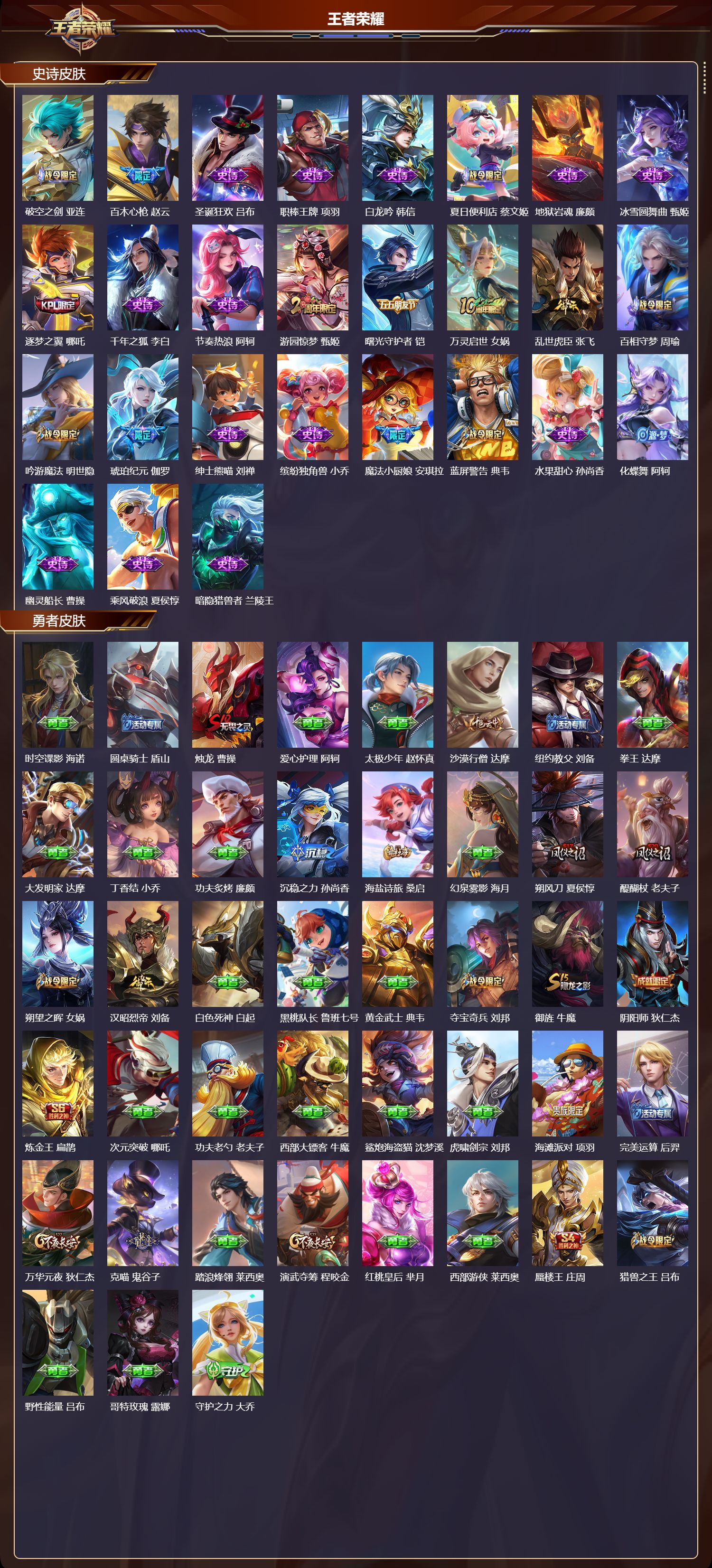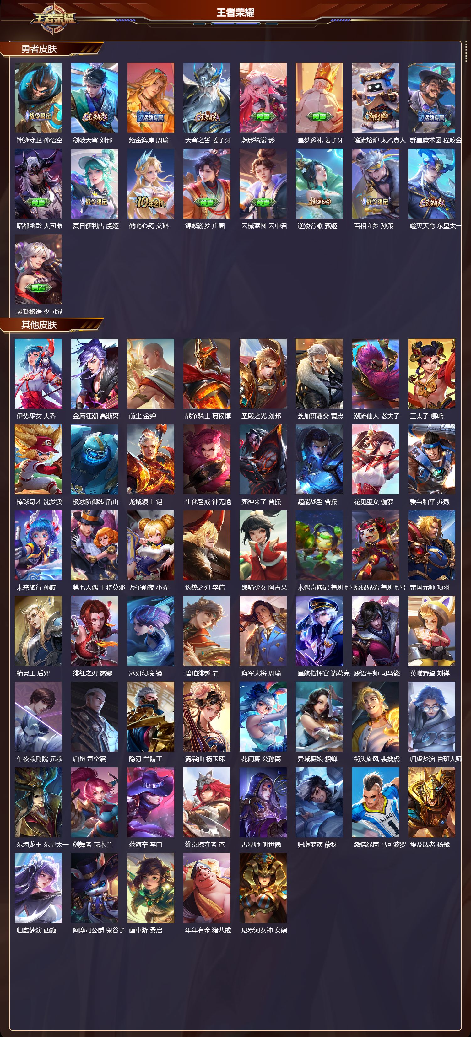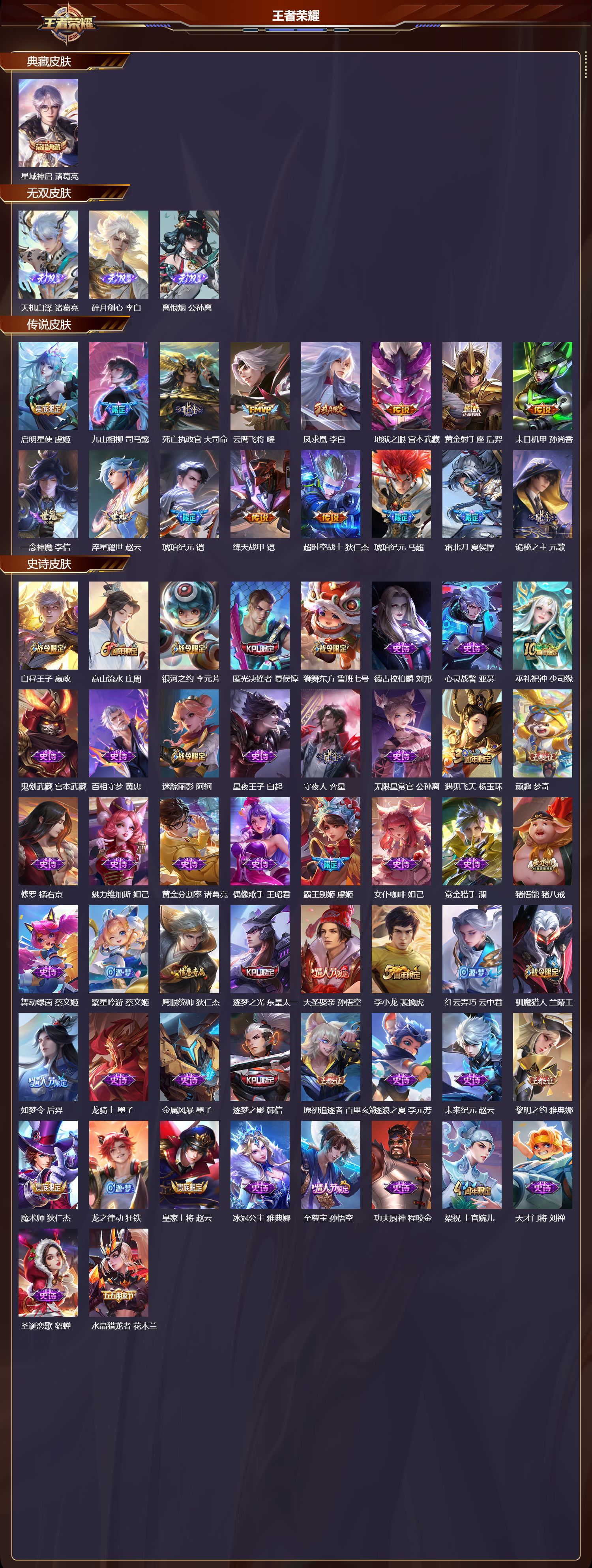 安卓qq/最强王者/303皮肤/125英雄/1典藏/0珍品无双/3无双/0珍品传说/16传说/77史诗/9稀有英雄【1 典藏皮肤】星域神启 诸葛亮【3 无双皮肤】天机白泽 诸葛亮碎月剑心 李白离恨烟 公孙离【16 传说皮肤】启明星使 虞姬九山相柳 司马懿死亡执政官 大司命云鹰飞将 曜凤求凰 李白地狱之眼 宫本武藏黄金射手座 后羿末日机甲 孙尚香一念神魔 李信淬星耀世 赵云