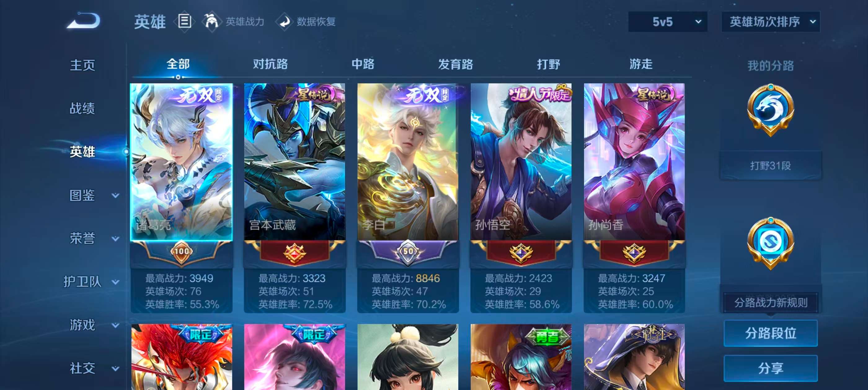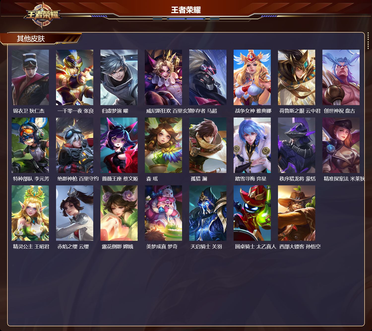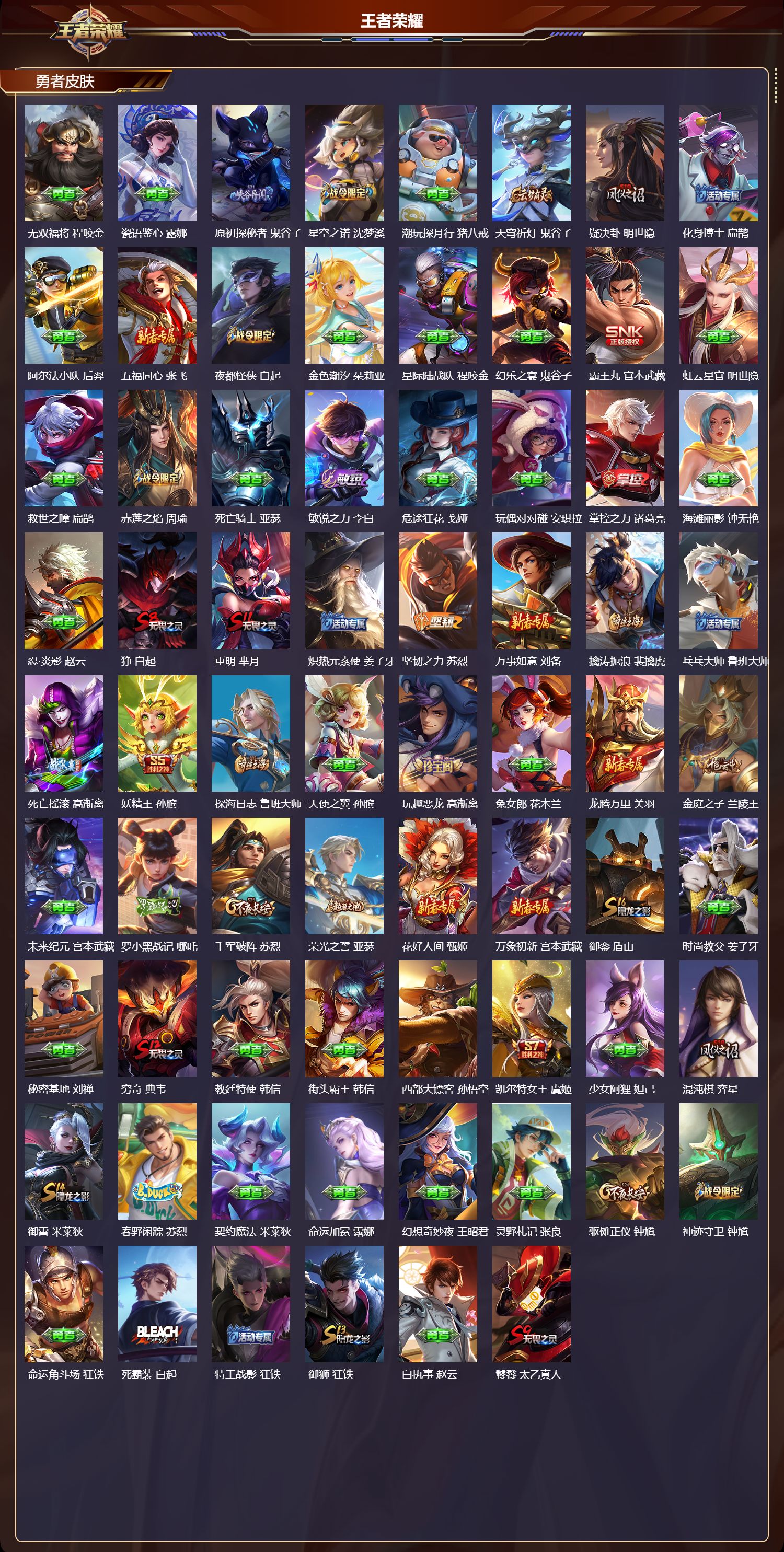 安卓qq/最强王者/303皮肤/125英雄/1典藏/0珍品无双/3无双/0珍品传说/16传说/77史诗/9稀有英雄【1 典藏皮肤】星域神启 诸葛亮【3 无双皮肤】天机白泽 诸葛亮碎月剑心 李白离恨烟 公孙离【16 传说皮肤】启明星使 虞姬九山相柳 司马懿死亡执政官 大司命云鹰飞将 曜凤求凰 李白地狱之眼 宫本武藏黄金射手座 后羿末日机甲 孙尚香一念神魔 李信淬星耀世 赵云