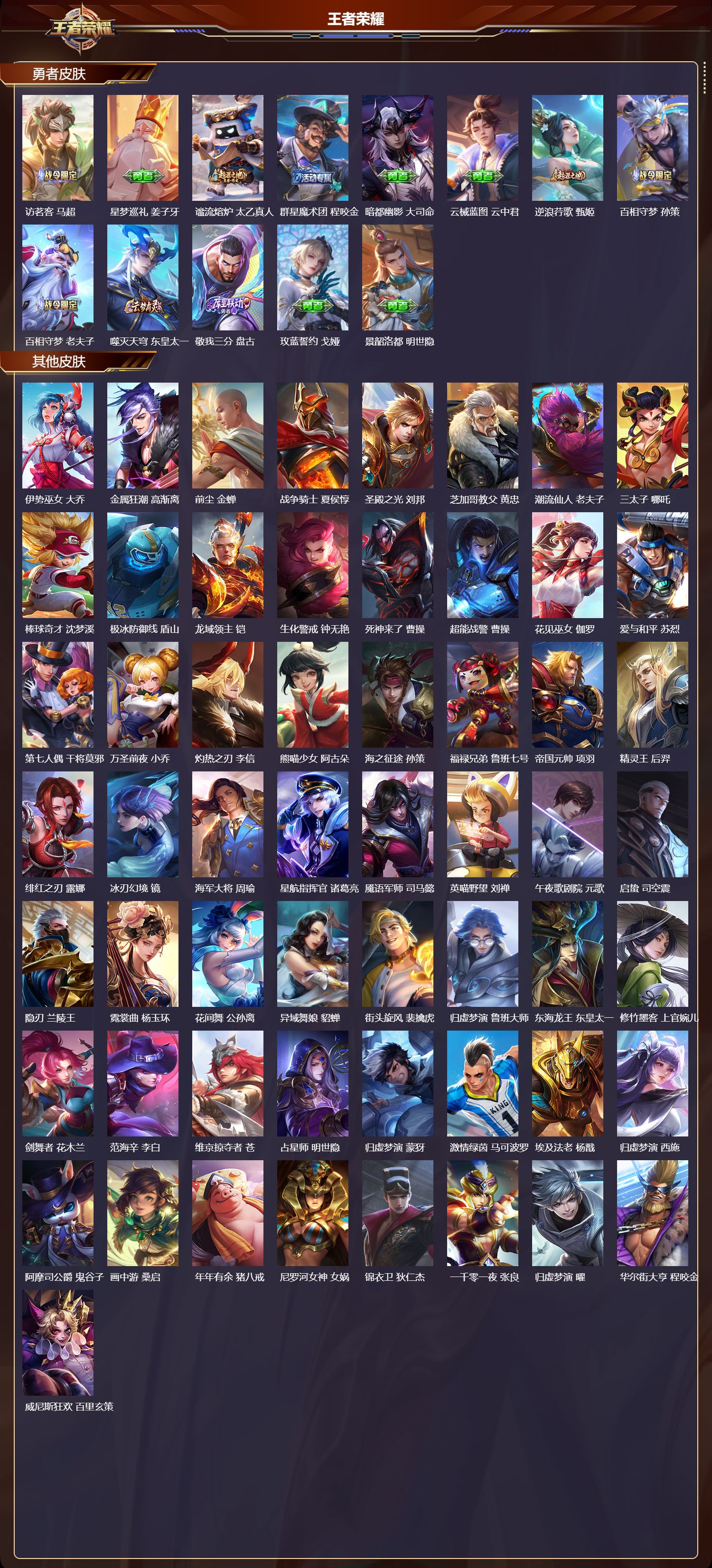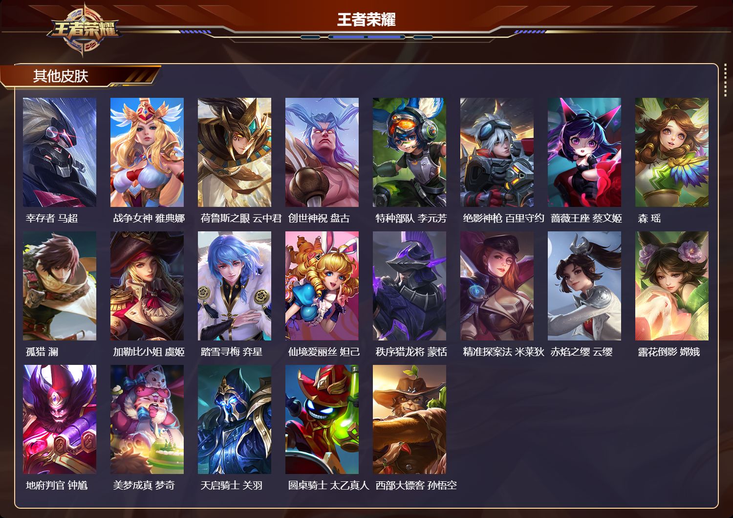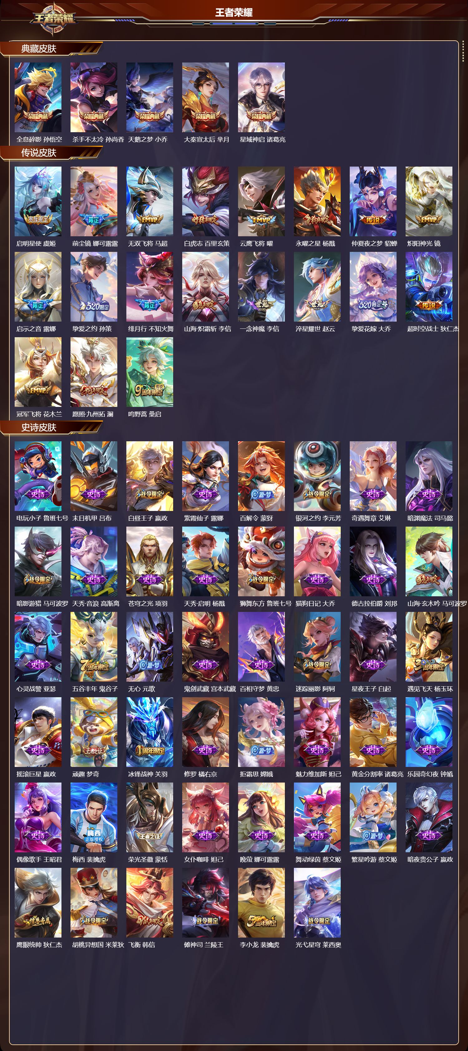 苹果qq/非凡王者/372皮肤/125英雄/5典藏/0珍品无双/0无双/0珍品传说/19传说/102史诗/9稀有英雄【5 典藏皮肤】全息碎影 孙悟空杀手不太冷 孙尚香天鹅之梦 小乔大秦宣太后 芈月星域神启 诸葛亮【19 传说皮肤】启明星使 虞姬前尘镜 娜可露露无双飞将 马超白虎志 百里玄策云鹰飞将 曜永曜之星 杨戬仲夏夜之梦 貂蝉炽阳神光 镜启示之音