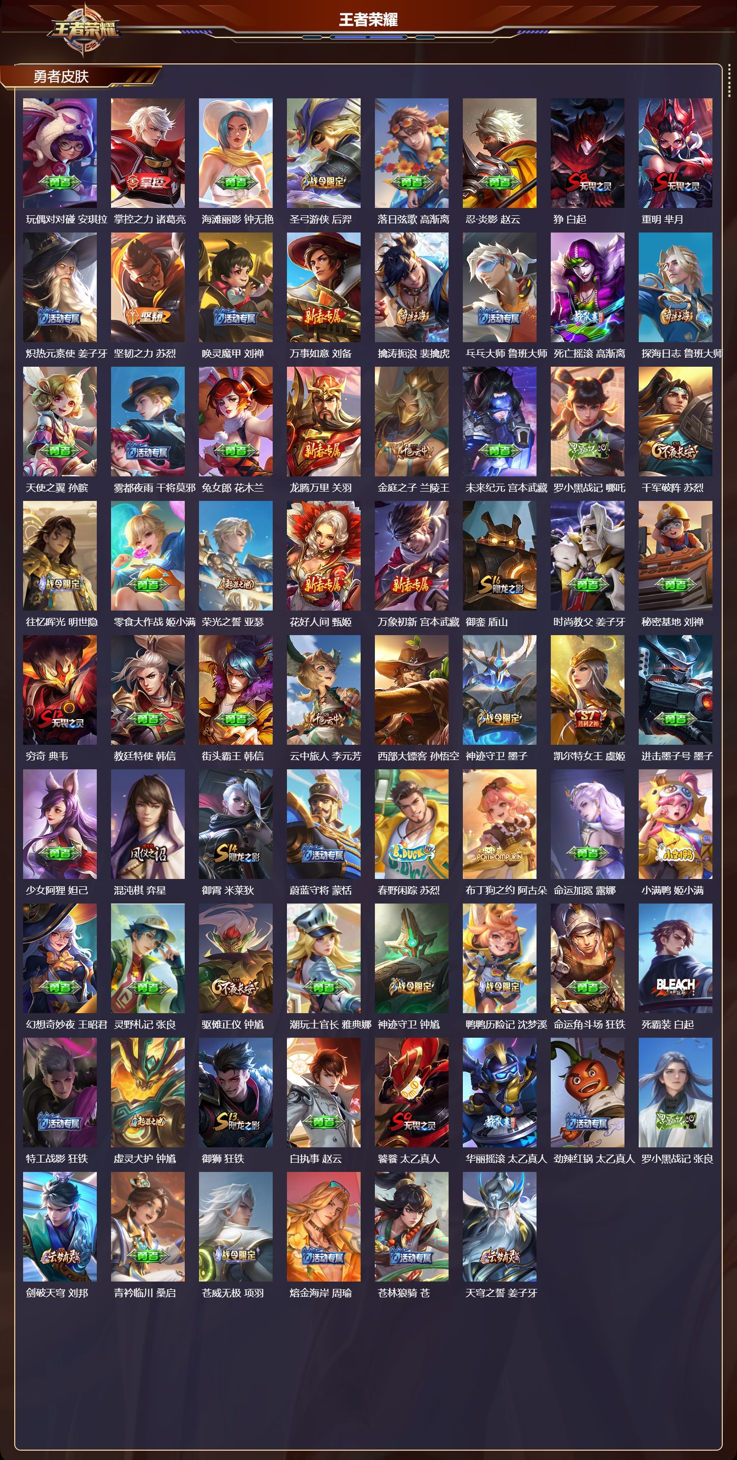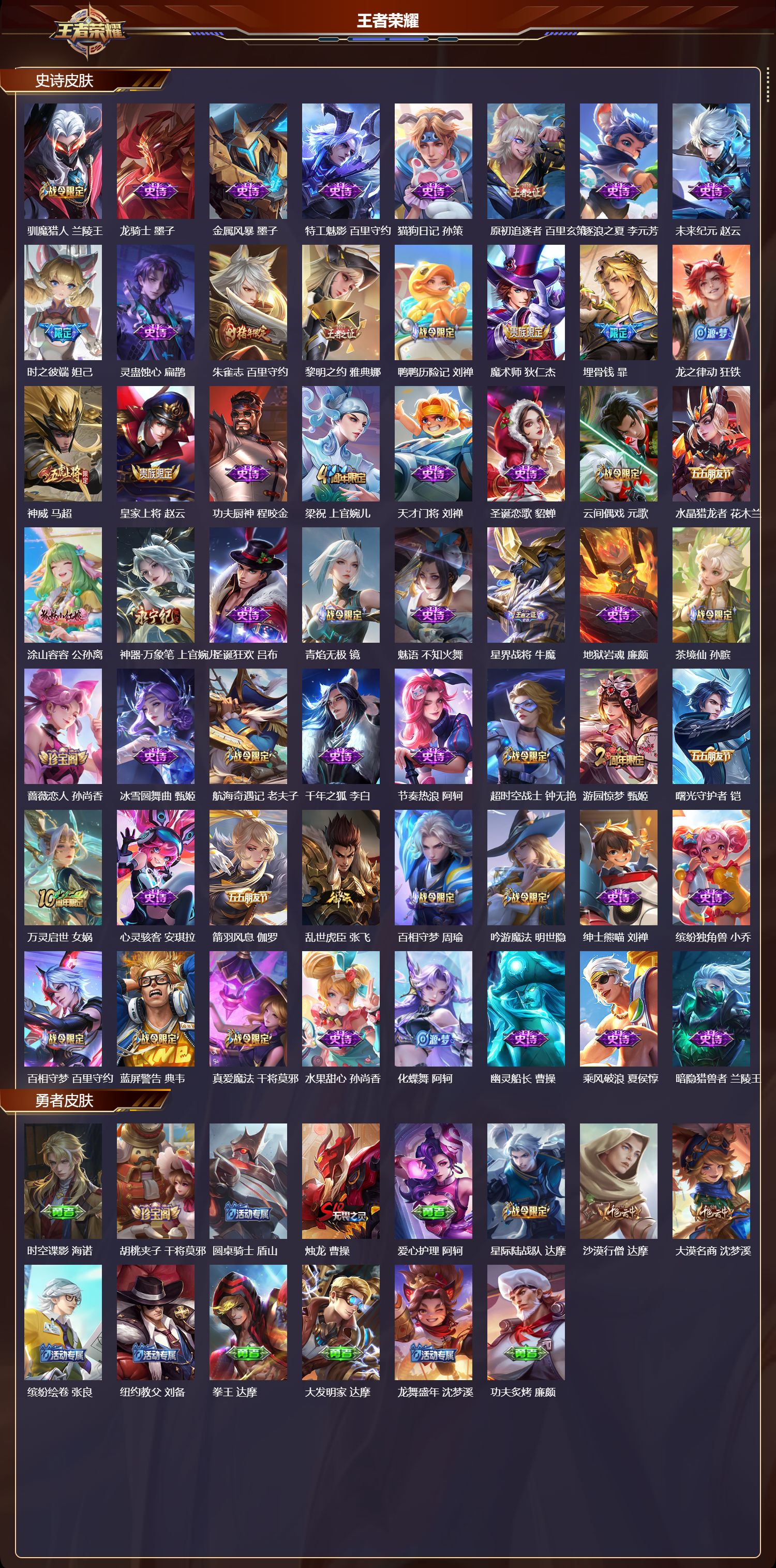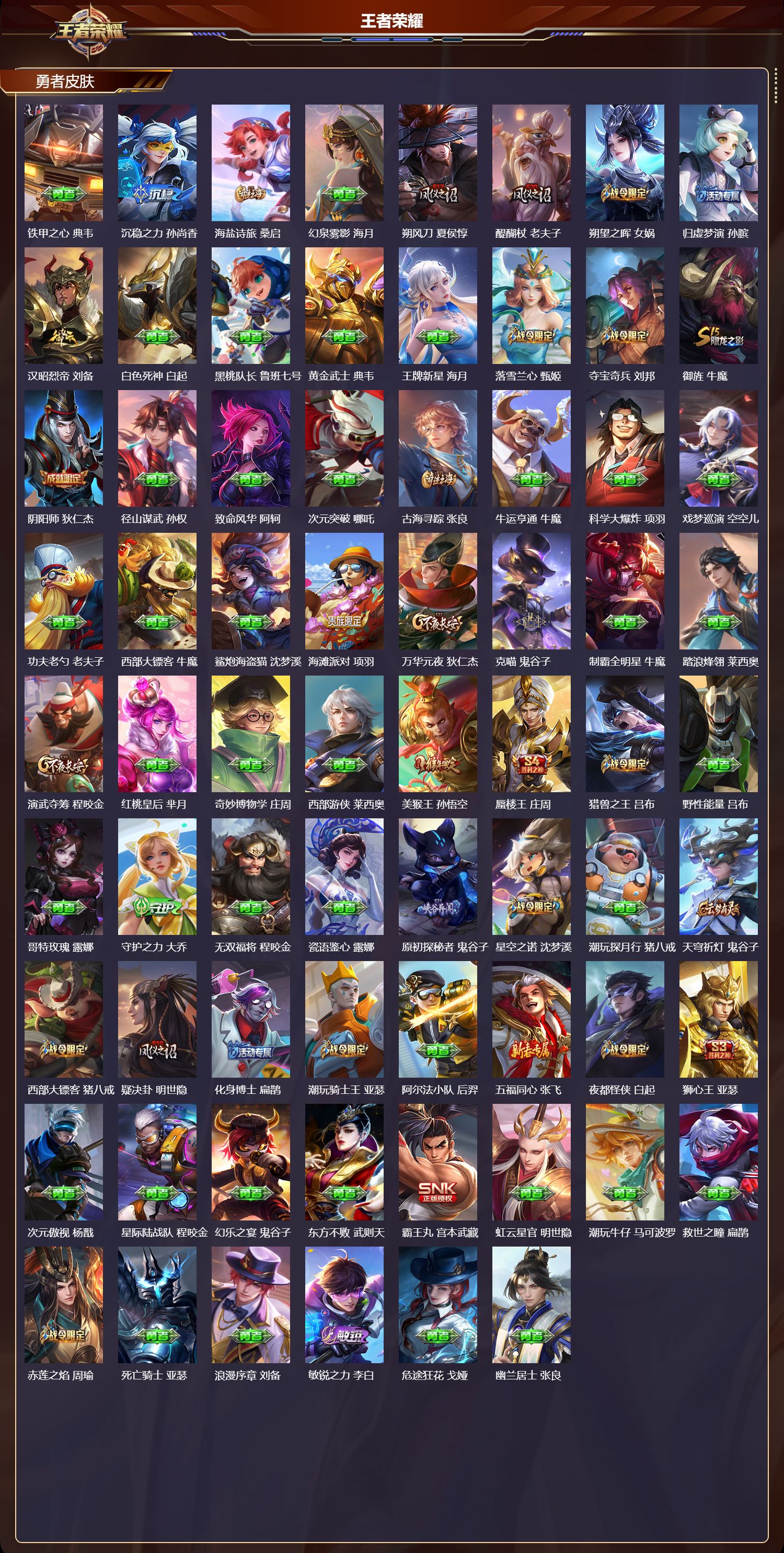 苹果qq/非凡王者/372皮肤/125英雄/5典藏/0珍品无双/0无双/0珍品传说/19传说/102史诗/9稀有英雄【5 典藏皮肤】全息碎影 孙悟空杀手不太冷 孙尚香天鹅之梦 小乔大秦宣太后 芈月星域神启 诸葛亮【19 传说皮肤】启明星使 虞姬前尘镜 娜可露露无双飞将 马超白虎志 百里玄策云鹰飞将 曜永曜之星 杨戬仲夏夜之梦 貂蝉炽阳神光 镜启示之音
