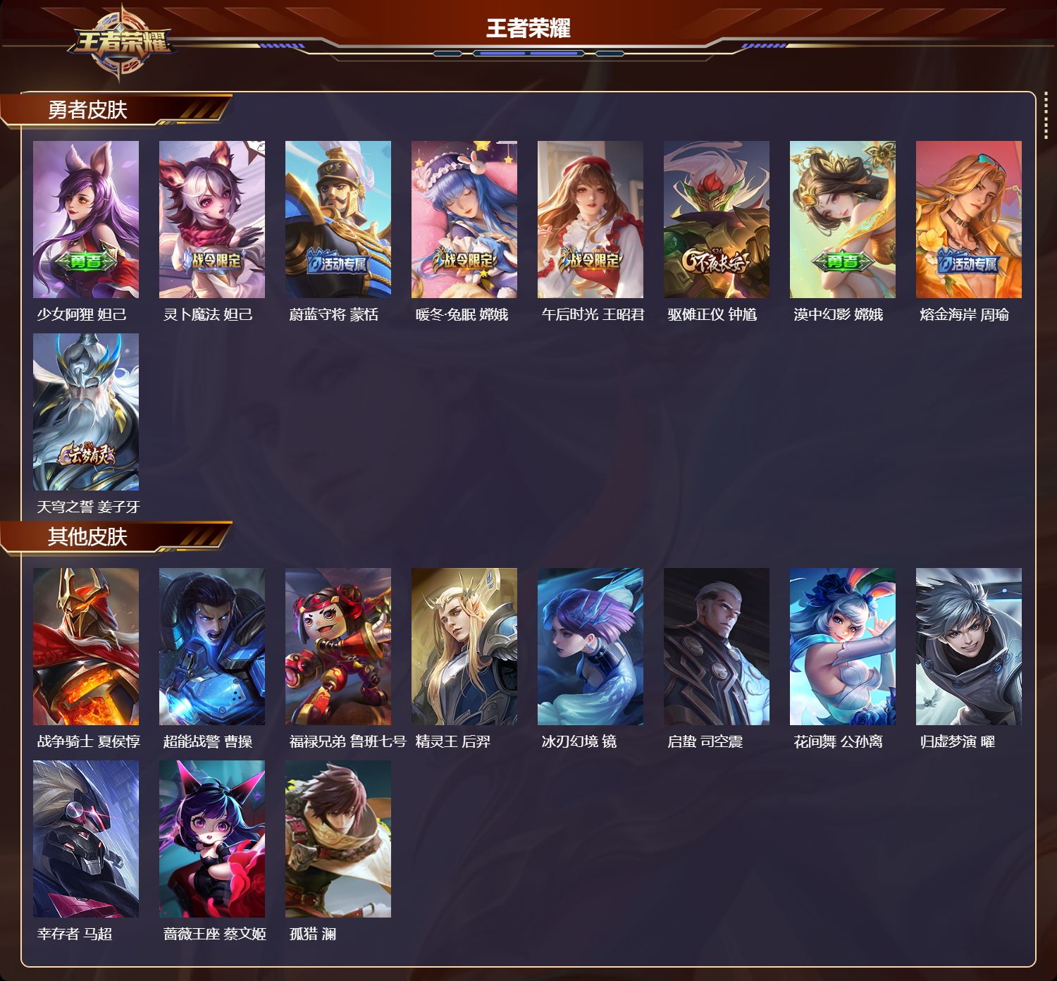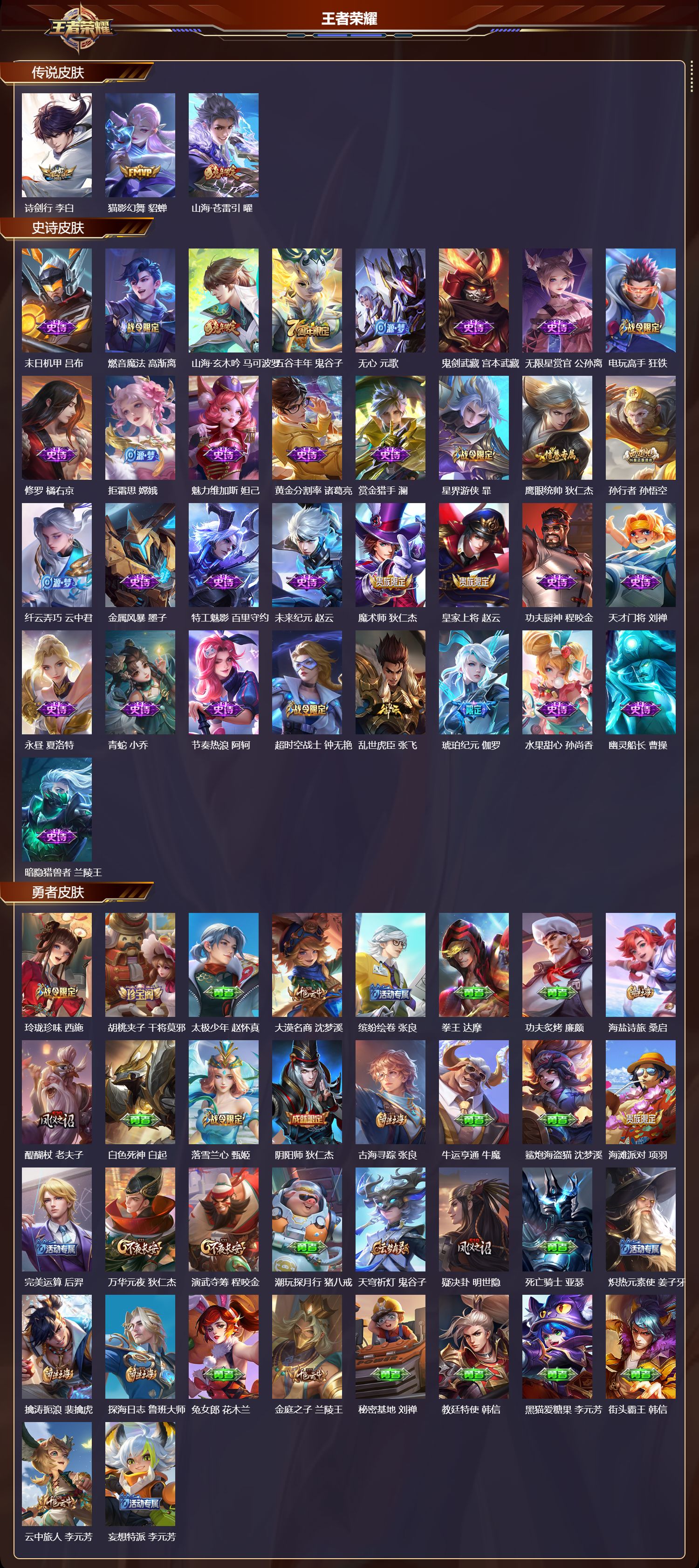 安卓qq/至尊星耀/90皮肤/110英雄/0典藏/0珍品无双/0无双/0珍品传说/3传说/33史诗/7稀有英雄【3 传说皮肤】诗剑行 李白猫影幻舞 貂蝉山海·苍雷引 曜【33 史诗皮肤】末日机甲 吕布燃音魔法 高渐离山海·玄木吟 马可波罗五谷丰年 鬼谷子无心 元歌鬼剑武藏 宫本武藏无限星赏官 公孙离电玩高手 狂铁修罗 橘右京拒霜思 嫦娥魅力维加斯 妲己