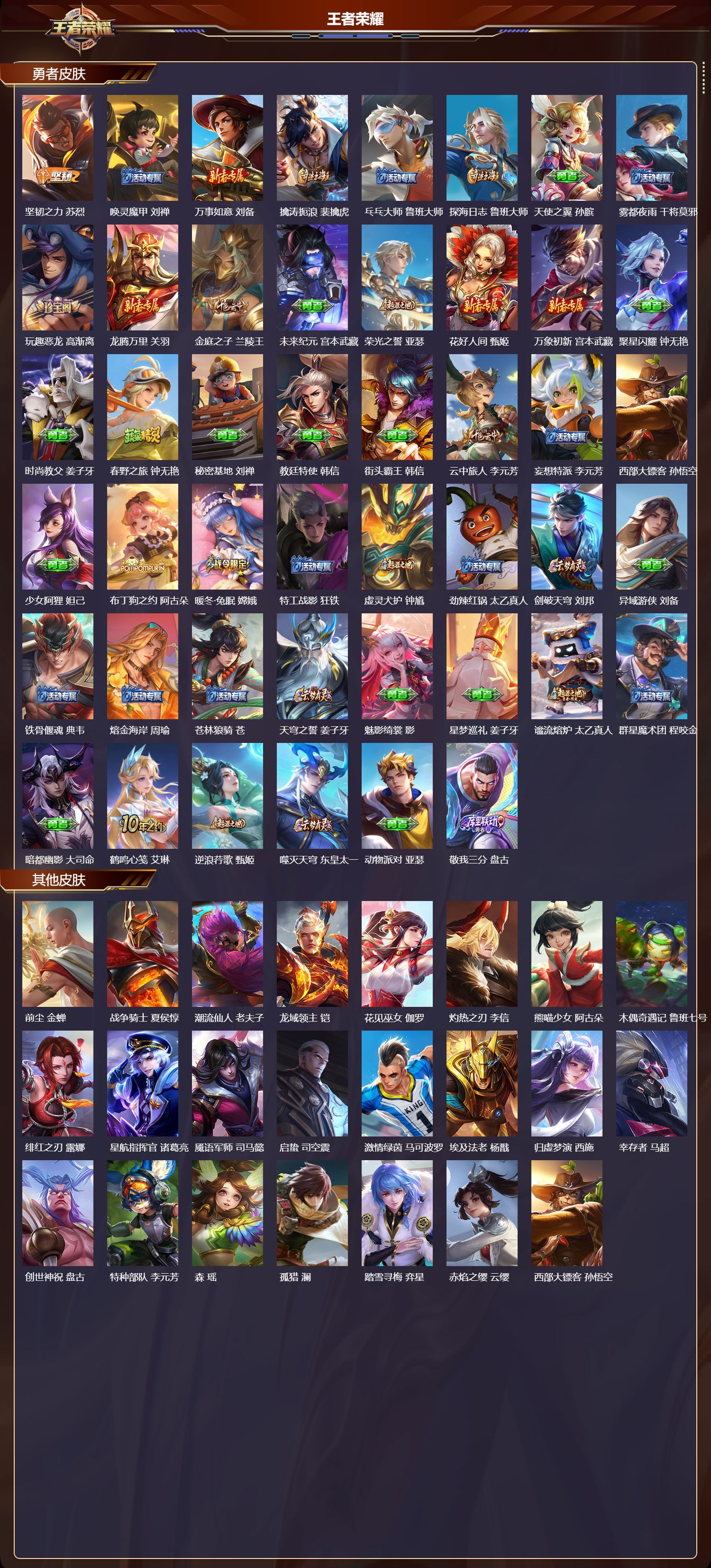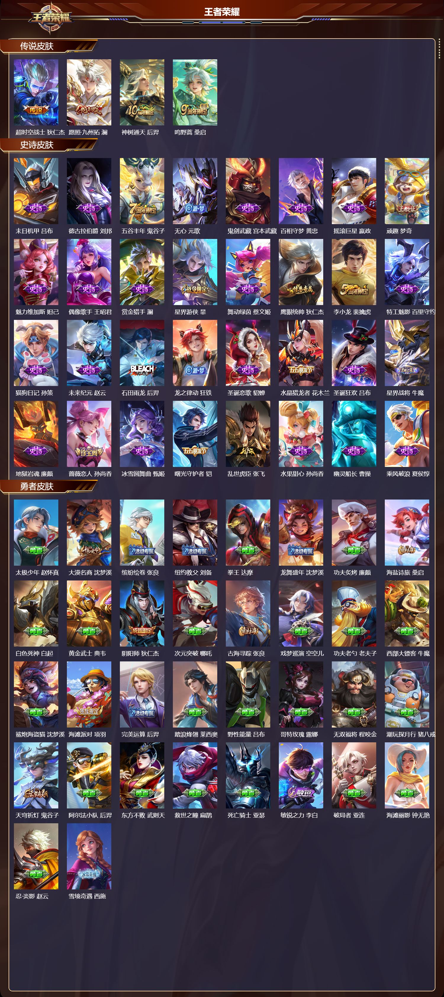 安卓qq/绝世王者/138皮肤/123英雄/0典藏/0珍品无双/0无双/0珍品传说/4传说/32史诗/7稀有英雄【4 传说皮肤】超时空战士 狄仁杰愿照·九州拓 澜神树通天 后羿鸣野蒿 桑启【32 史诗皮肤】末日机甲 吕布德古拉伯爵 刘邦五谷丰年 鬼谷子无心 元歌鬼剑武藏 宫本武藏百相守梦 黄忠摇滚巨星 嬴政顽趣 梦奇魅力维加斯 妲己偶像歌手 王昭君赏金猎手 澜星界游侠