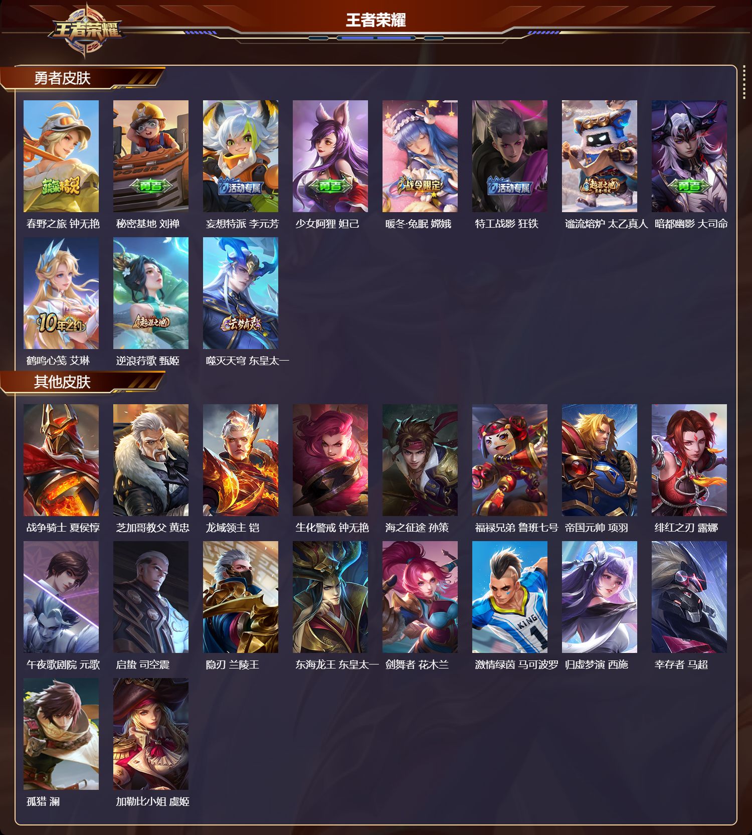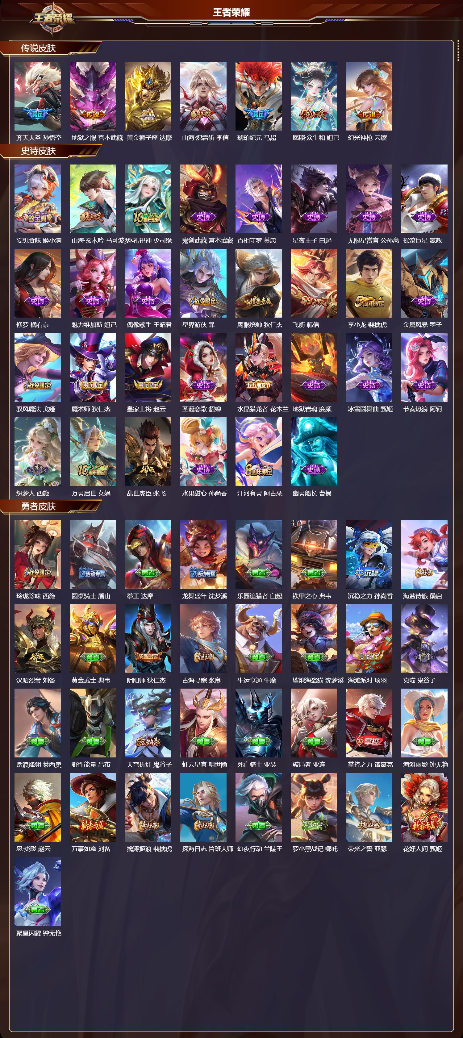 安卓qq/非凡王者/99皮肤/123英雄/0典藏/0珍品无双/0无双/0珍品传说/7传说/30史诗/8稀有英雄【7 传说皮肤】齐天大圣 孙悟空地狱之眼 宫本武藏黄金狮子座 达摩山海·炽霜斩 李信琥珀纪元 马超愿照·众生和 妲己幻光神呛 云缨【30 史诗皮肤】妄想食味 姬小满山海·玄木吟 马可波罗巫礼祀神 少司缘鬼剑武藏 宫本武藏百相守梦 黄忠星夜王子 白起无限星赏官 公孙