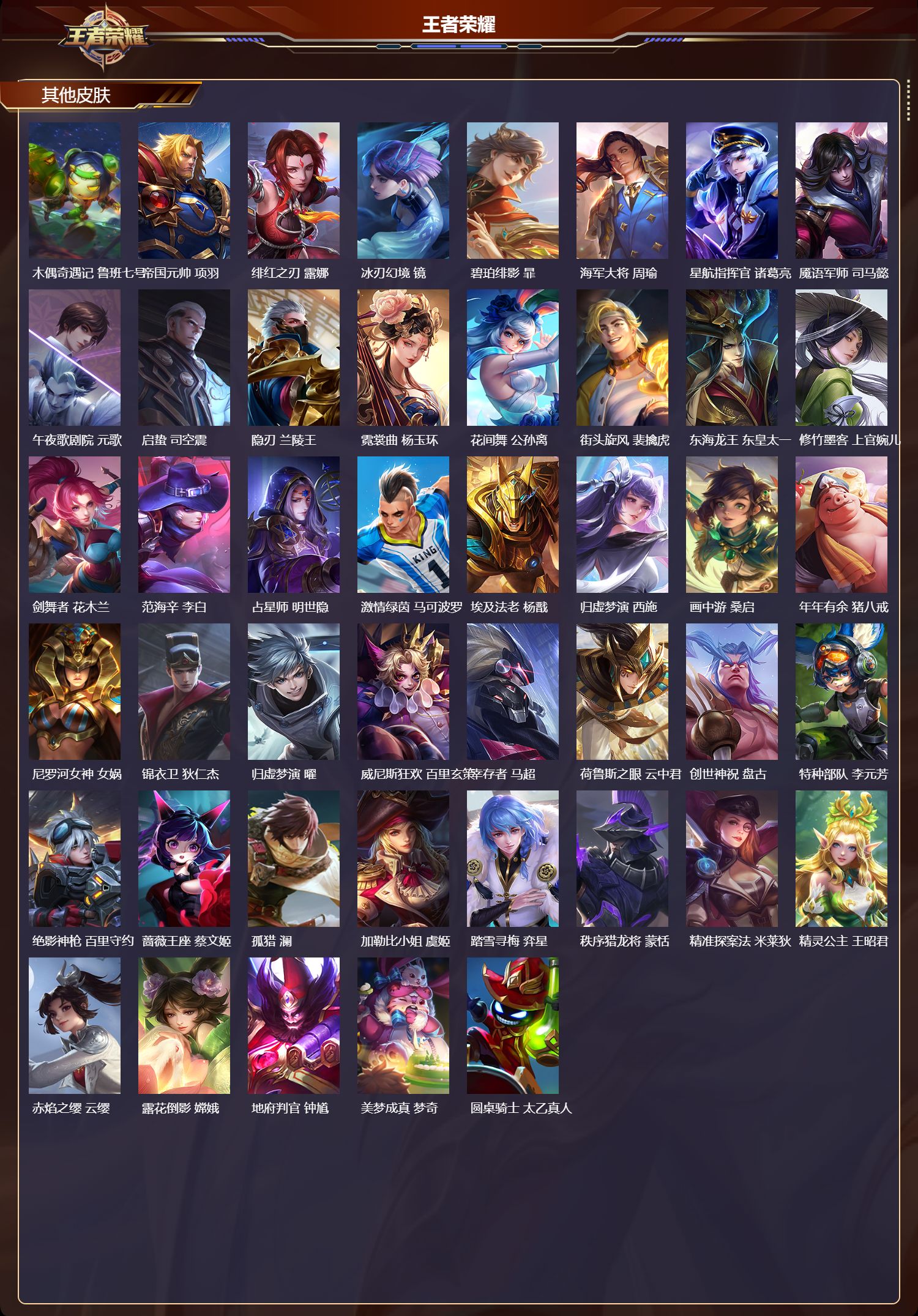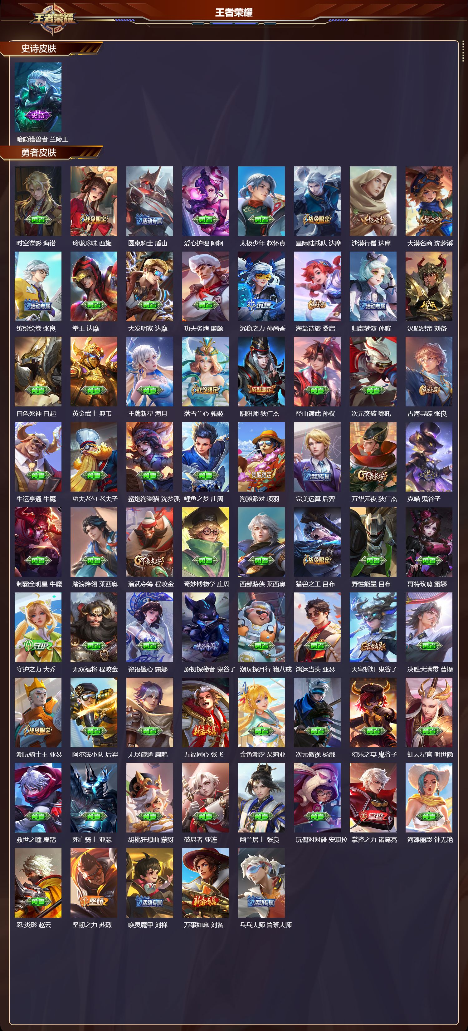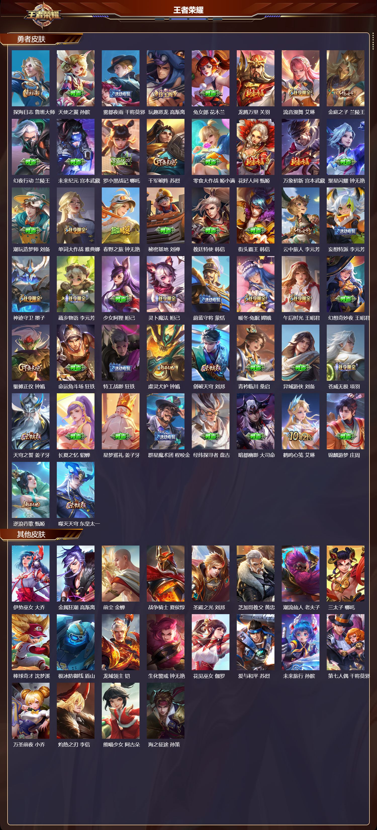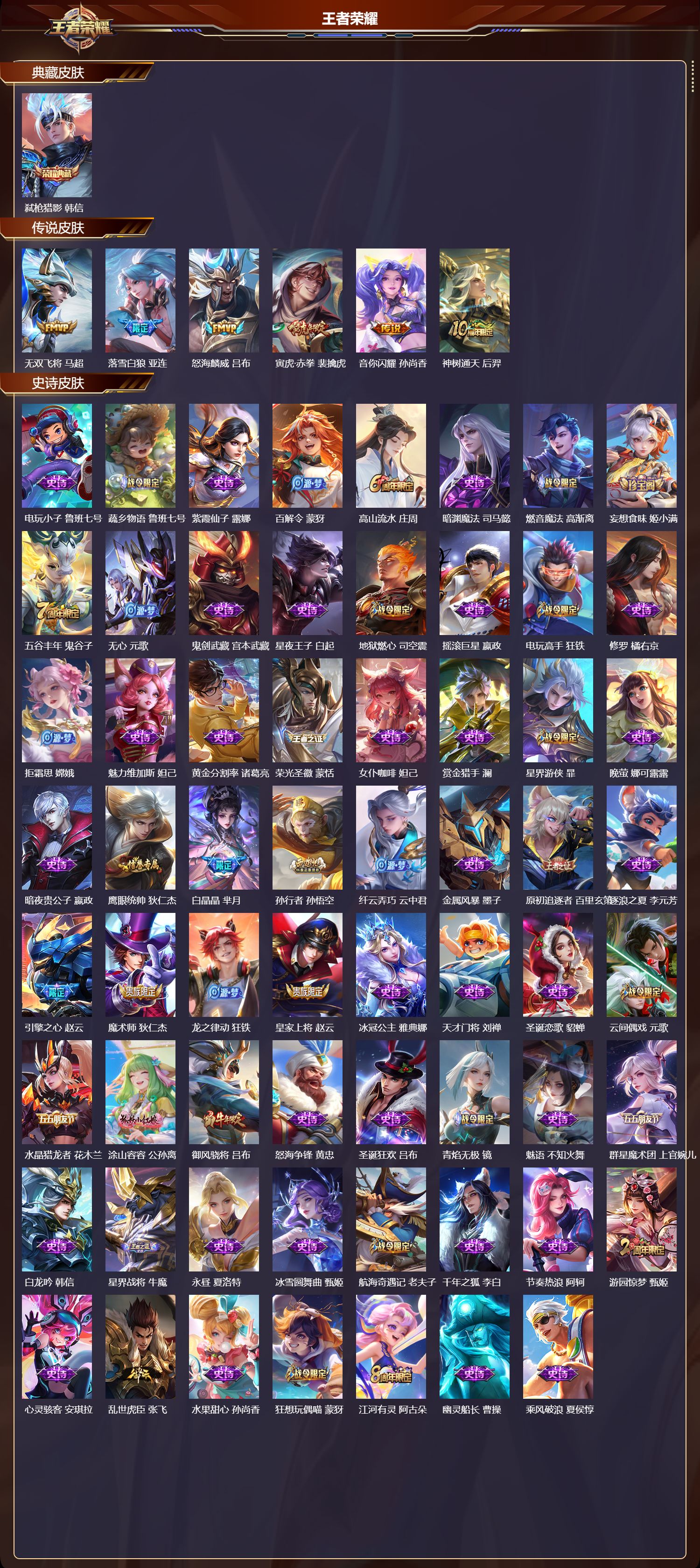 苹果qq/至尊星耀/256皮肤/125英雄/1典藏/0珍品无双/0无双/0珍品传说/6传说/64史诗/9稀有英雄【1 典藏皮肤】弑呛猎影 韩信【6 传说皮肤】无双飞将 马超落雪白狼 亚连怒海麟威 吕布寅虎·赤拳 裴擒虎音你闪耀 孙尚香神树通天 后羿【64 史诗皮肤】电玩小子 鲁班七号蔬乡物语 鲁班七号紫霞仙子 露娜百解令 蒙犽高山流水 庄周暗渊魔法 司马